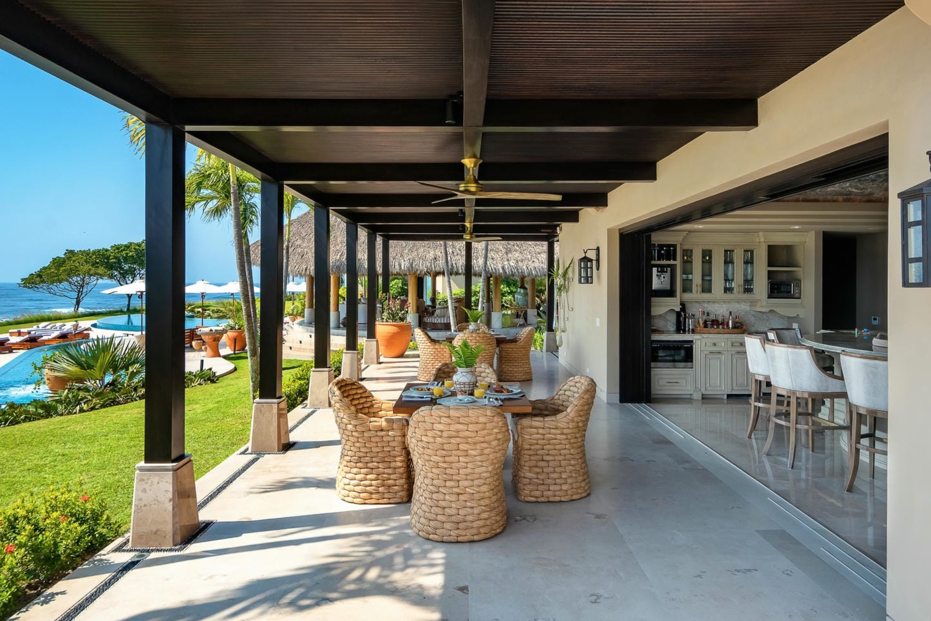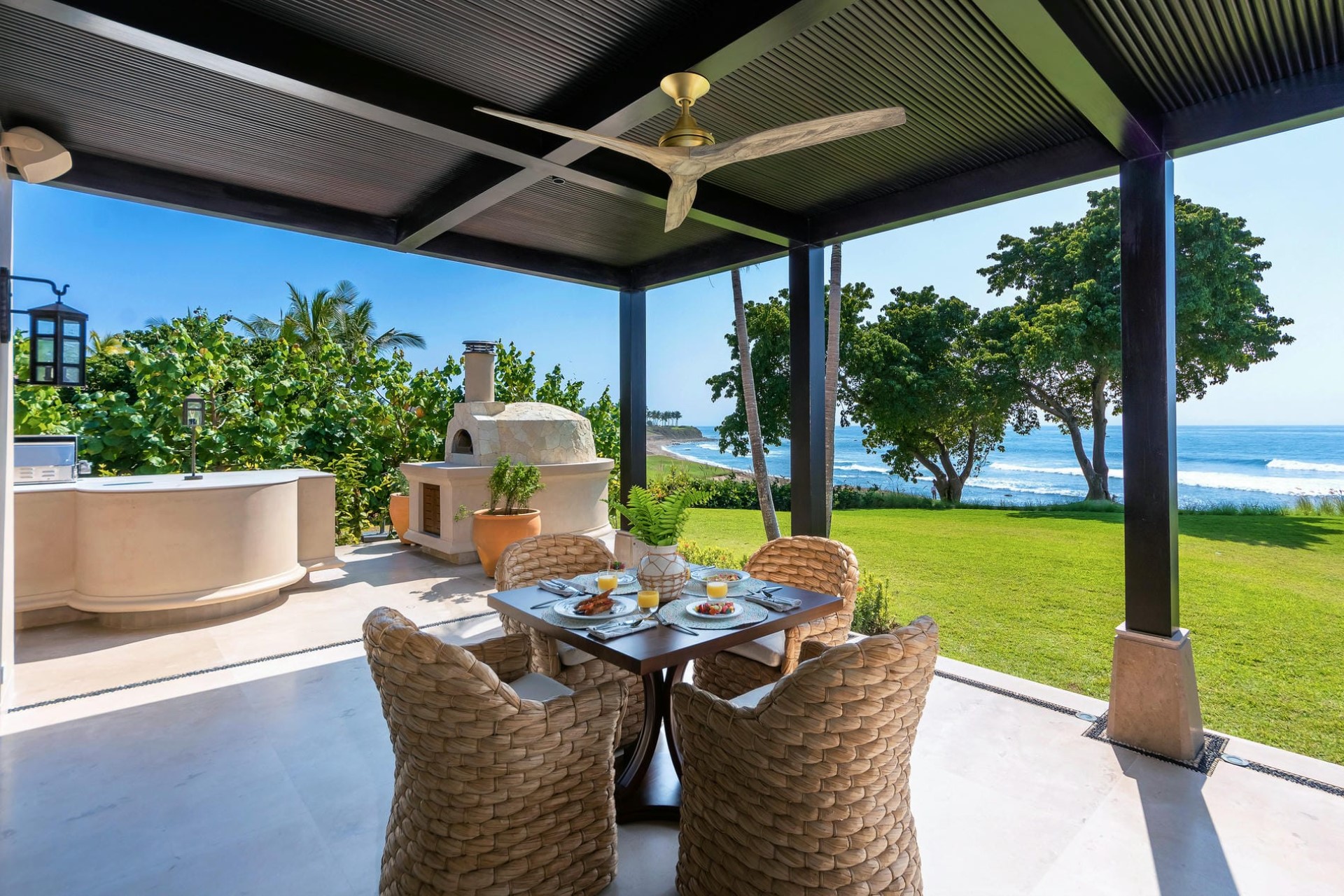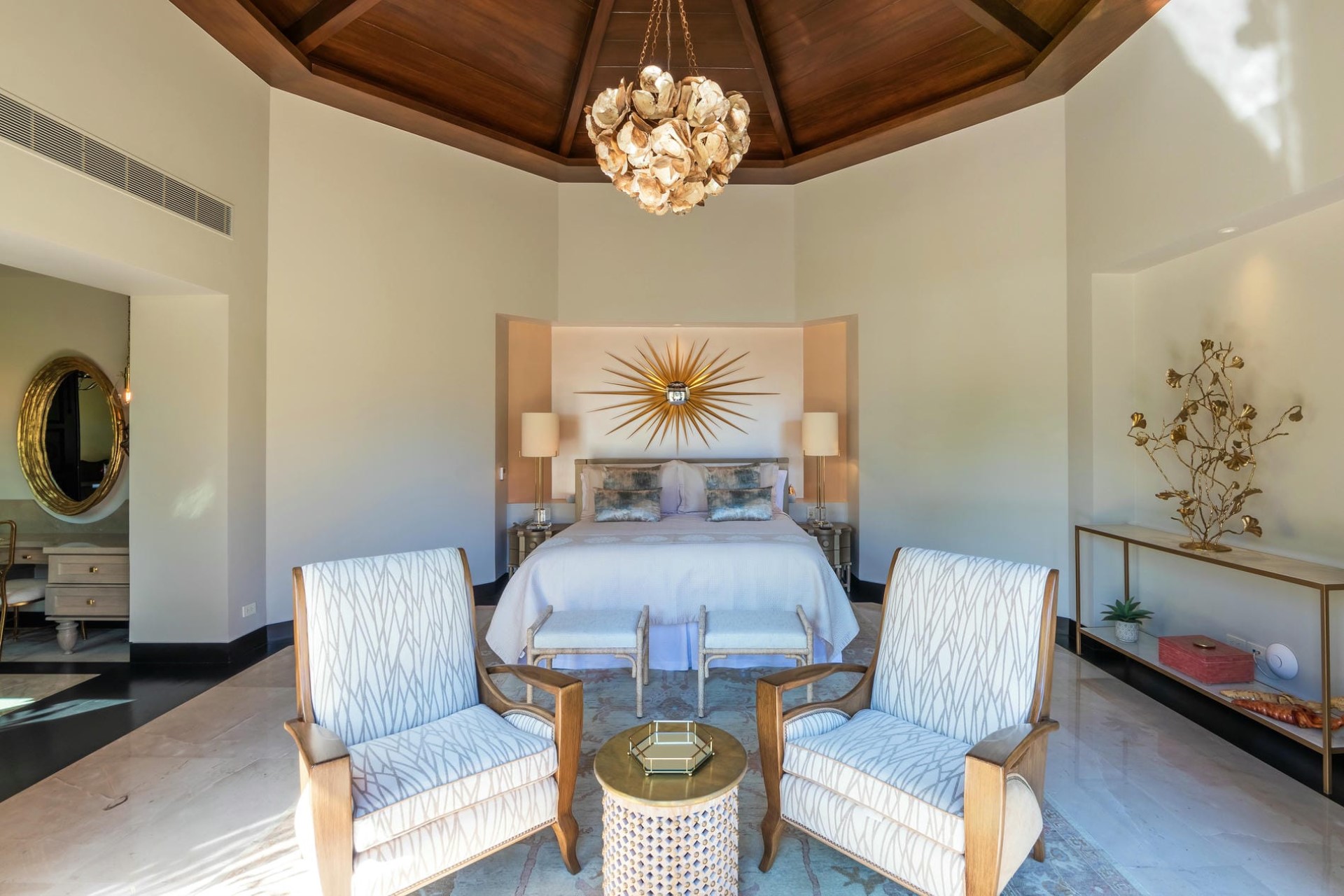 This impressive 24,700-square-foot oceanfront oasis provides ample space for relaxation and socialising with loved ones. At the heart of the villa is the vast outdoor palapa, which connects the separate structures of the estate via wooden walkways. Crafted by local artisans, this traditional palapa features a semi-circle of plush lounges, oversized chairs, games tables, and a beautiful wooden dining table overlooking the pool and the ocean beyond. With free-flowing ocean breezes and stunning views, it’s the perfect place to enjoy casual brunches, sunset cocktails, or elegant dinner parties.