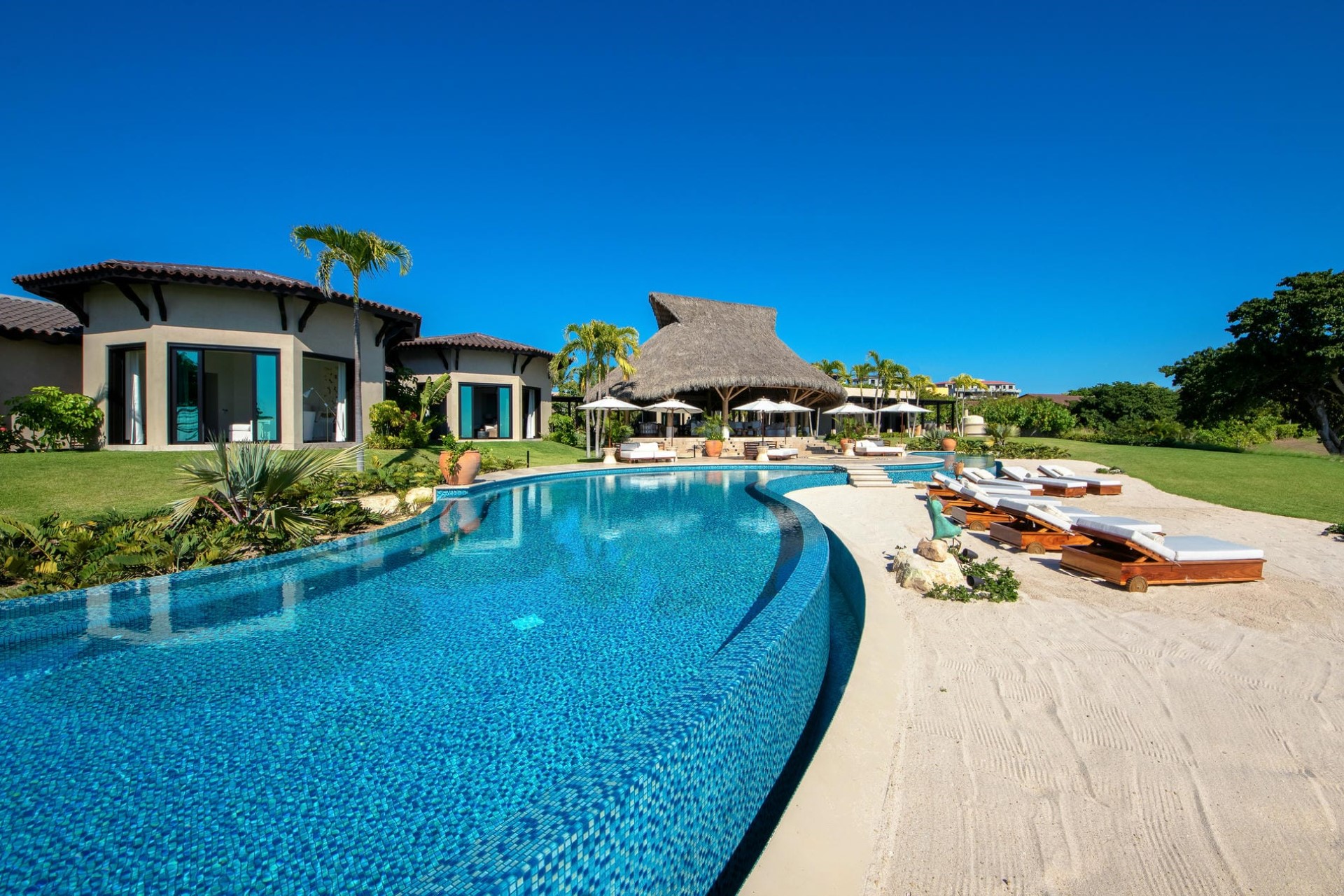 In front of the palapa lies the villa’s highlight – a curved, glass-tile infinity pool. This design masterpiece features a large Jacuzzi at one end, a poolside deck with umbrella-shaded daybeds, and a stepping-stone bridge leading to a sandy embankment decked out with sun loungers.