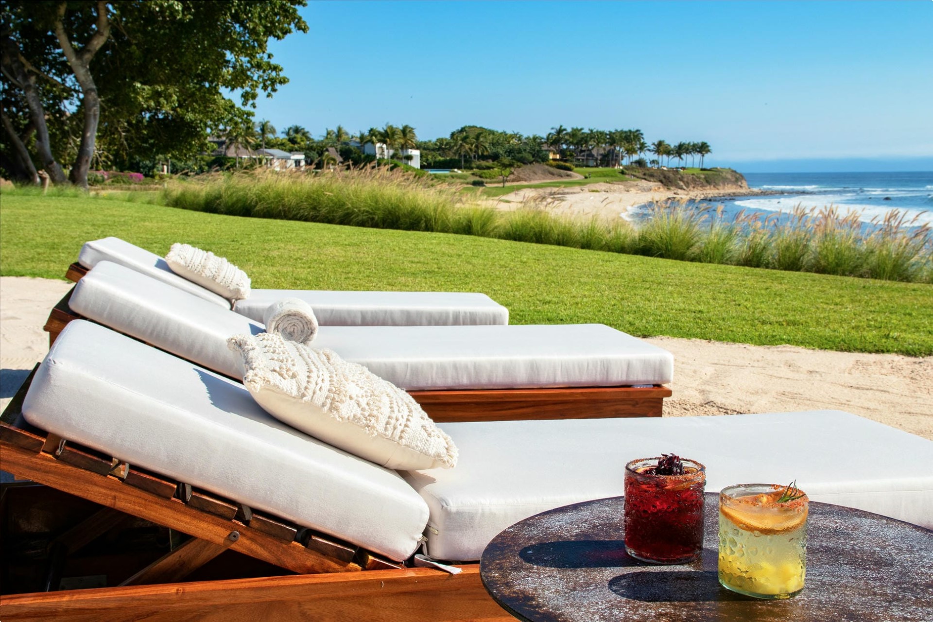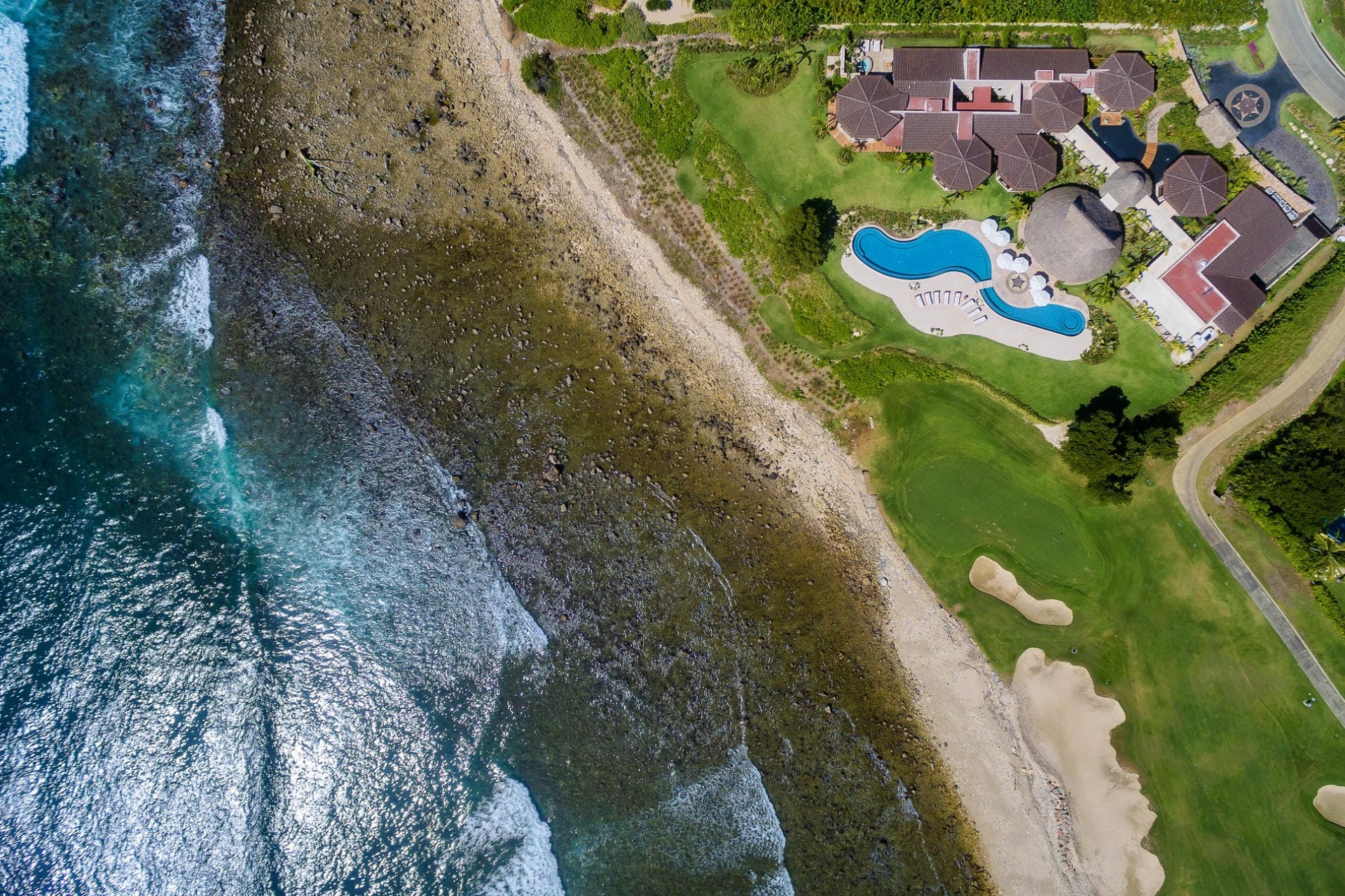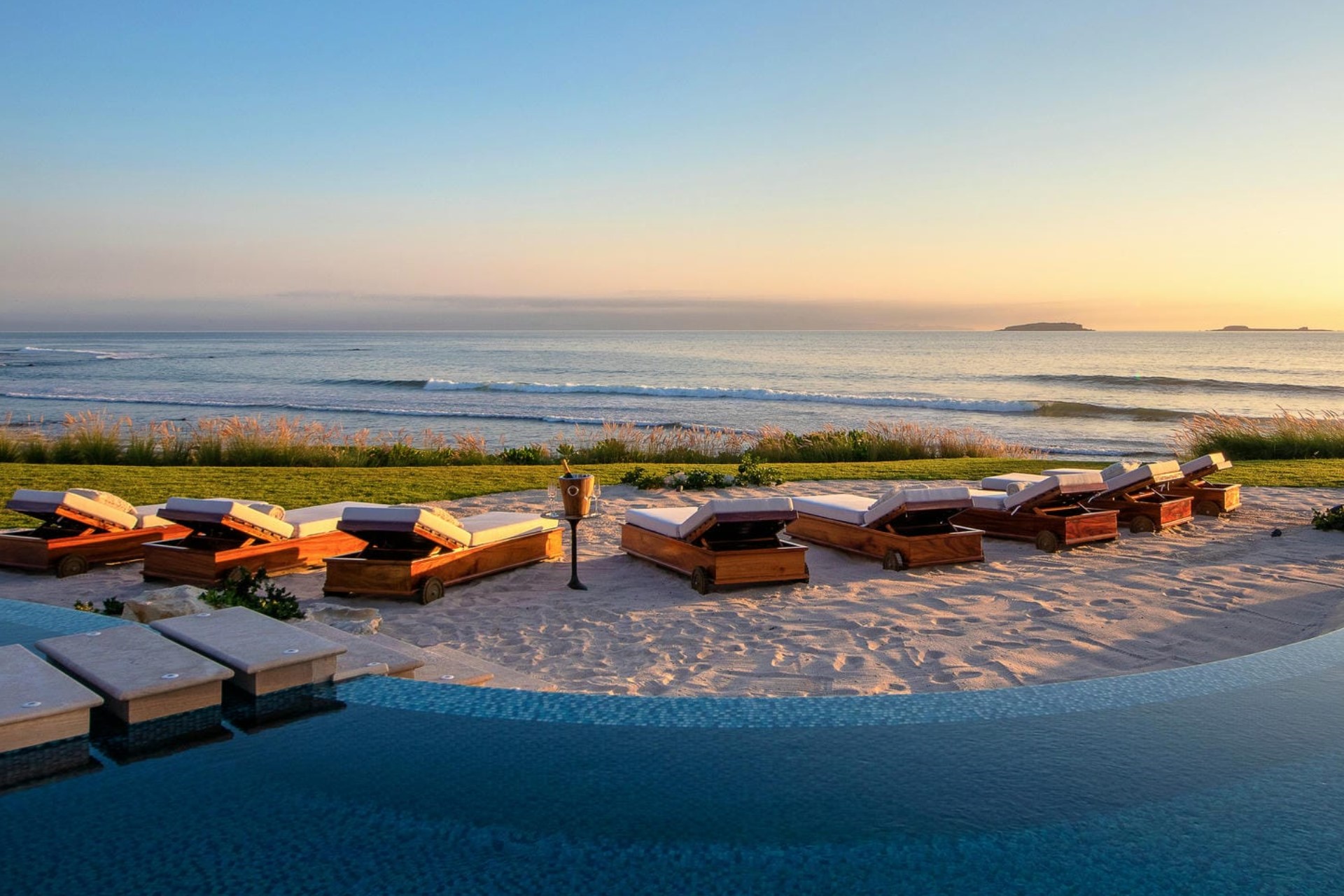 Lush lawns lead down from the pool to a rocky stretch of beach just steps away, offering guests easy access to some of the region’s most renowned surf breaks.