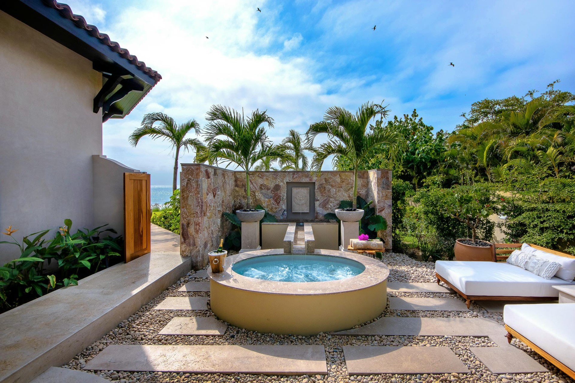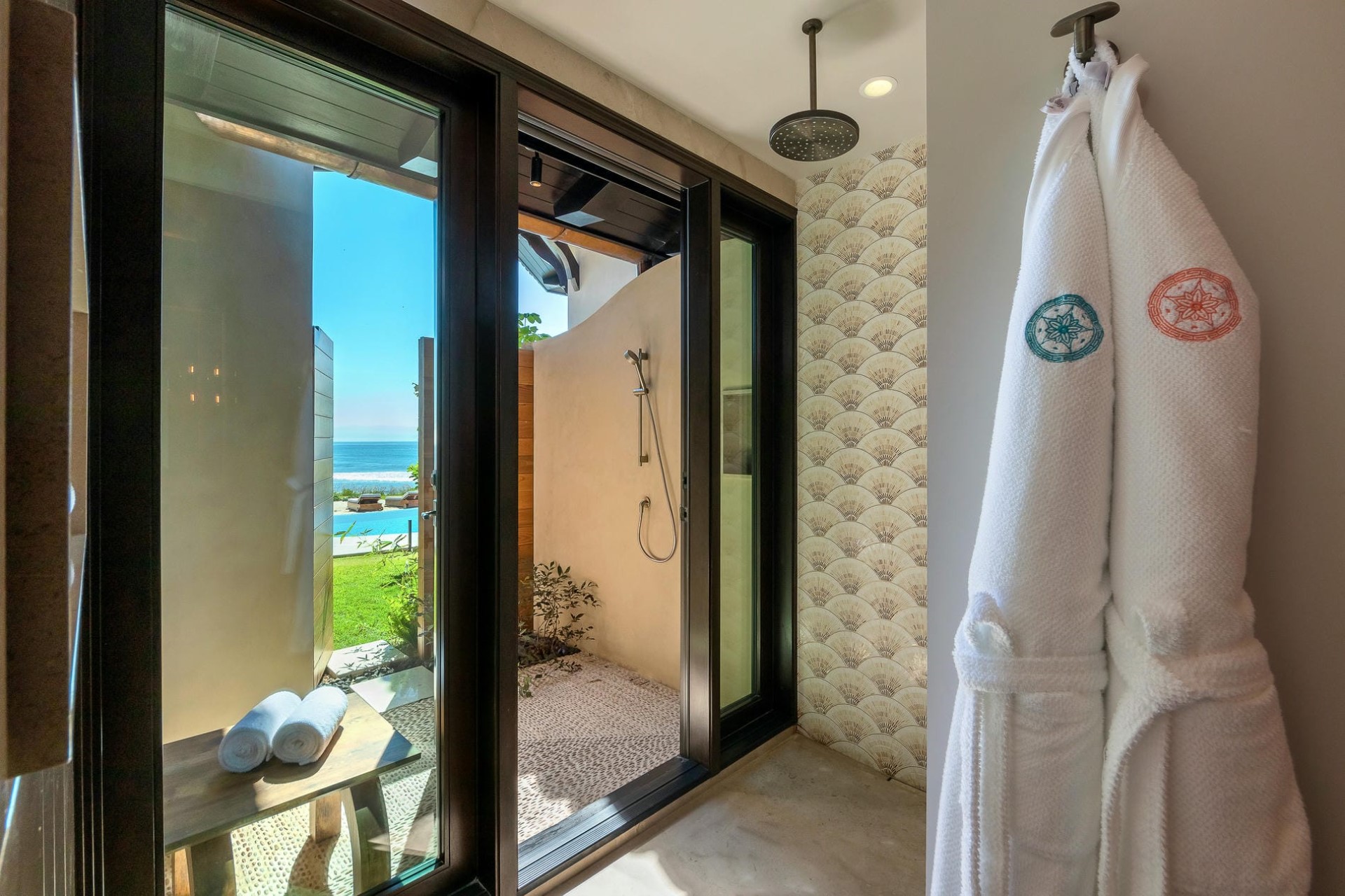 Suite Pacifico – king-size bed, sitting area, powder room, en-suite bathroom with dual vanity & shower + outdoor shower, garden access, and ocean views