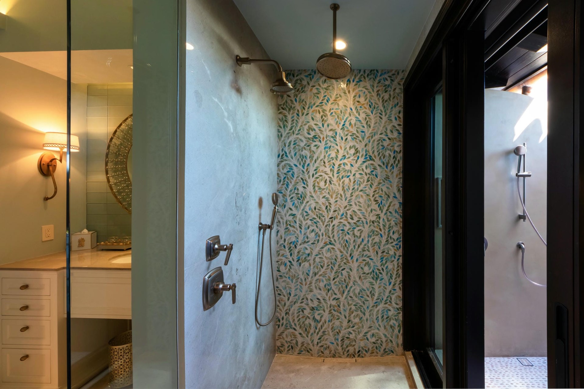 Suite Sea Glass – king-size bed, sitting area, powder room, en-suite bathroom with shower + outdoor shower, garden access, and ocean views
