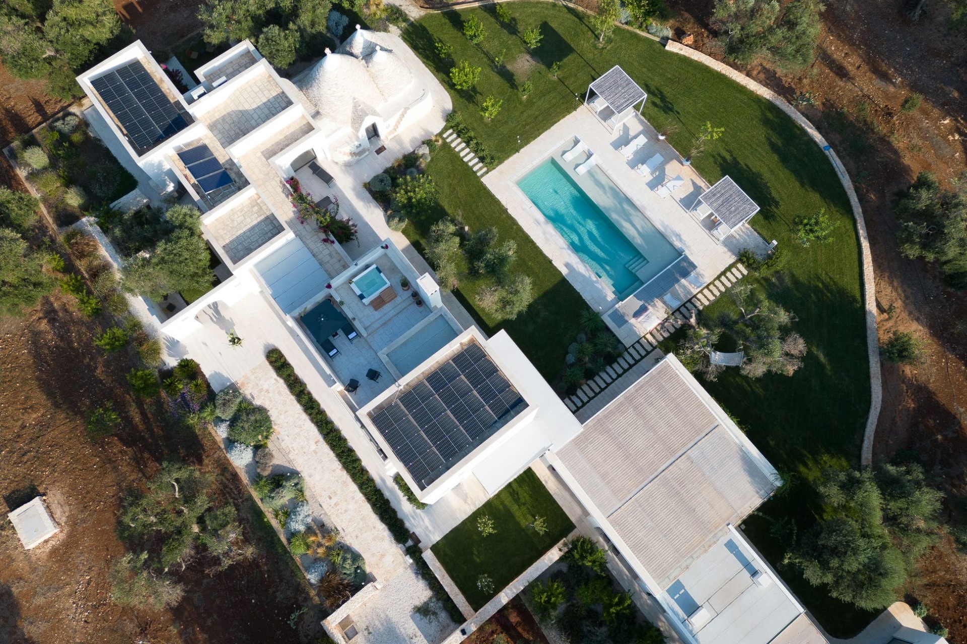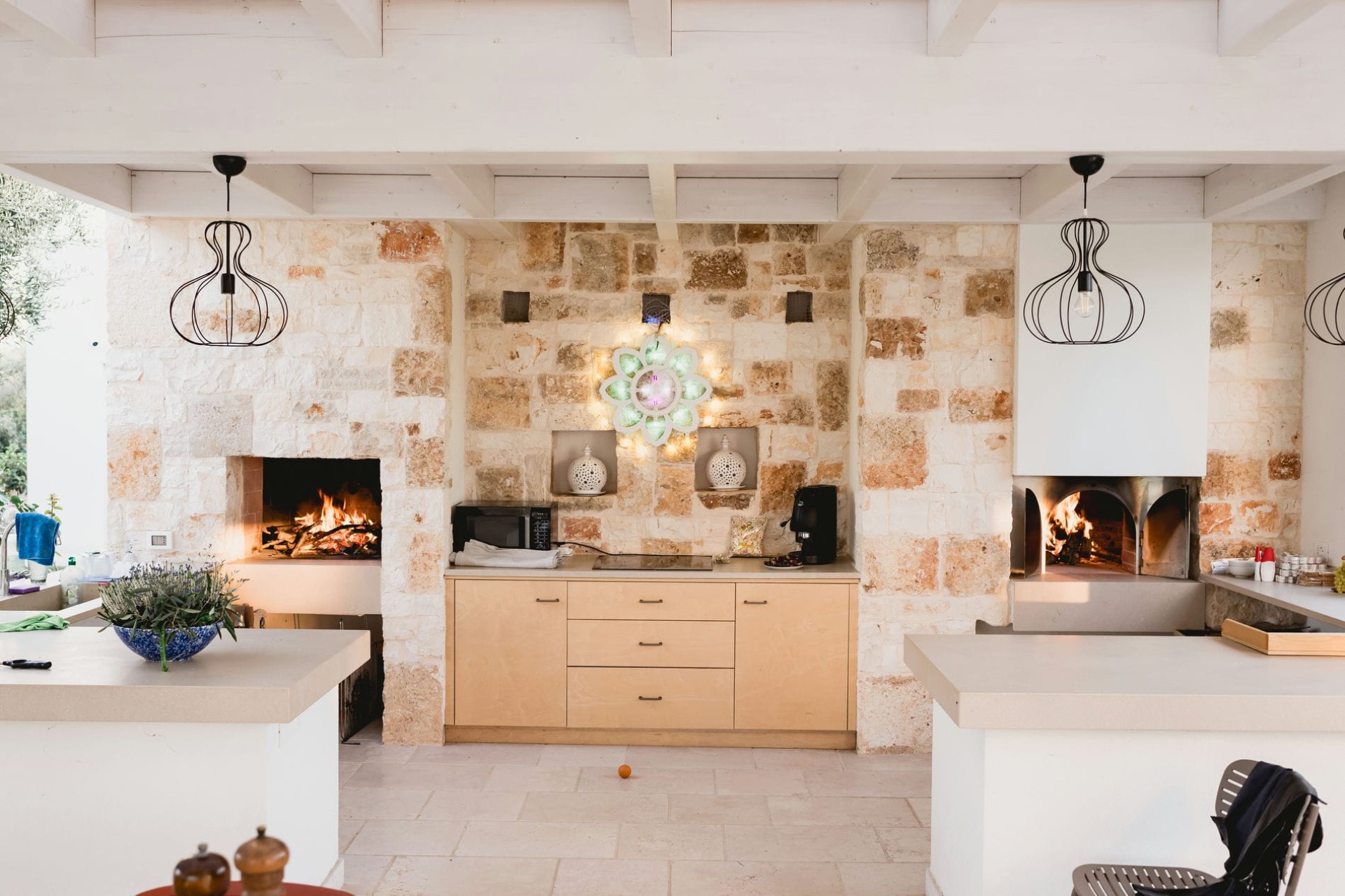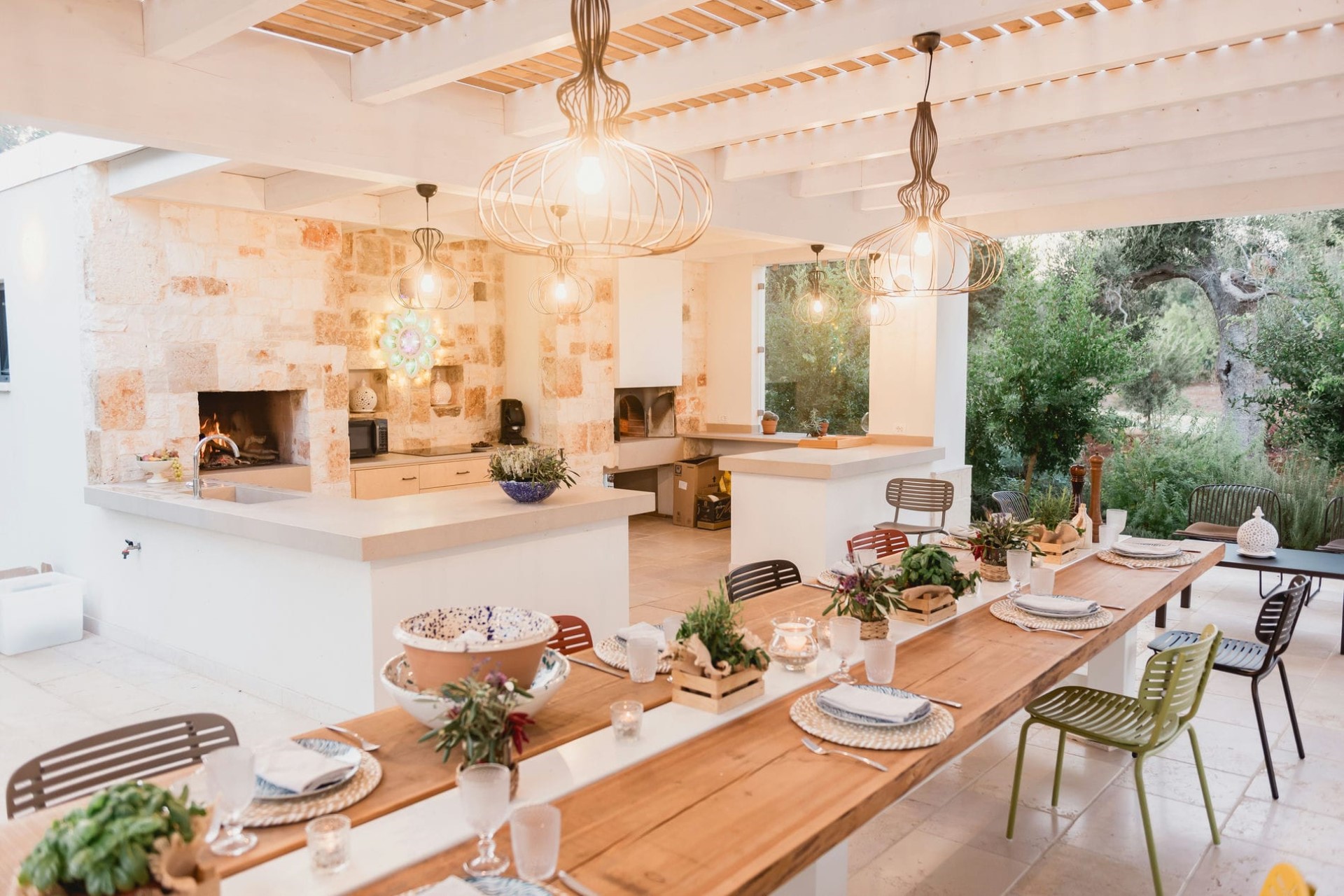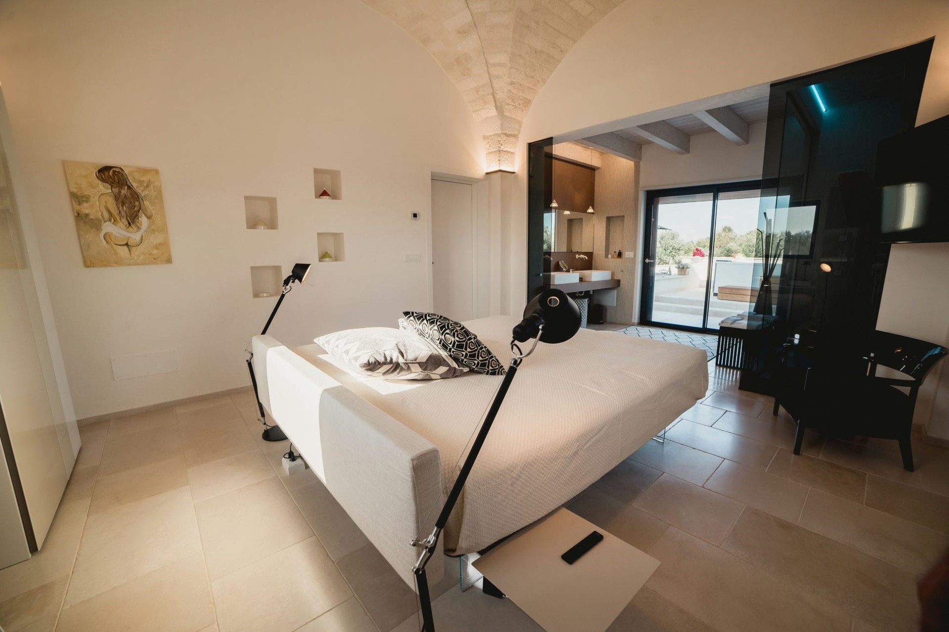 The villa itself is a beautifully restored traditional Apulian farmhouse. Its thick stone walls, terracotta tiles, and conical roofs are a nod to its heritage, while a tasteful blend of antique and modern furnishings in the interior creates a unique, warm, and inviting atmosphere.