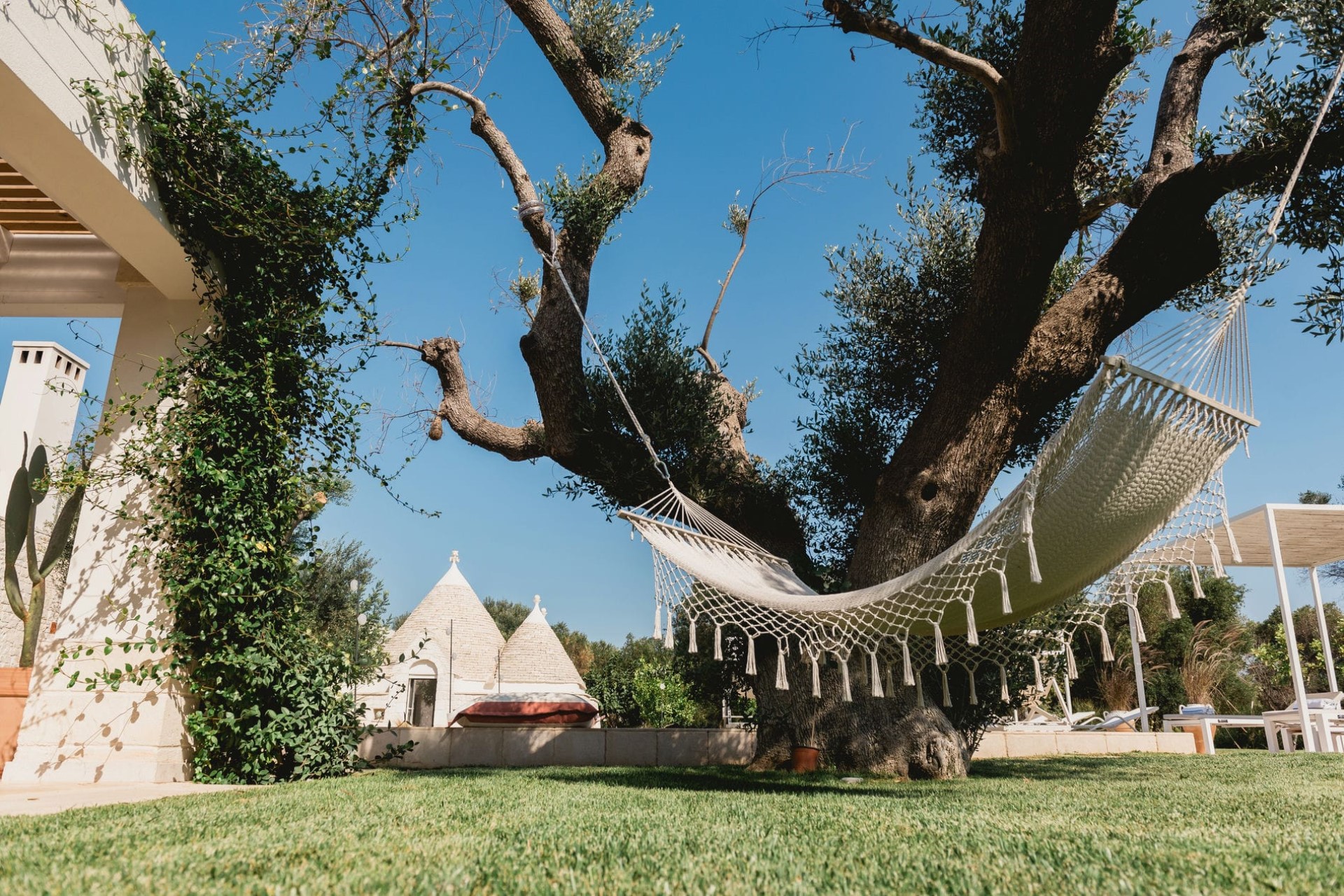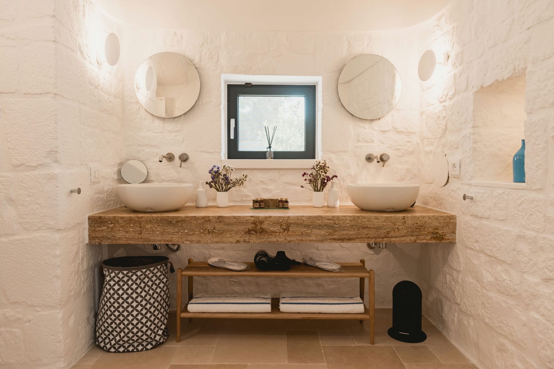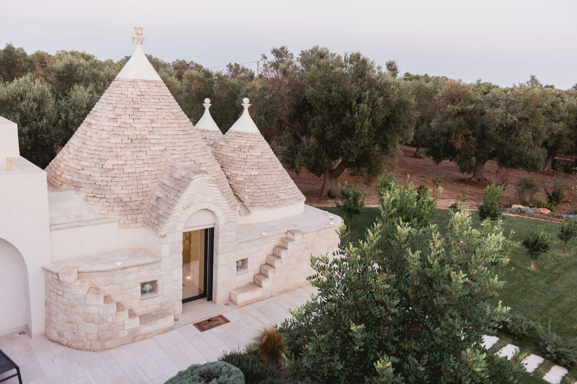 The villa itself is a beautifully restored traditional Apulian farmhouse. Its thick stone walls, terracotta tiles, and conical roofs are a nod to its heritage, while a tasteful blend of antique and modern furnishings in the interior creates a unique, warm, and inviting atmosphere.