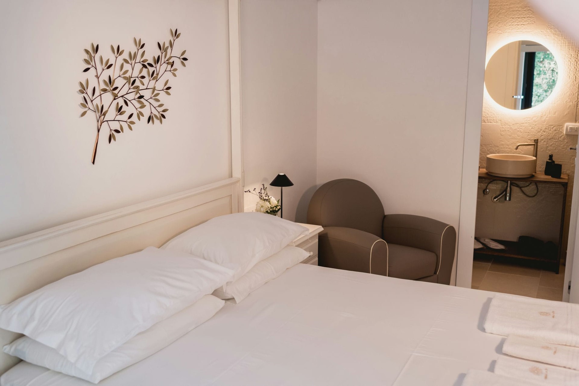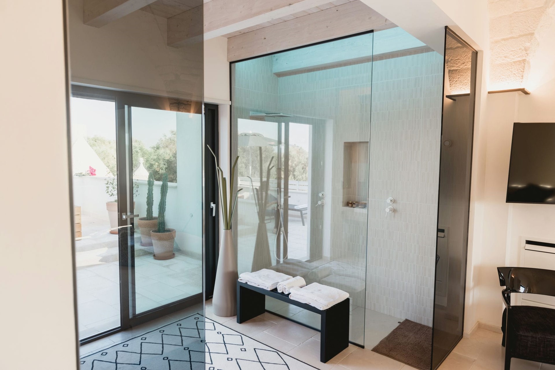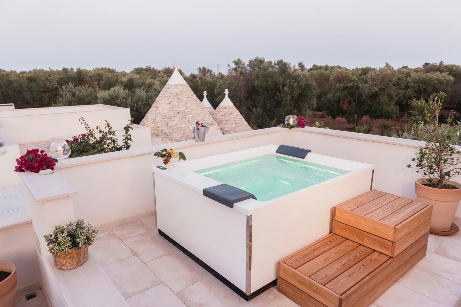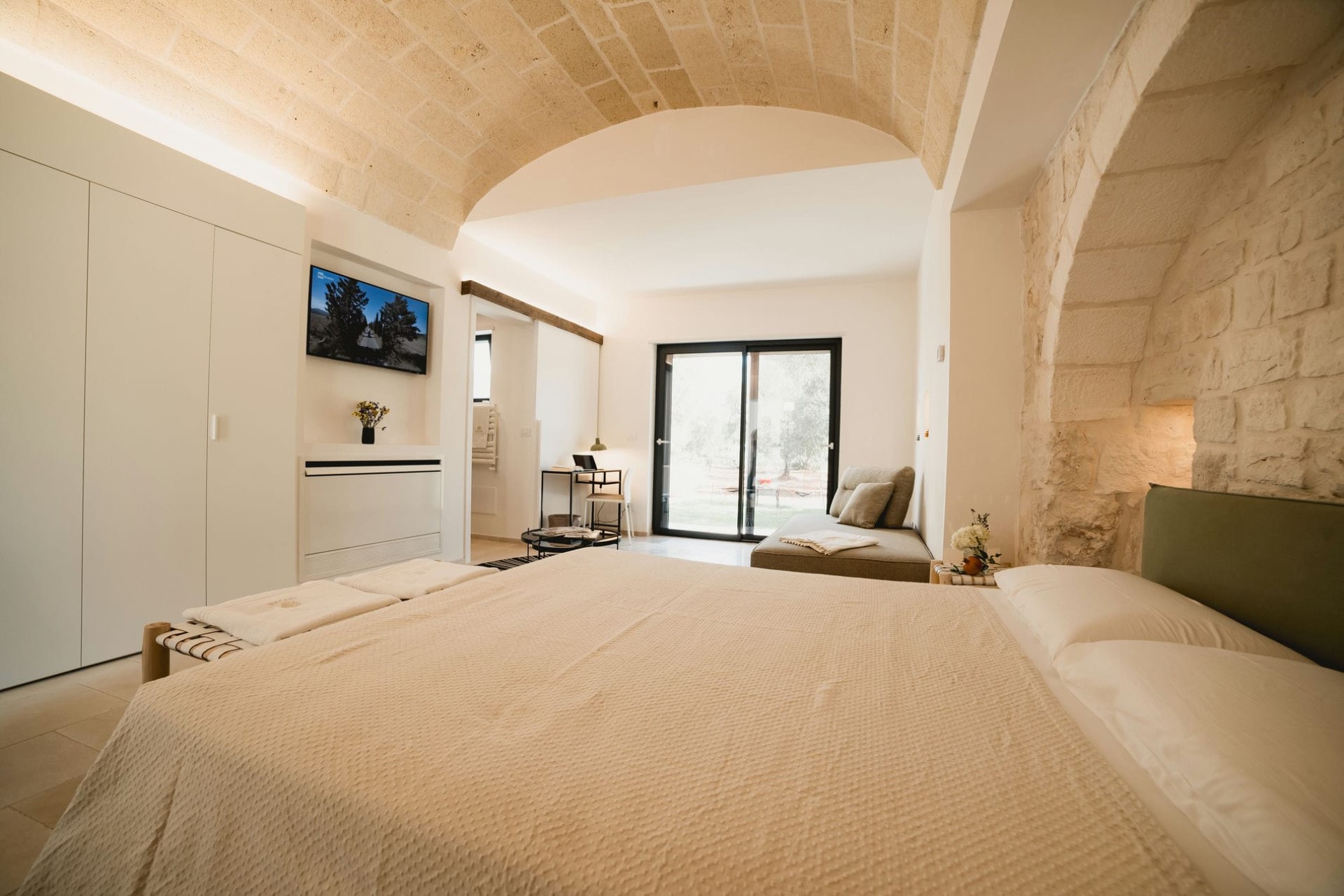 The villa itself is a beautifully restored traditional Apulian farmhouse. Its thick stone walls, terracotta tiles, and conical roofs are a nod to its heritage, while a tasteful blend of antique and modern furnishings in the interior creates a unique, warm, and inviting atmosphere.
