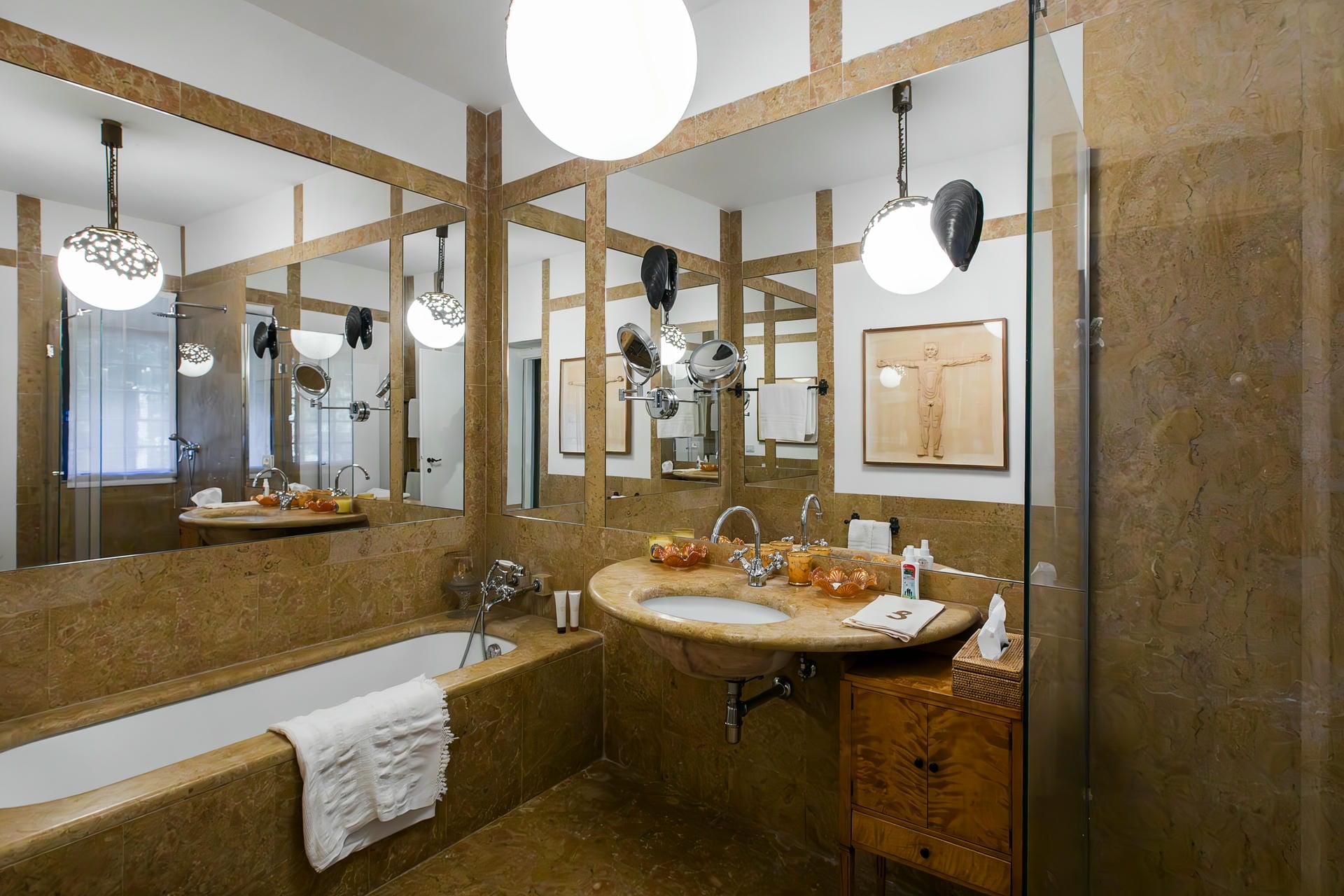 Bedroom 9 – single bed, fireplace, and en-suite bathroom with bathtub & separate shower