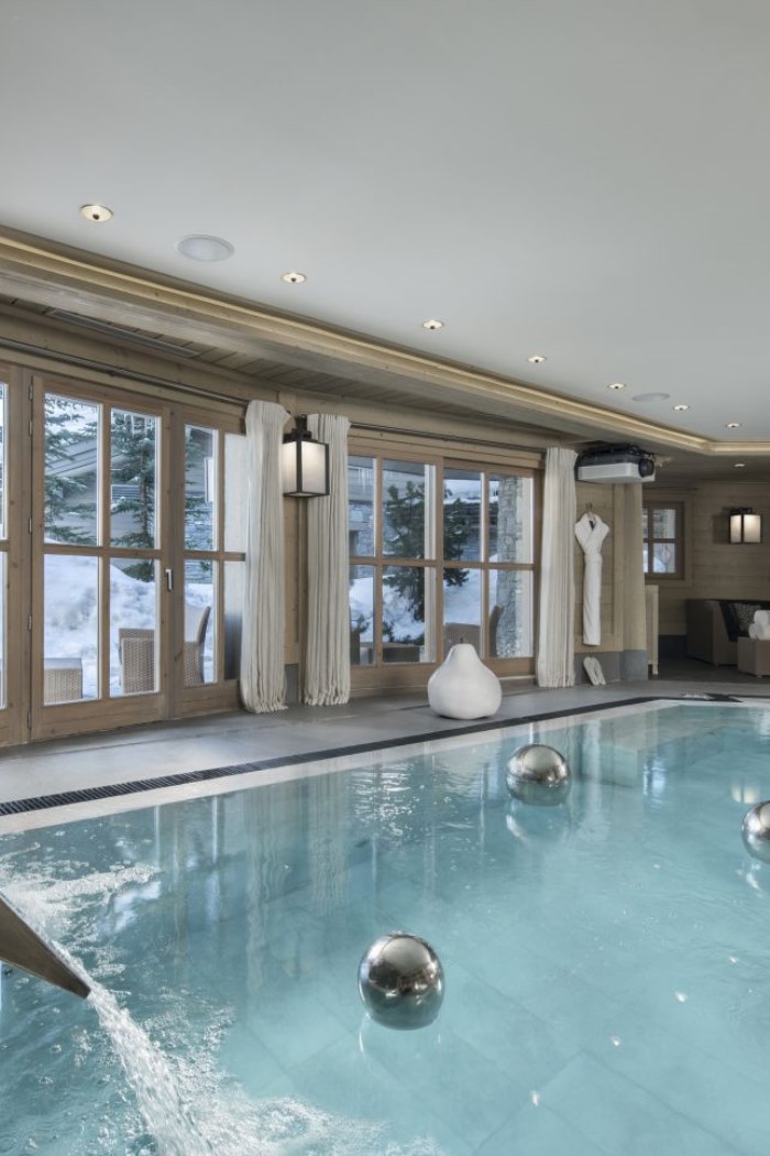 The chalet also features high-end wellness facilities, which are located on the lowest floor. There is a large indoor swimming pool with waterfalls and counter-current jets, a poolside relaxation area, and a hammam.