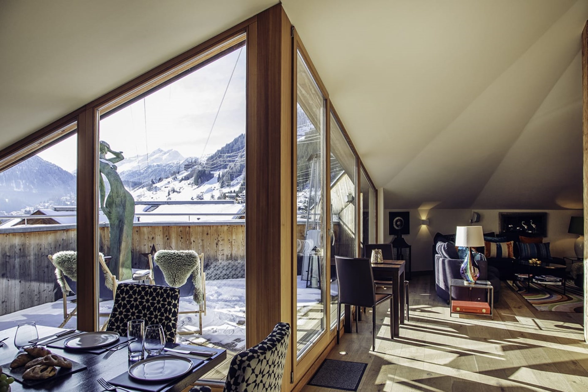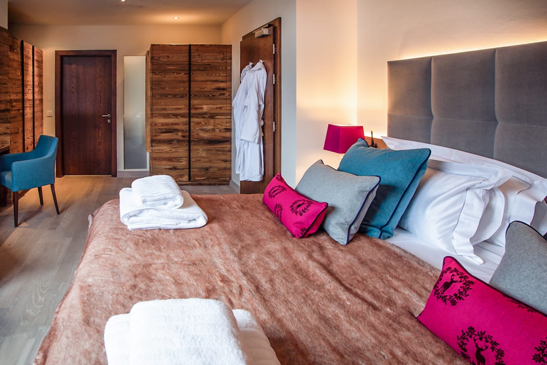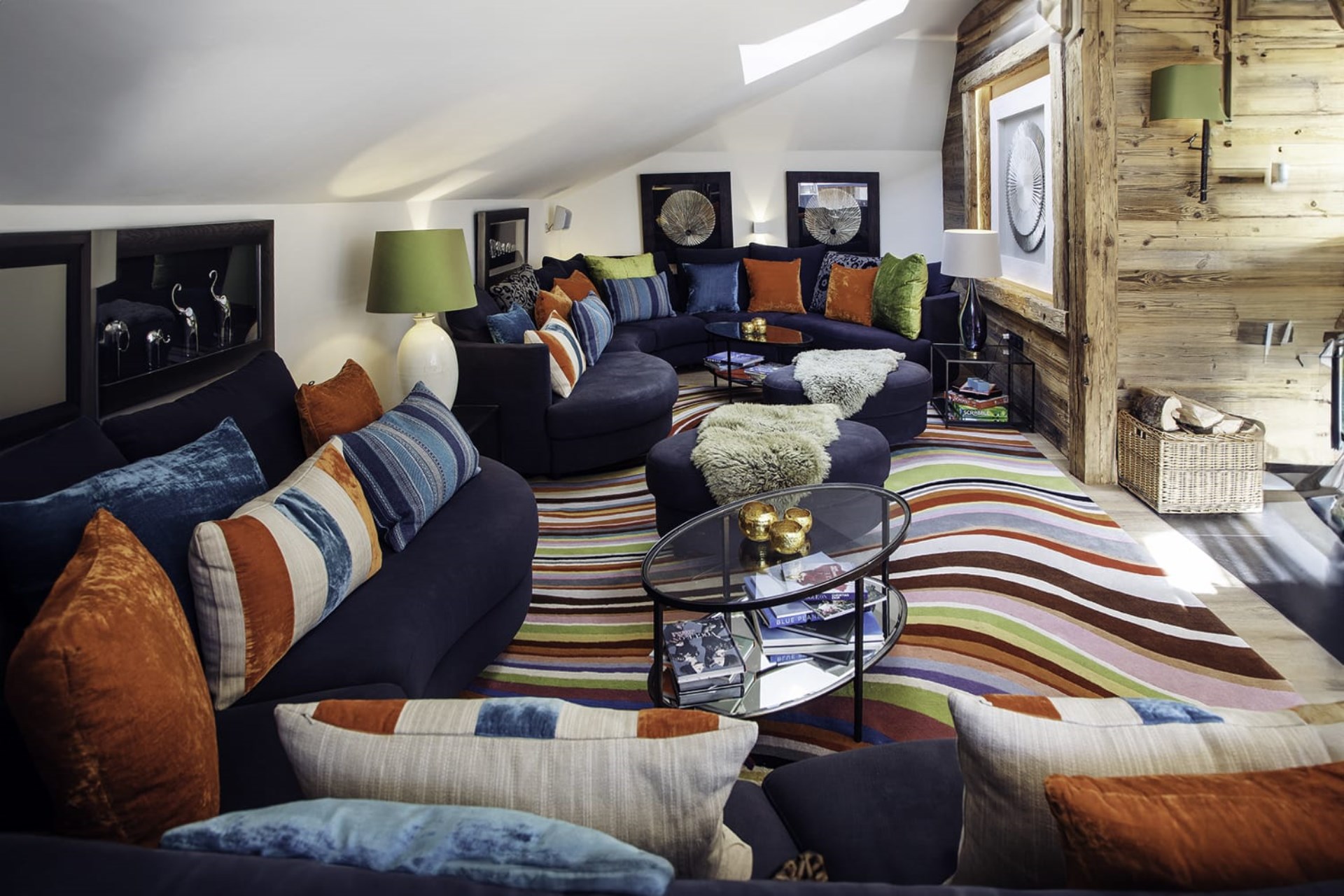 The chalet boasts a stylish interior that seamlessly blends contemporary design with subtle Austrian touches. The top floor is home to a retro-influenced living room, which features plush designer sofas, a crackling fireplace, and brightly coloured soft furnishings, giving the space a relaxed and fun vibe.