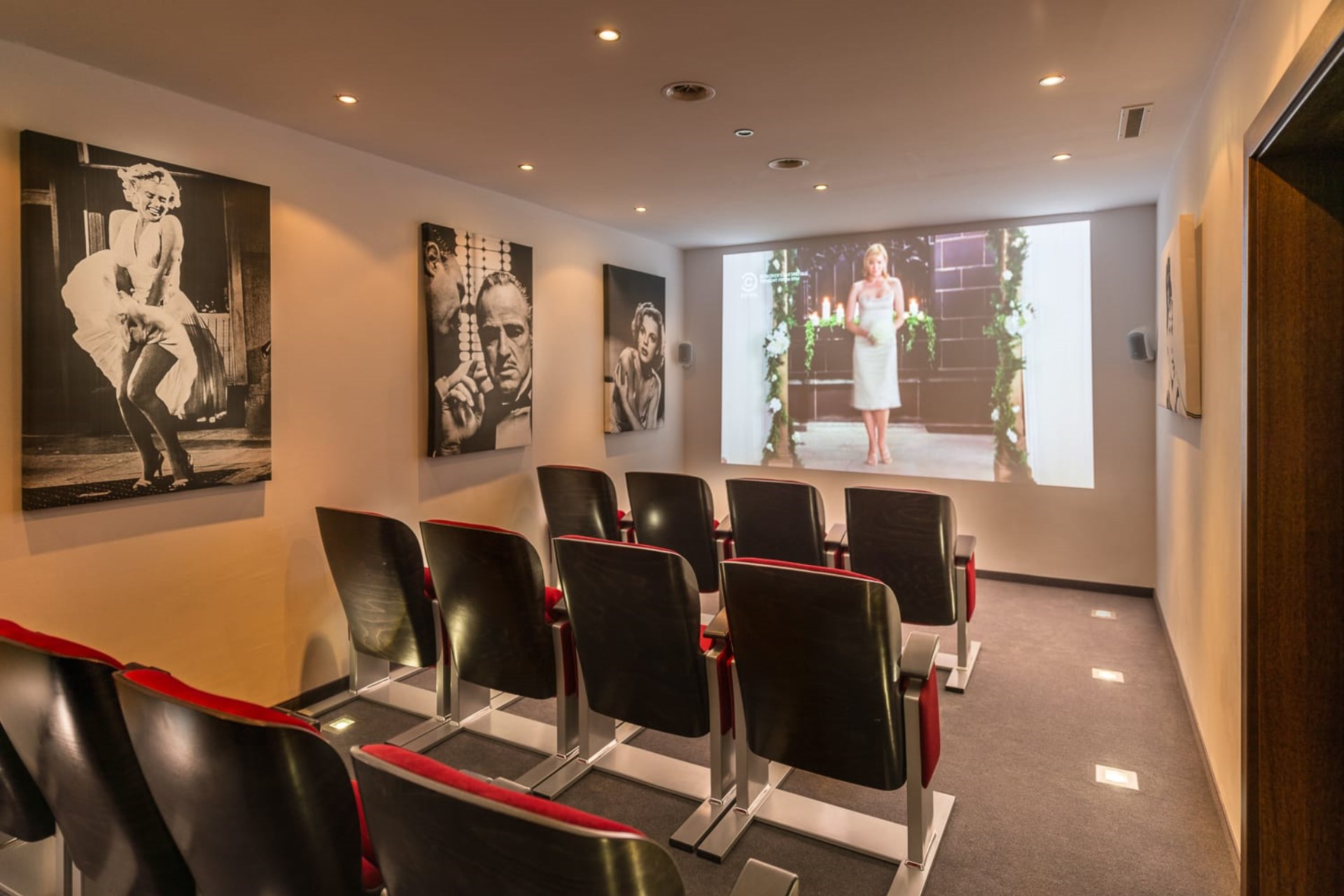 Family film nights can be enjoyed in the cinema room, which features retro red velvet seats, a popcorn machine, and a drinks fridge, providing an authentic cinema experience. With sharp visuals and surround sound on offer, this versatile space can also be converted into a meeting room for corporate groups.