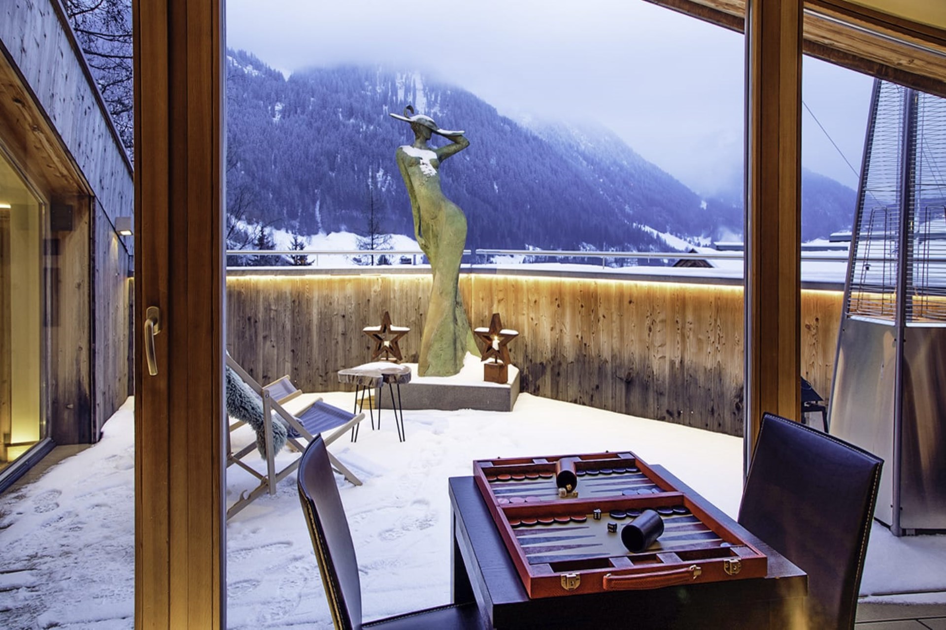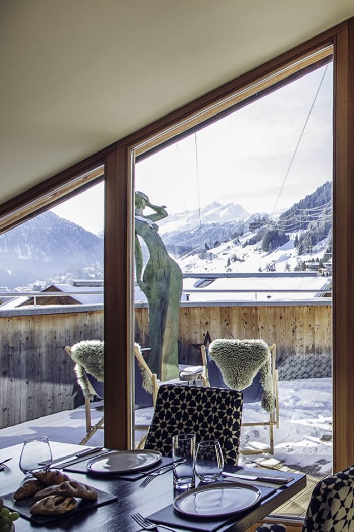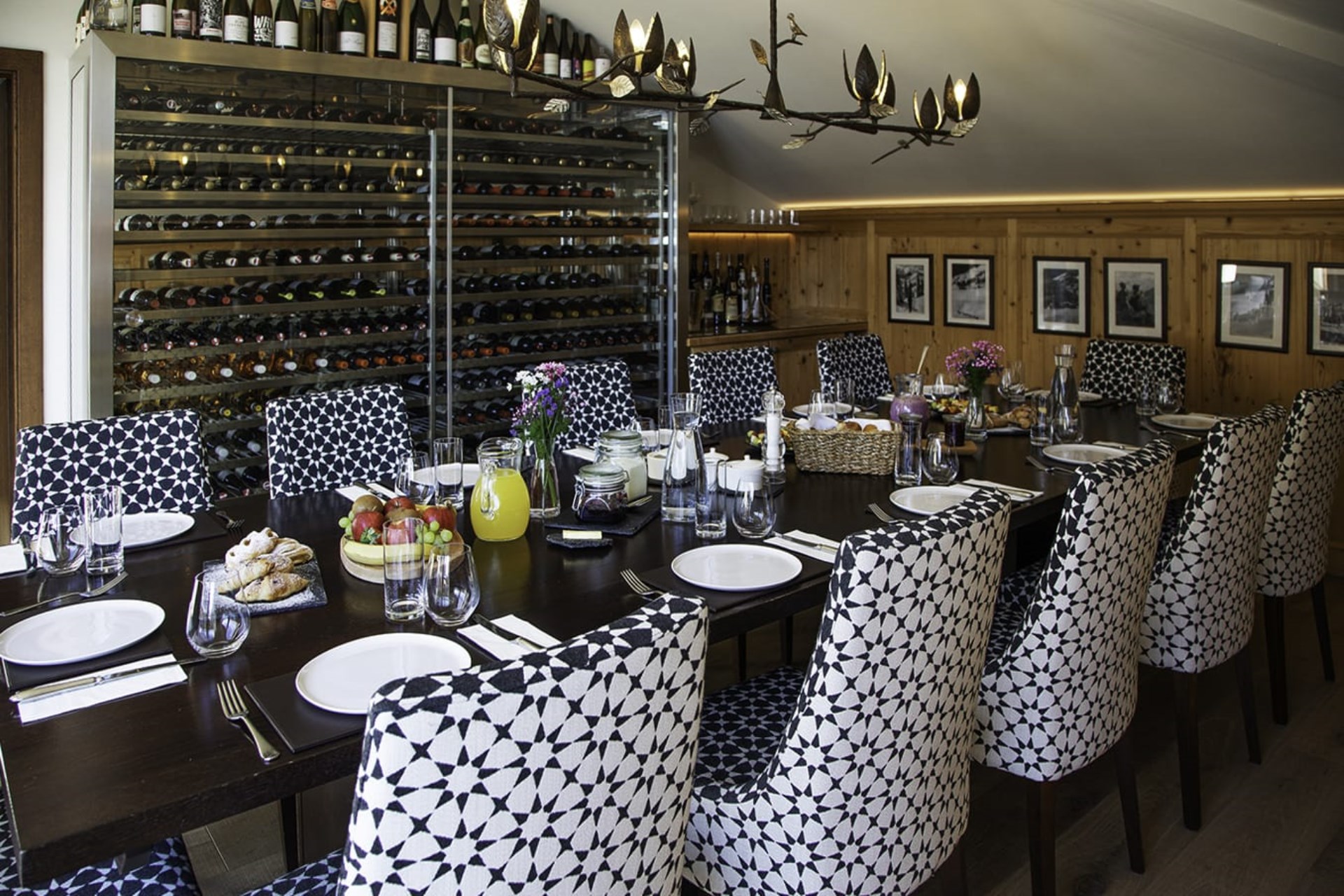 Adjoining the living area is a beautiful dining room featuring a 12-seater dining table and a stunning wall-length wine rack, offering over 300 top wines. Floor-to-ceiling windows open onto the spacious wooden terrace, where guests can soak up the mountain views during the day and enjoy the town’s twinkling lights after dark, all while a statue of the chalet’s namesake, Artemis, keeps watch.