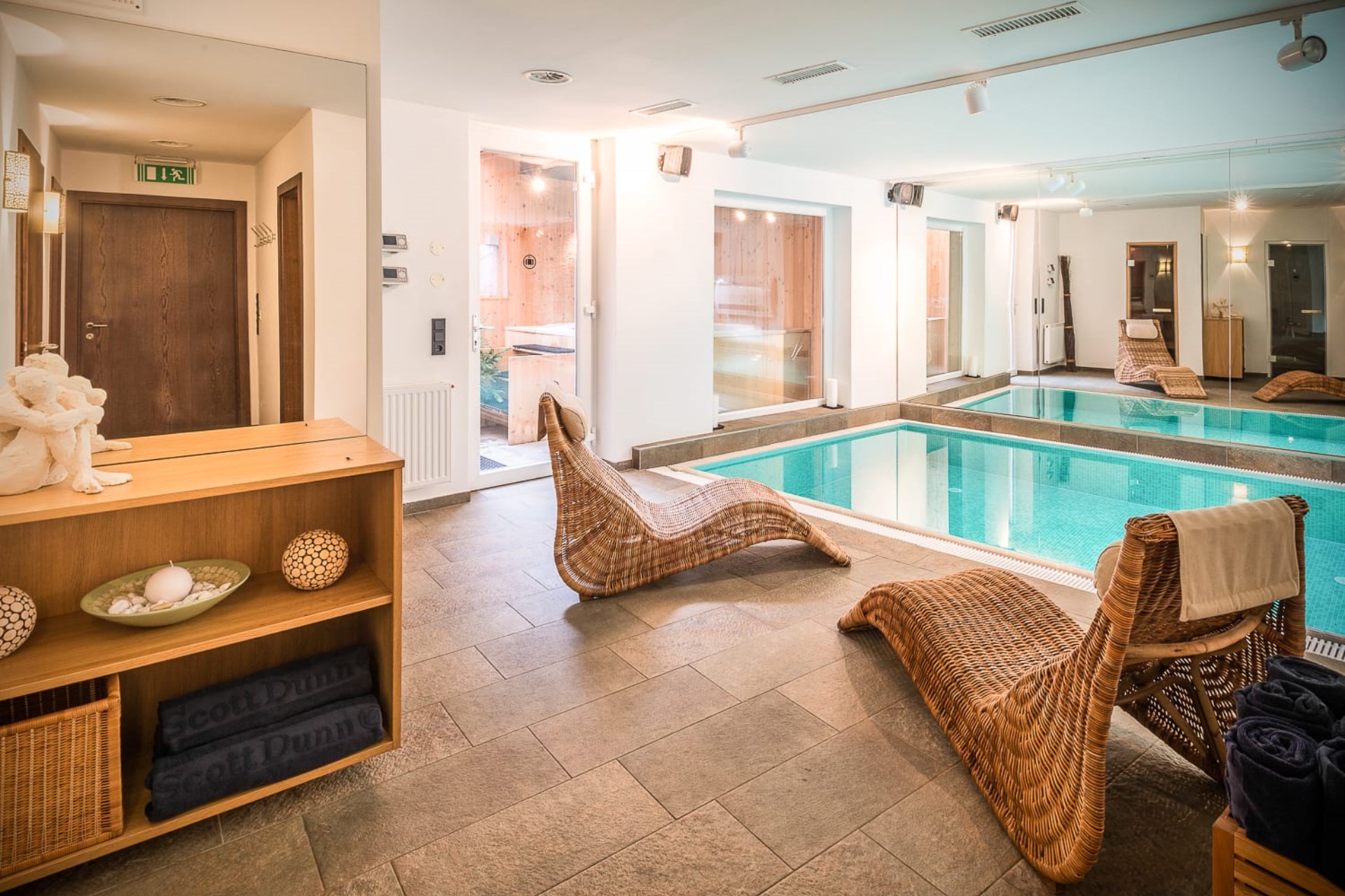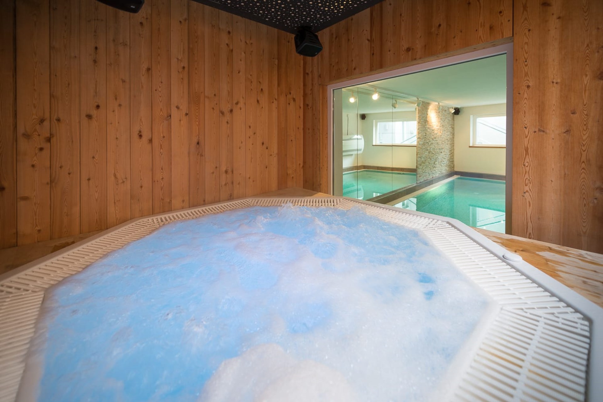 The chalet’s lower ground floor is dedicated to relaxation and rejuvenation with luxurious private spa facilities. The spa features an 8-metre indoor swimming pool with a jet stream, a sauna, and a steam room – all designed to soothe tired muscles and promote relaxation. A Jacuzzi with a celestial effect ceiling and sound system adds another layer of indulgence, while a dedicated massage room offers space to relax with a range of treatments.