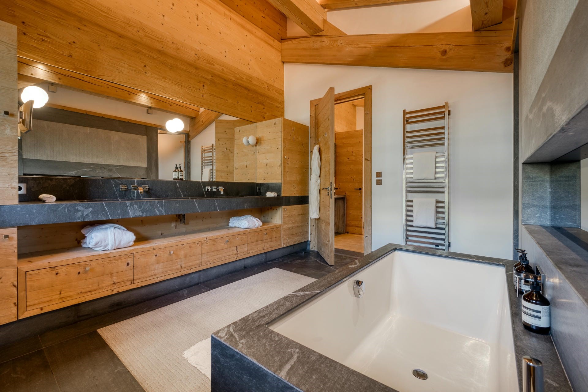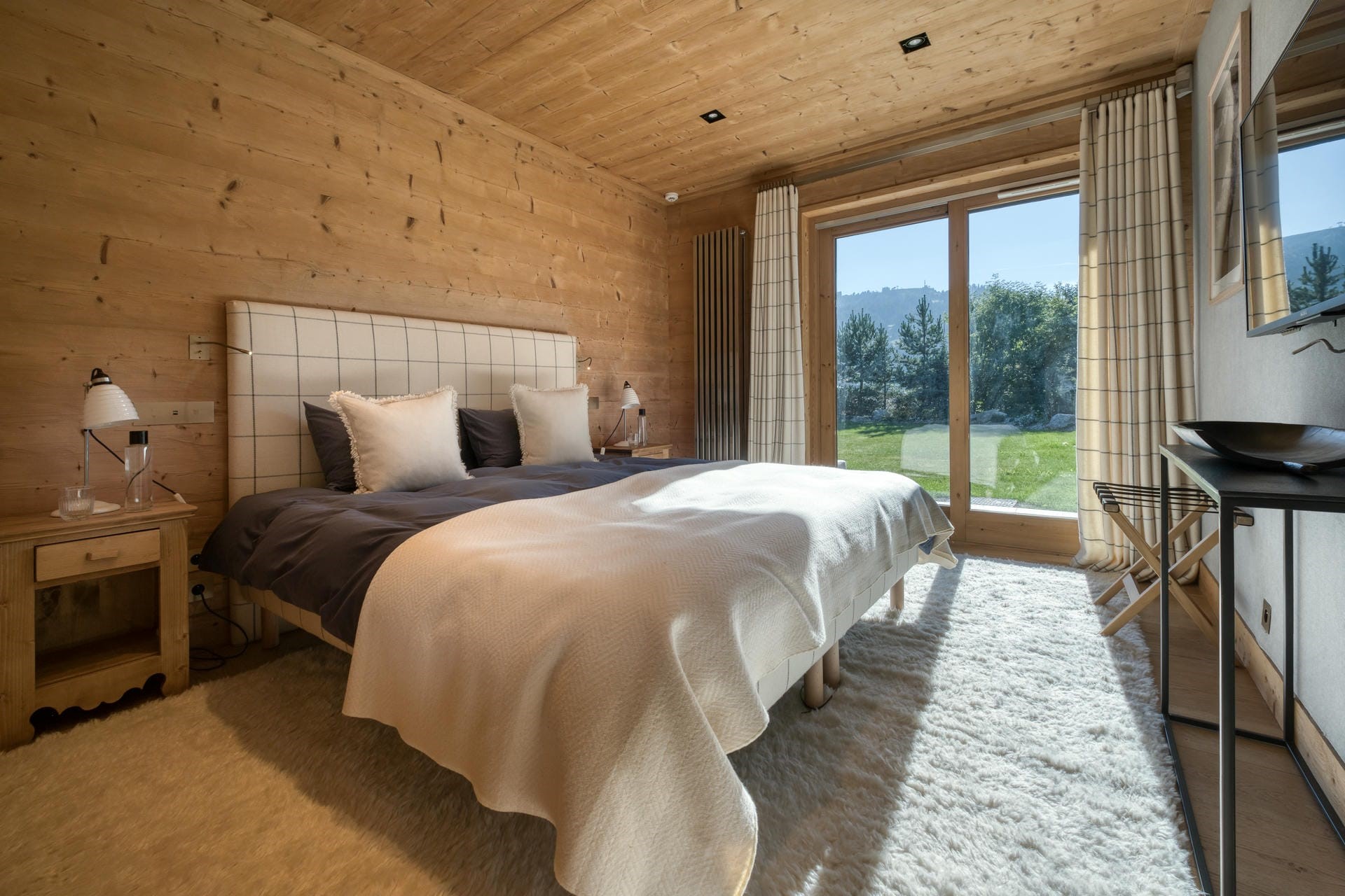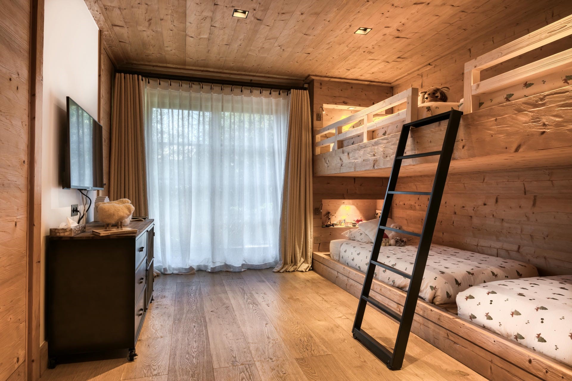 The chalet offers five bedrooms, sleeping up to eight adults and four children. The master suite on the first floor boasts a private balcony with mountain views, a dressing room, and an en-suite bathroom with a freestanding tub and walk-in shower. Three double bedrooms are located on the garden floor, each with direct access outside, while a bunk room sleeps four children in comfort and style.