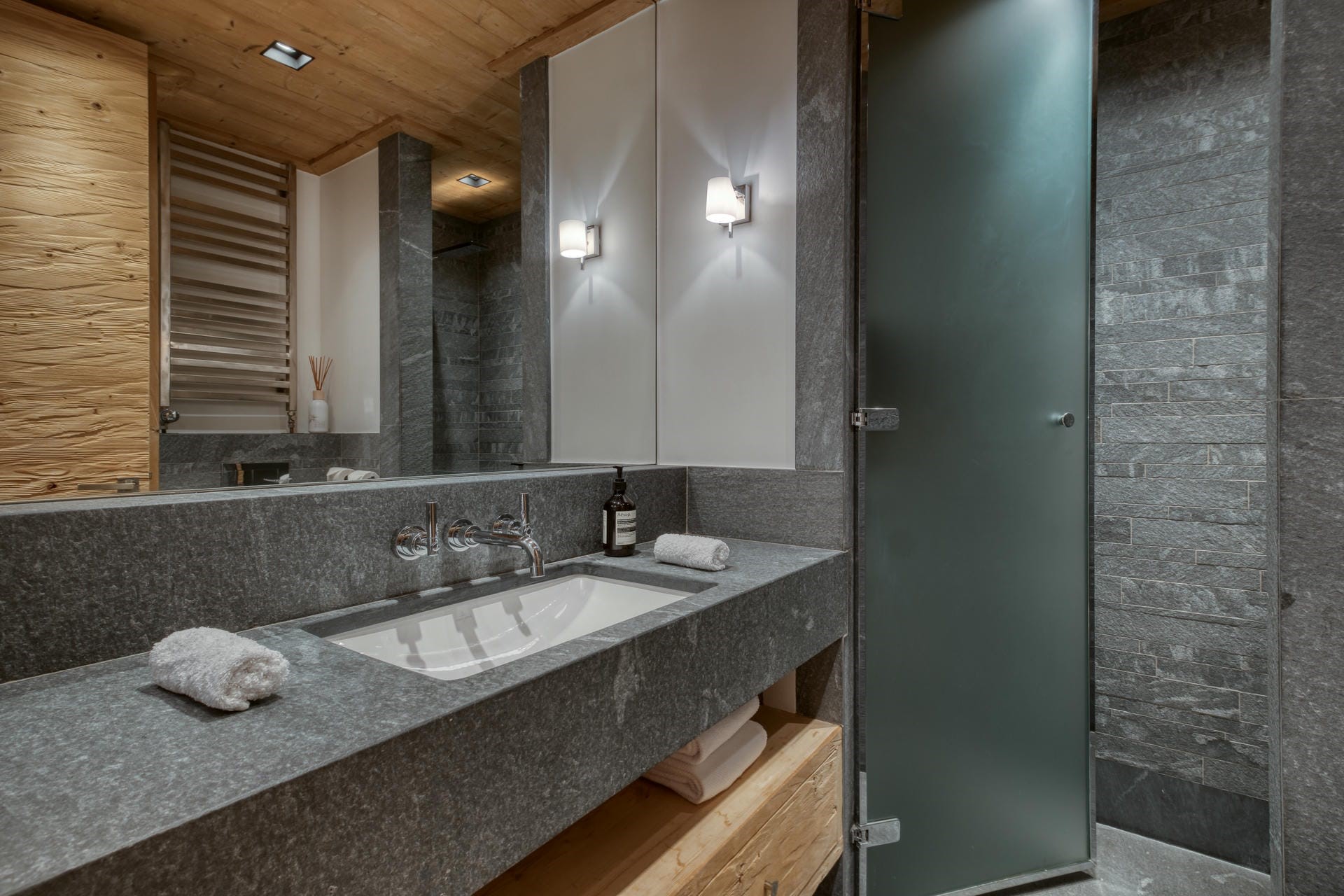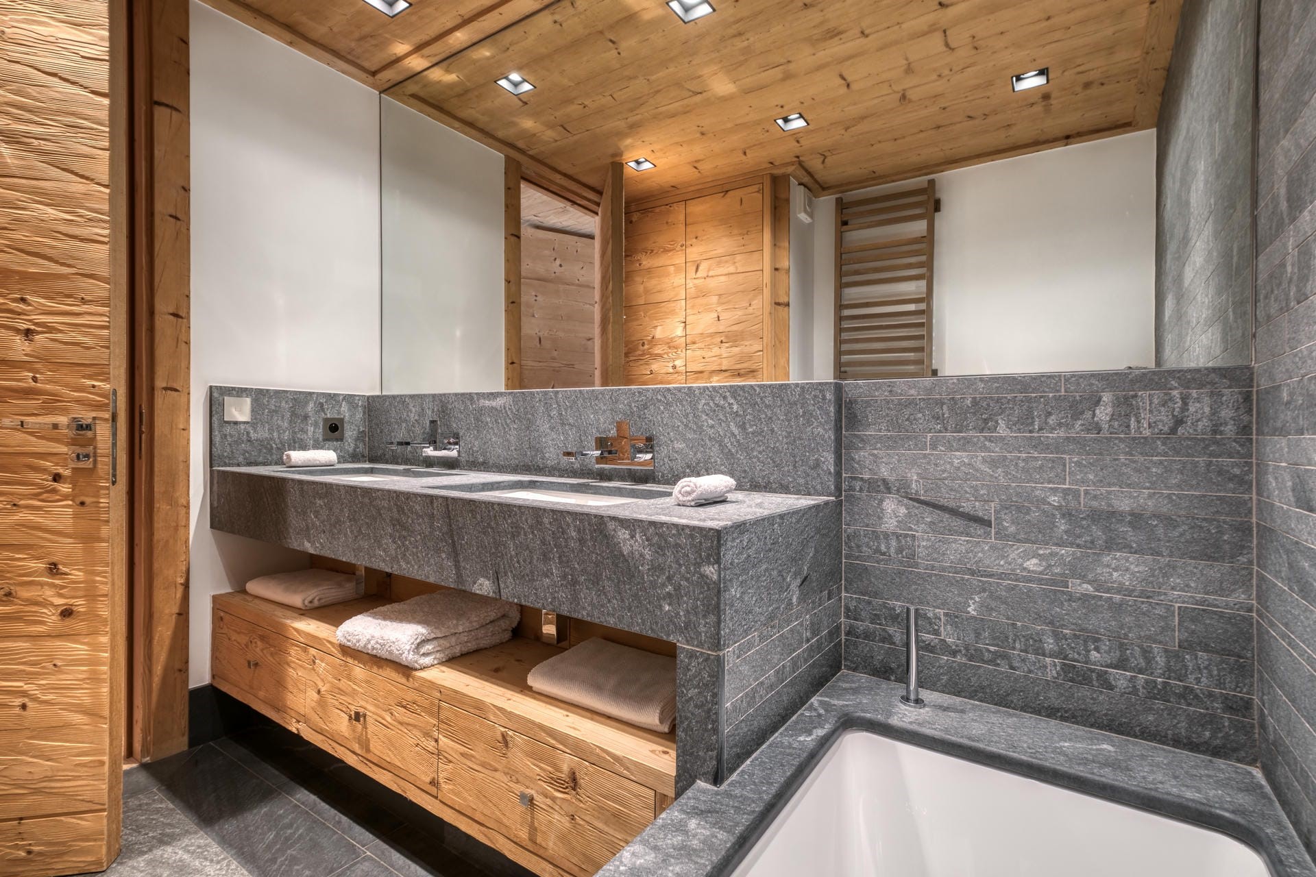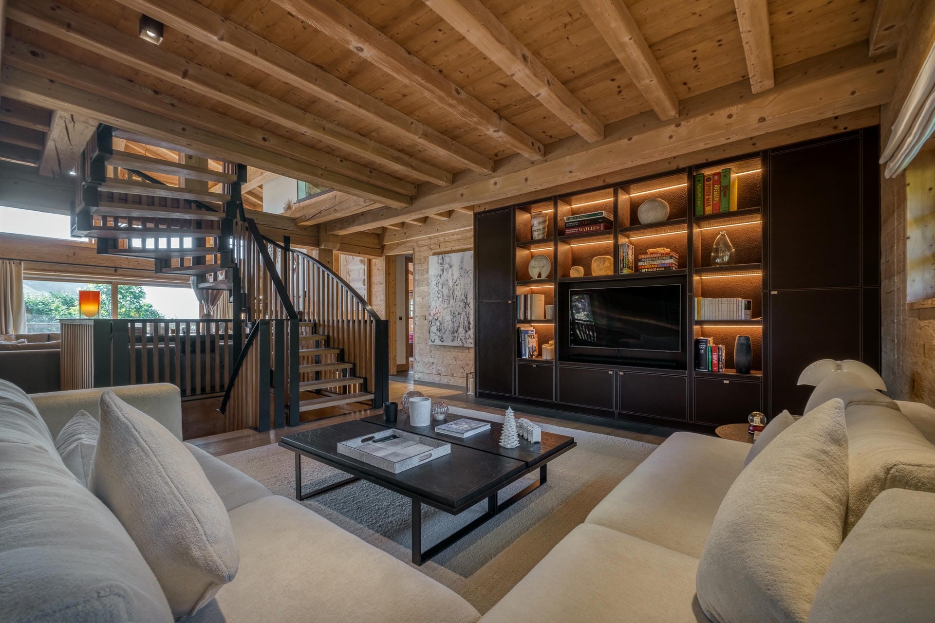 The chalet offers five bedrooms, sleeping up to eight adults and four children. The master suite on the first floor boasts a private balcony with mountain views, a dressing room, and an en-suite bathroom with a freestanding tub and walk-in shower. Three double bedrooms are located on the garden floor, each with direct access outside, while a bunk room sleeps four children in comfort and style.