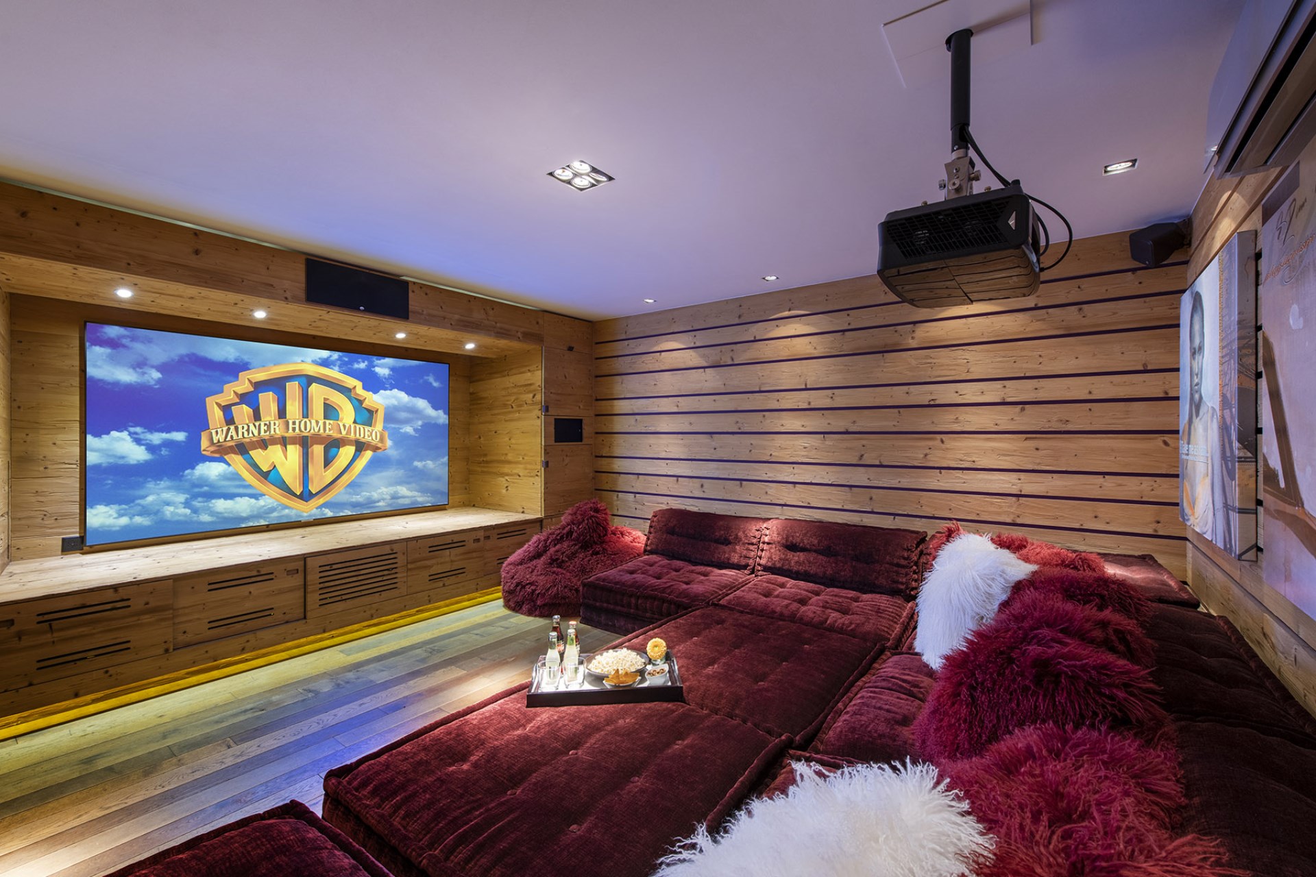 The cosy cinema room is ideal for family film nights; it features a full-size cinema screen with a 4K projector, for a top viewing experience, as well as several games consoles with a host of games.