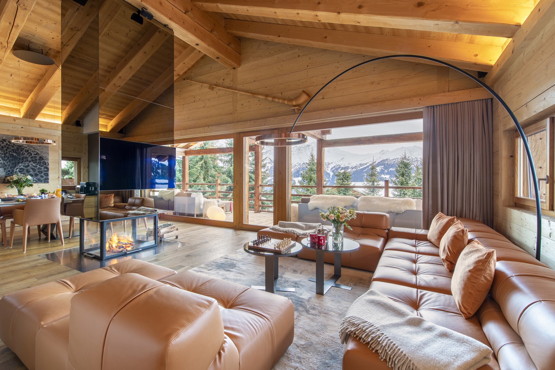 There is a welcoming atmosphere throughout the chalet, thanks to the mix of warm colours and highest-quality furnishings. The spacious living area with its plush sofas and a central fireplace is ideal for gathering the whole family and enjoying time together, whilst gourmet meals will be enjoyed in the elegant dining area.