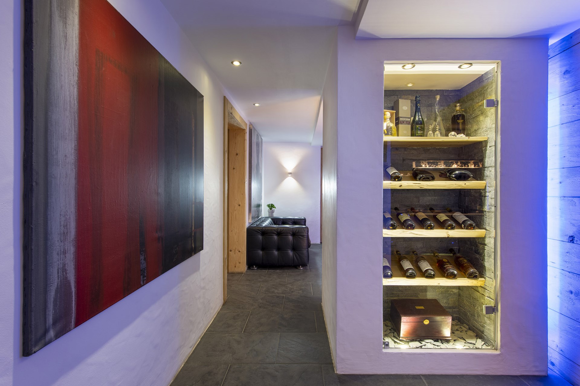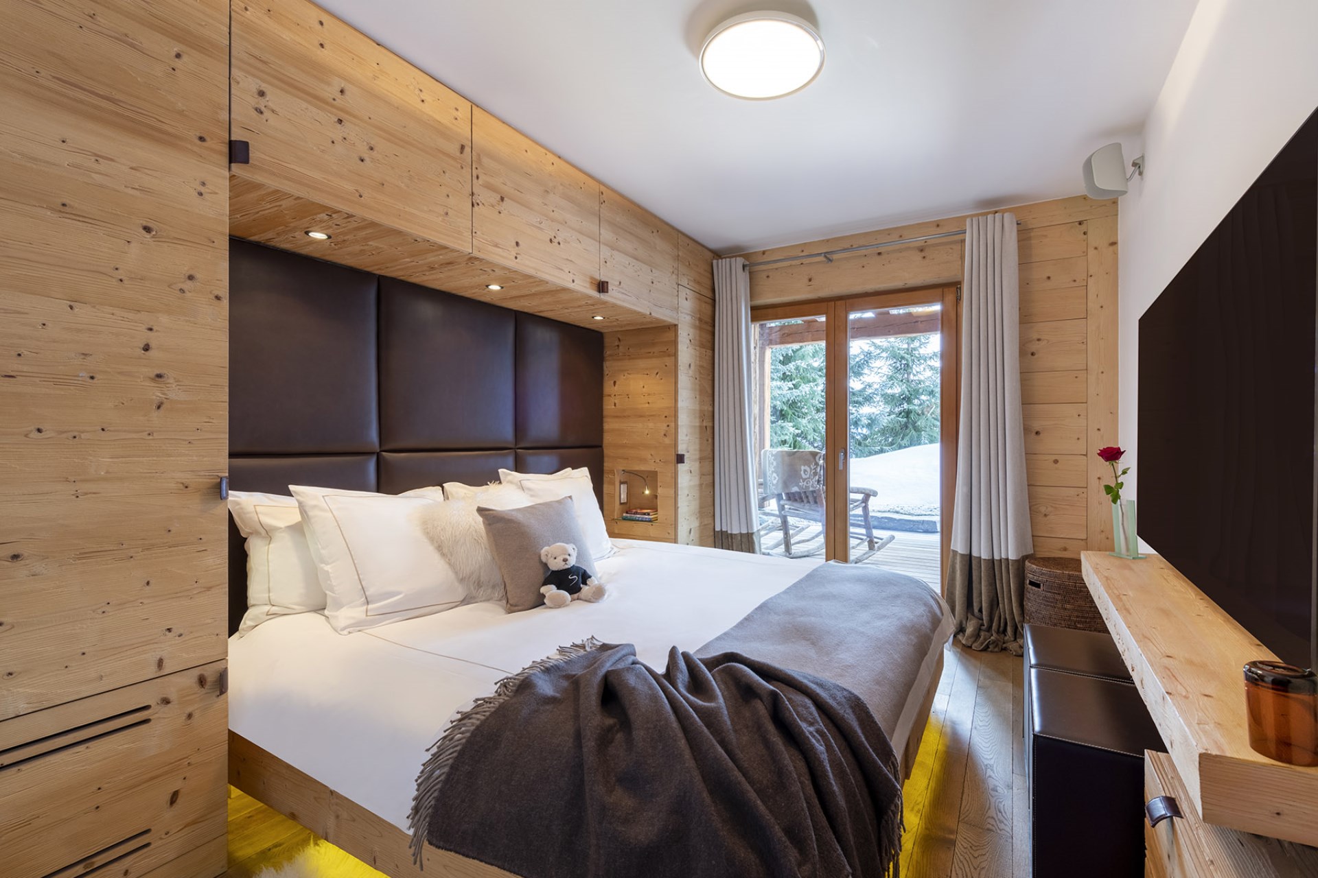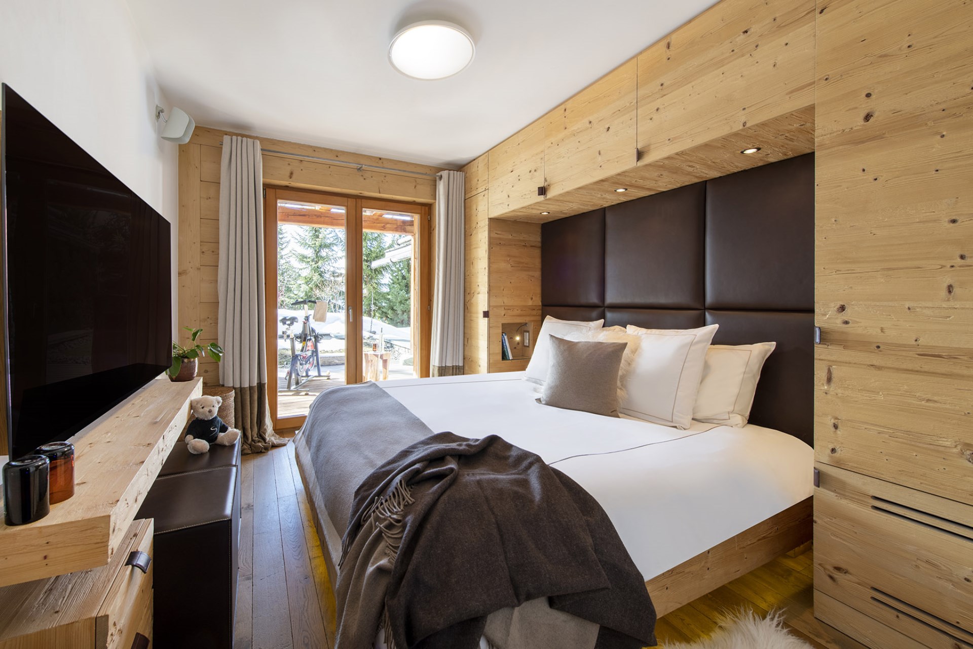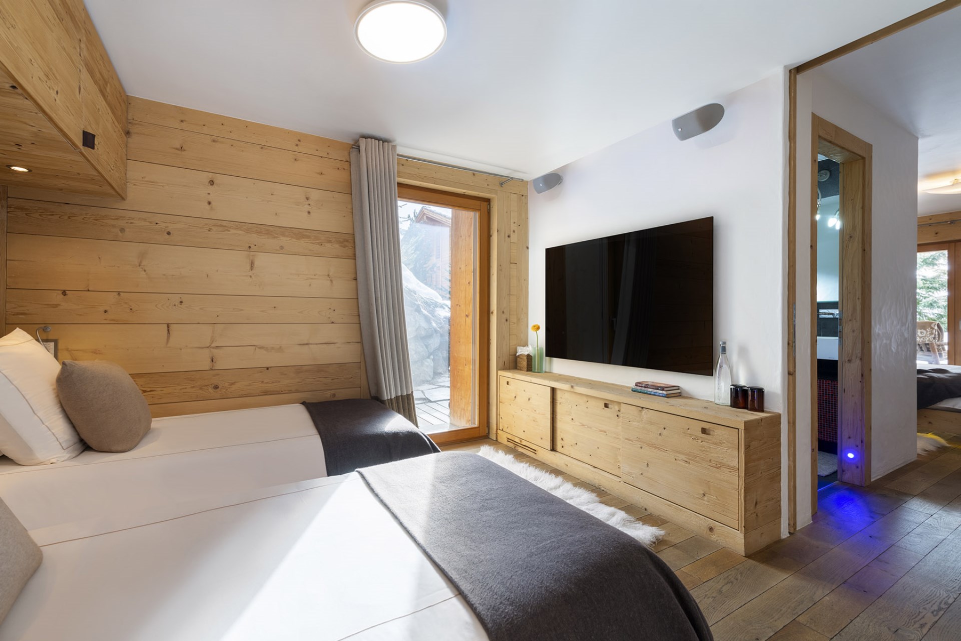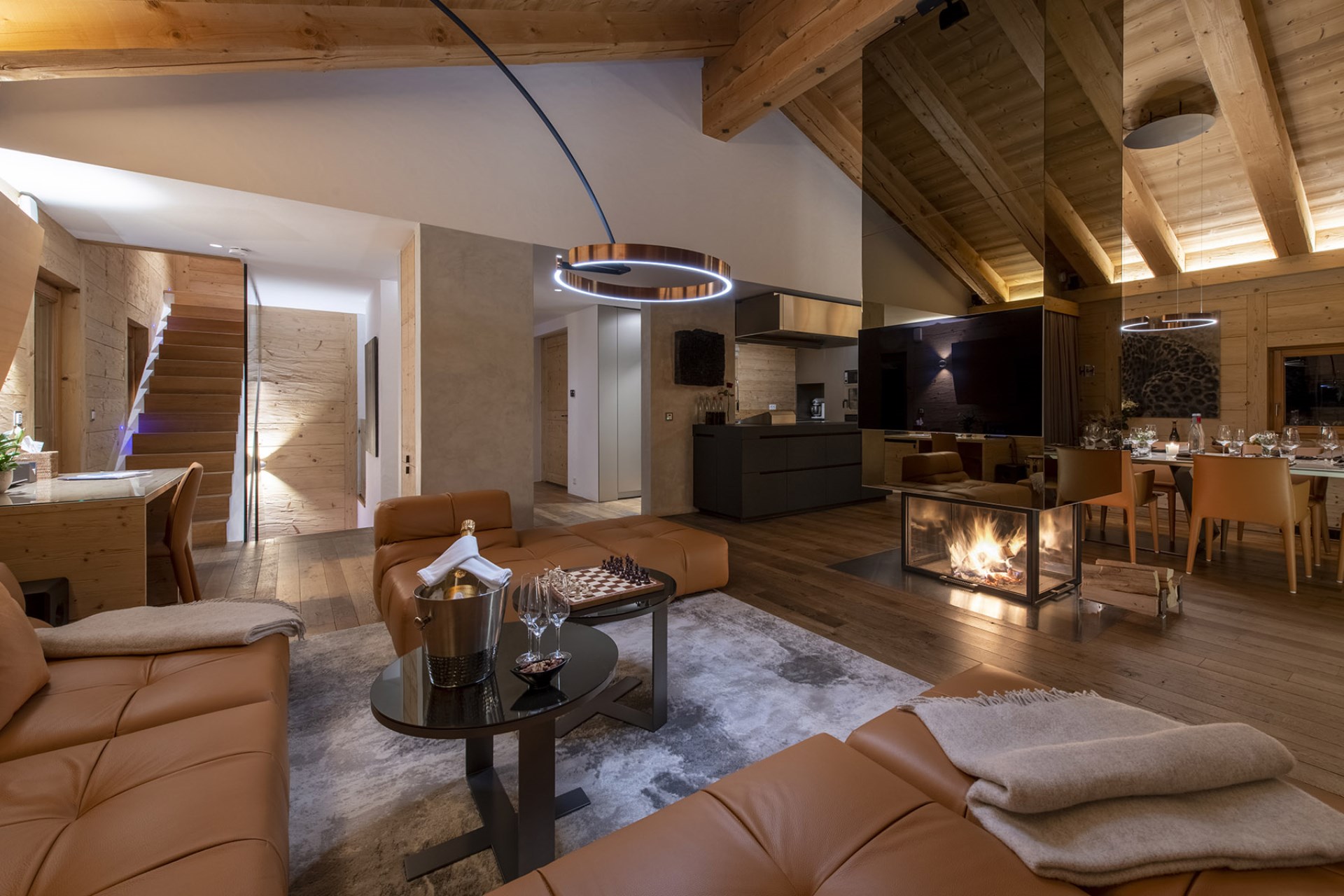 The chalet also boasts an indoor swimming pool with ambient lighting beside huge glass windows offering spectacular views. Adjoining the pool area is a fully-equipped gym, a bio-sauna with mountain views, and a massage and treatment room for true relaxation.
