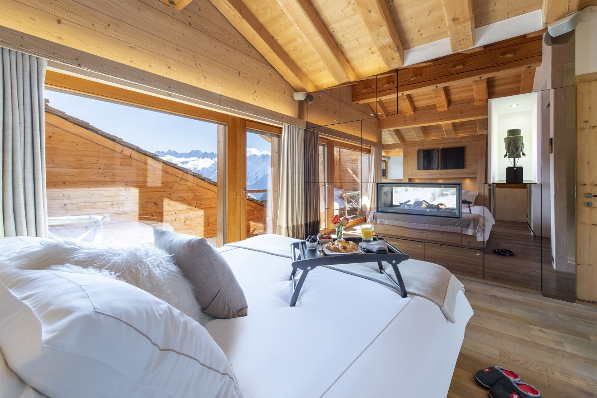 Bedroom 1 (Penthouse suite) – super-king-sized bed, fireplace, in-room light therapy Jacuzzi bathtub + en-suite bathroom with shower, and private under-cover balcony with mountain views