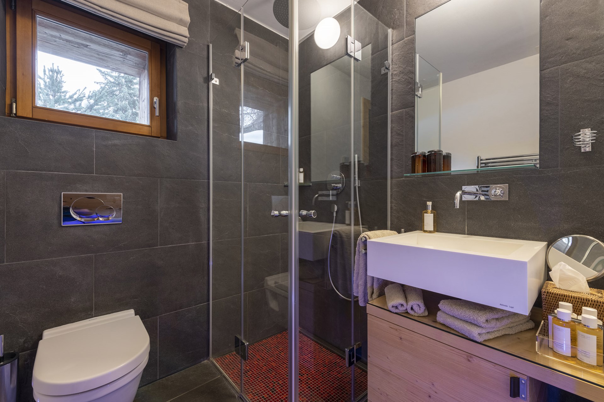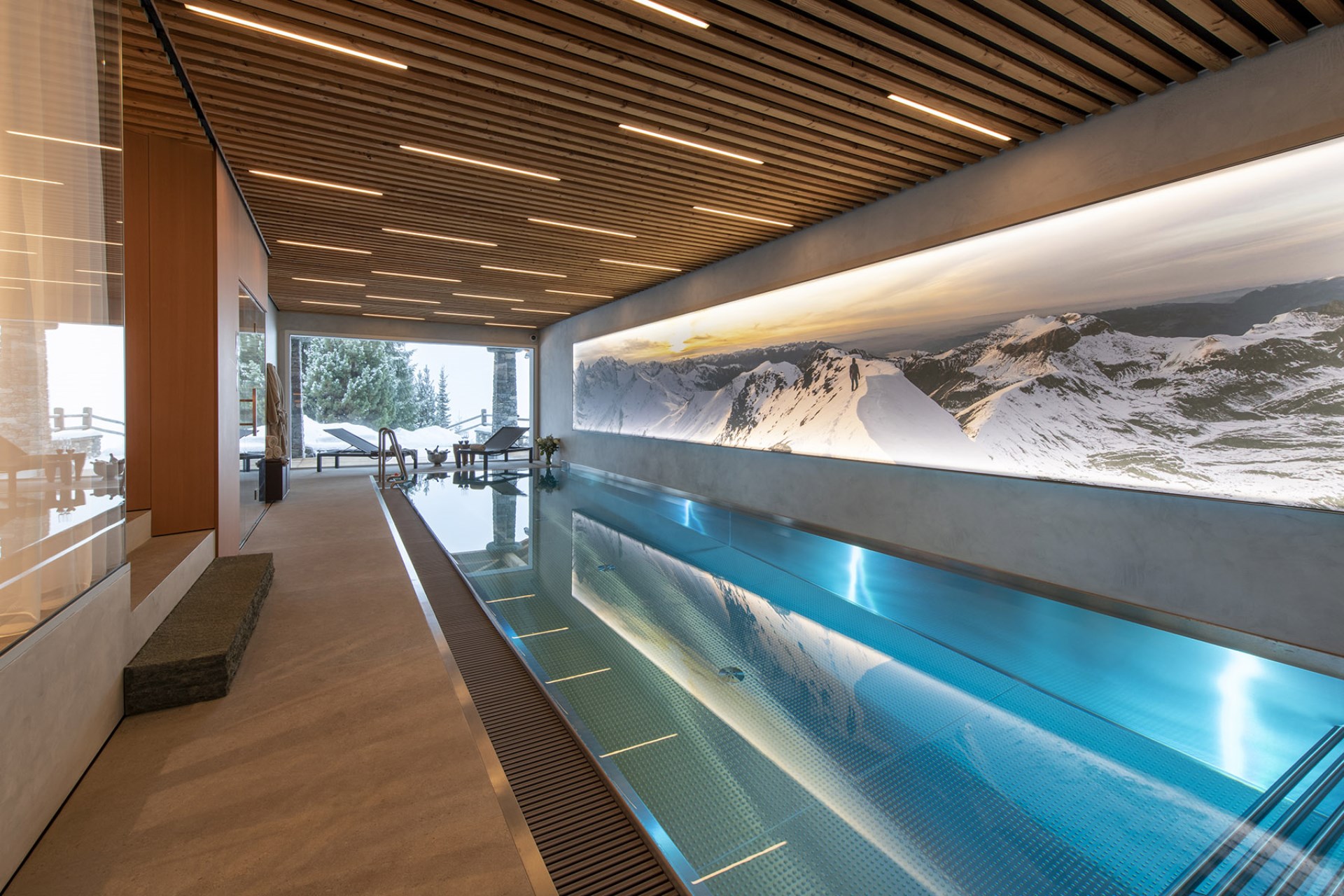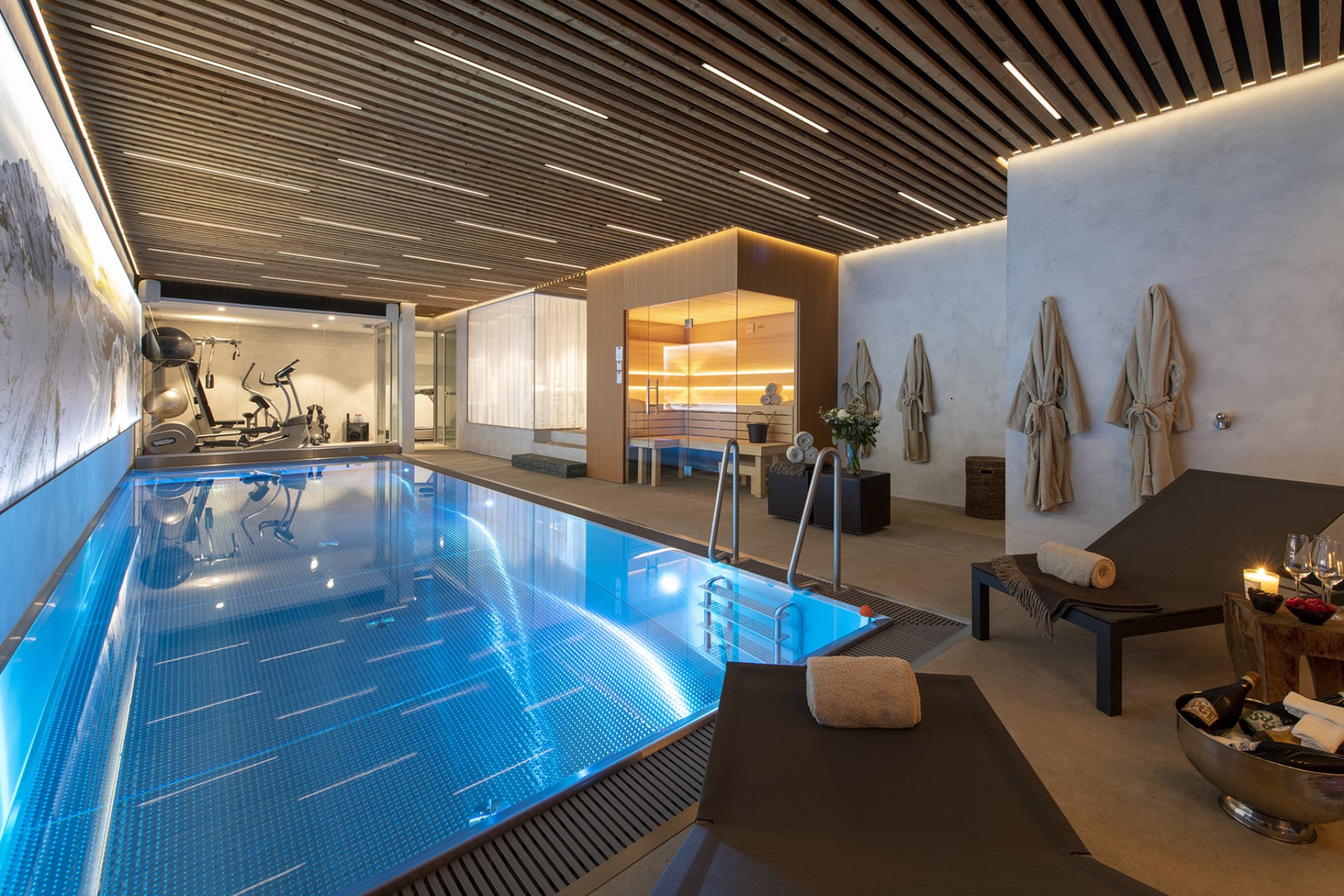 The chalet also boasts an indoor swimming pool with ambient lighting beside huge glass windows offering spectacular views. Adjoining the pool area is a fully-equipped gym, a bio-sauna with mountain views, and a massage and treatment room for true relaxation.