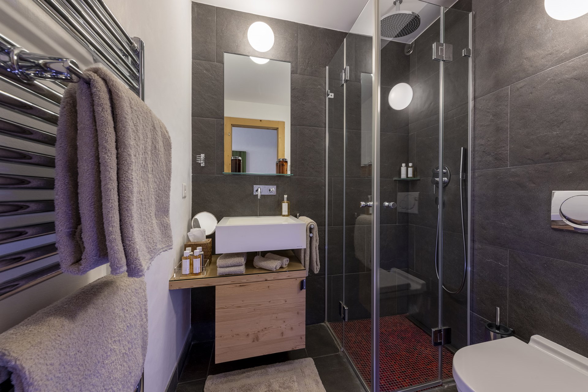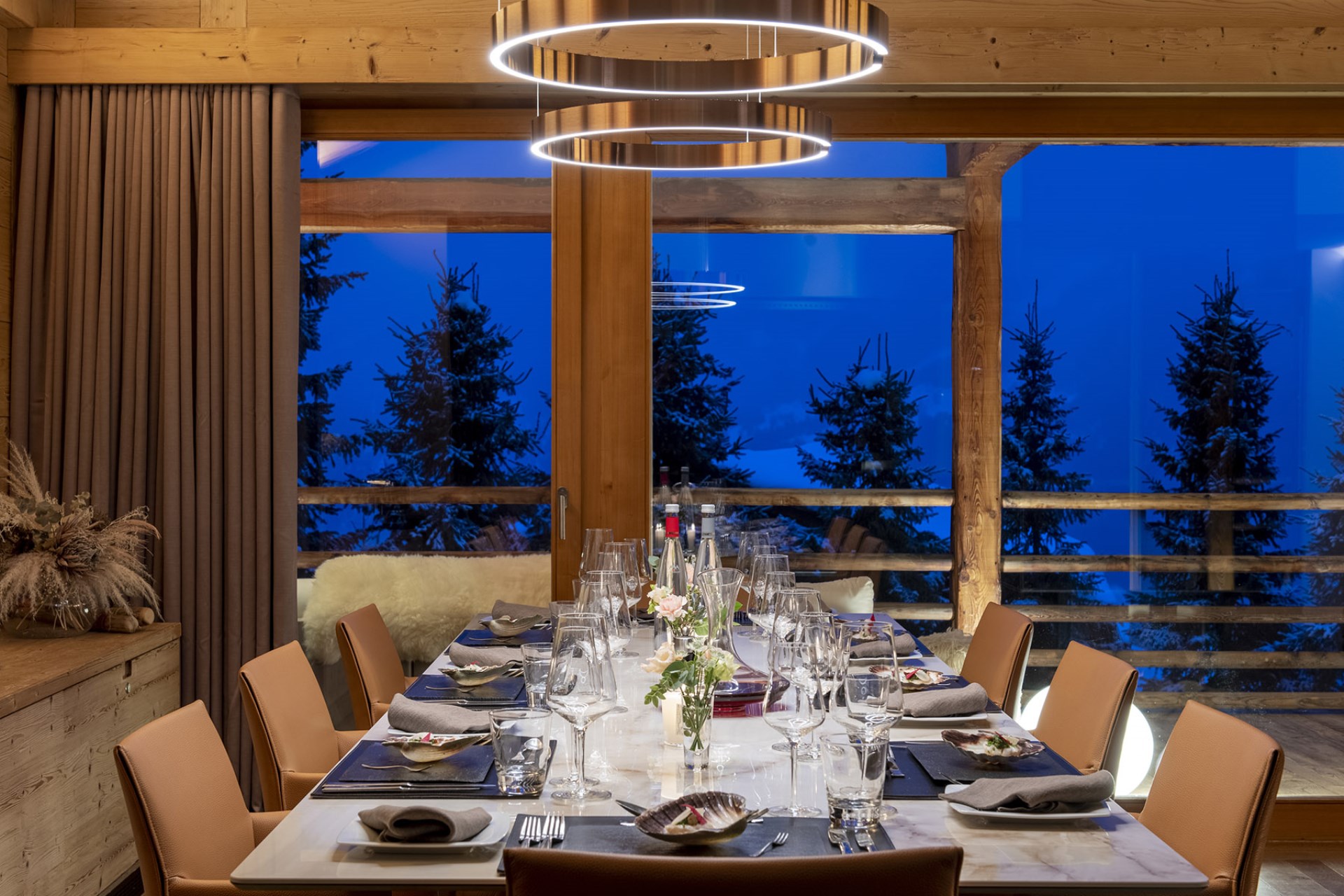There is a welcoming atmosphere throughout the chalet, thanks to the mix of warm colours and highest-quality furnishings. The spacious living area with its plush sofas and a central fireplace is ideal for gathering the whole family and enjoying time together, whilst gourmet meals will be enjoyed in the elegant dining area.