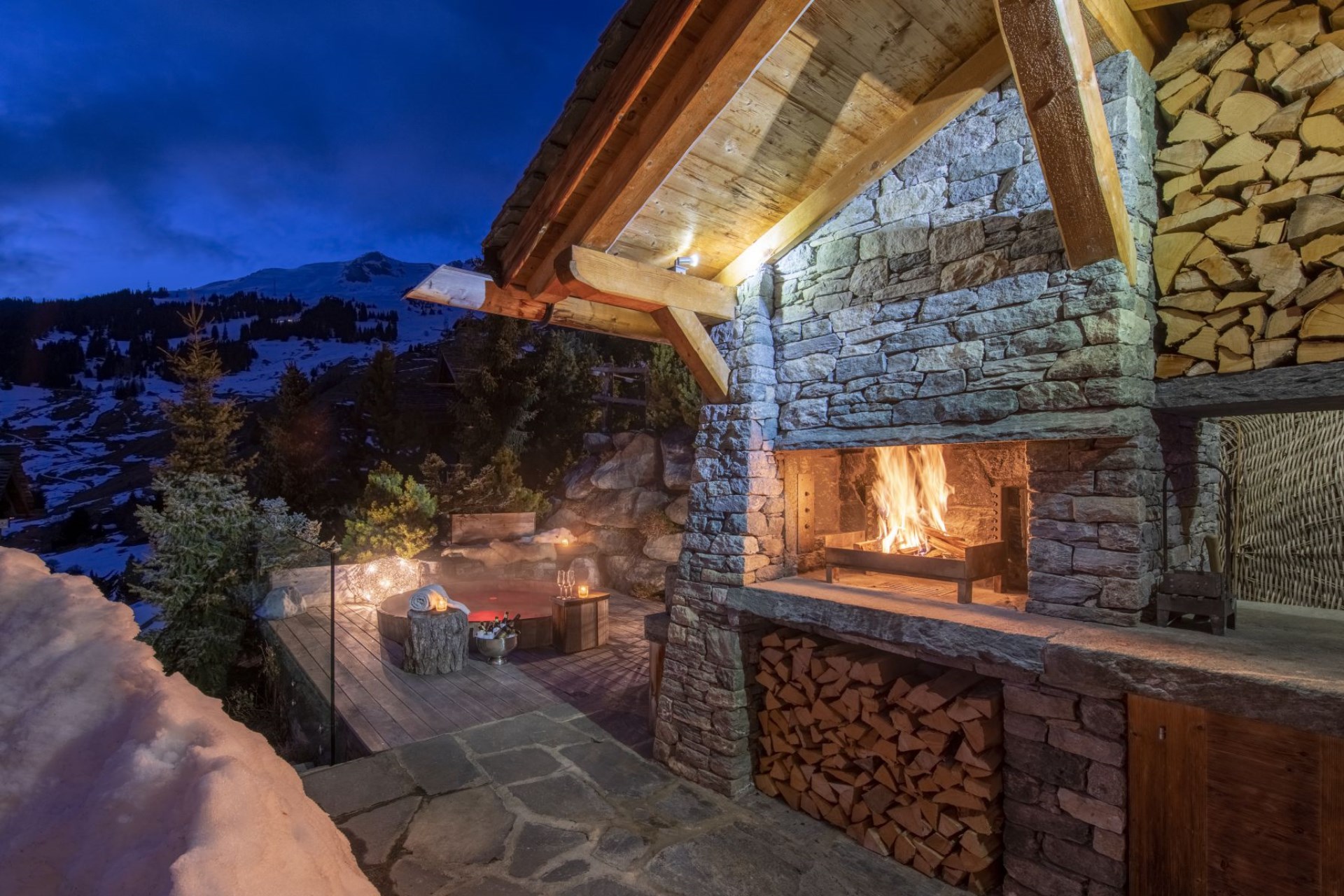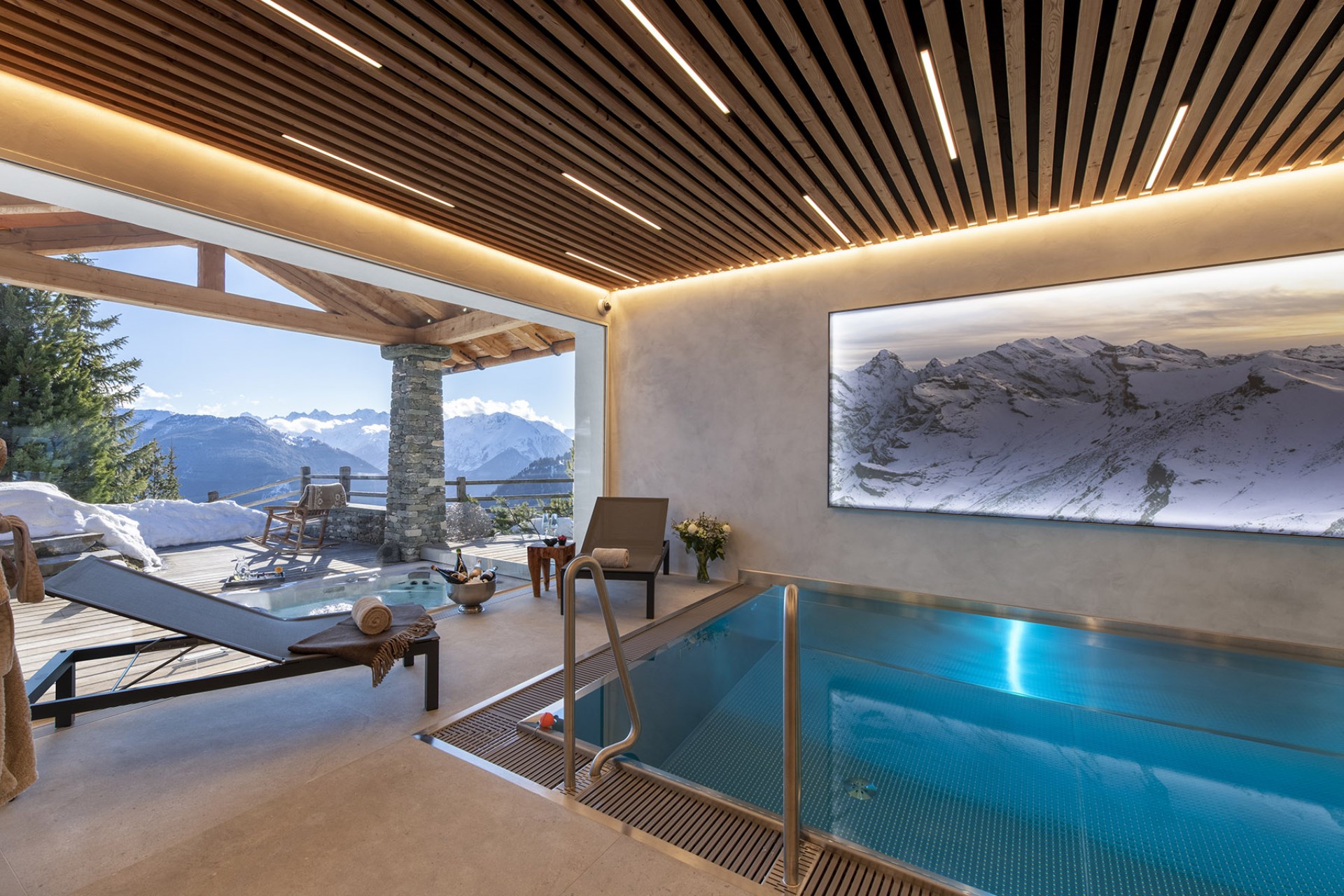 A stylish chalet with an indoor swimming pool and private spa, plus an outdoor Jacuzzi with a view