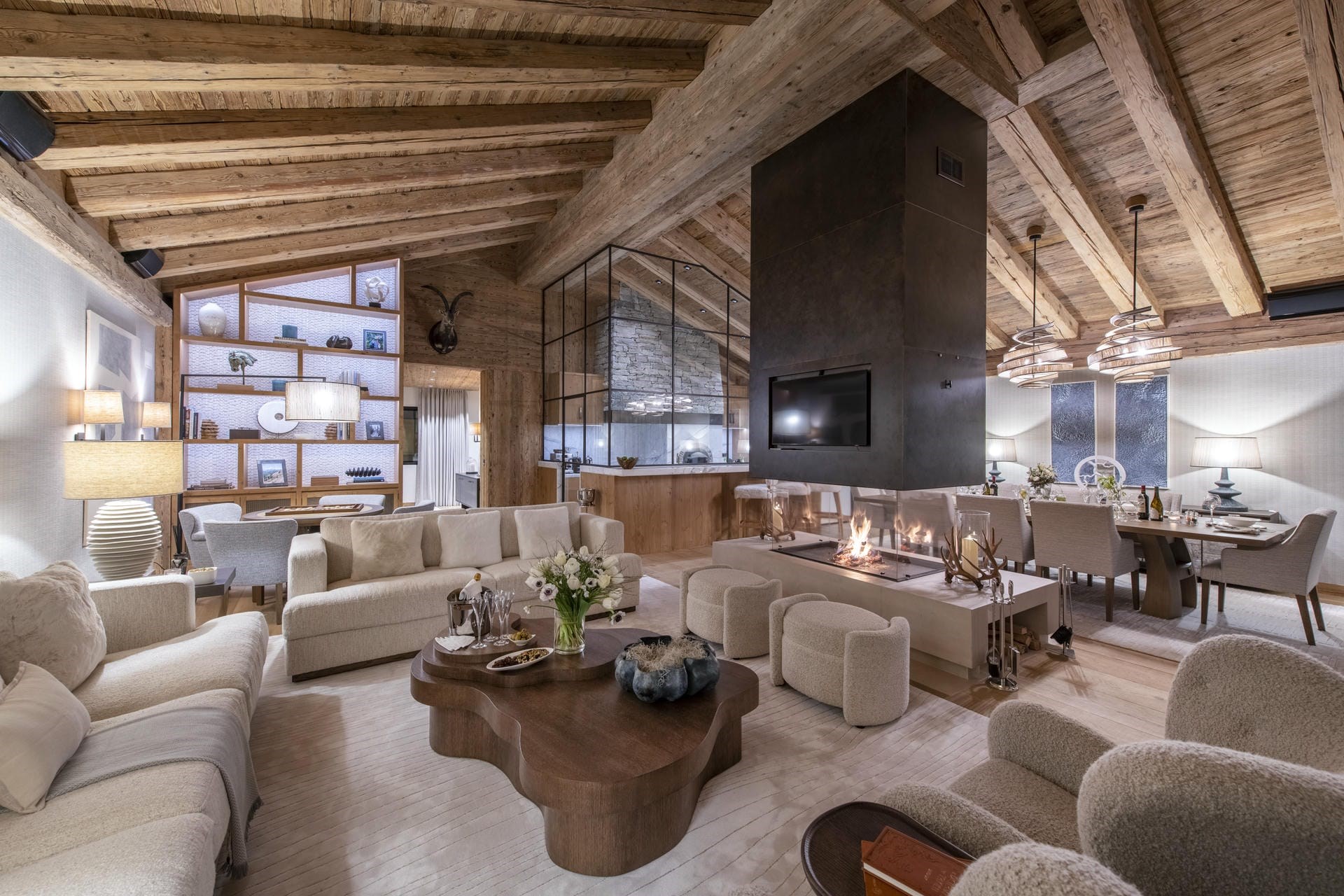 Sprawling over four floors connected by a lift, the chalet can accommodate up to 12 guests. On the top floor, the chalet boasts a large living and dining area, with a fine fireplace creating the central focal point. This ample living environ is complemented by striking views of the surrounding mountains.