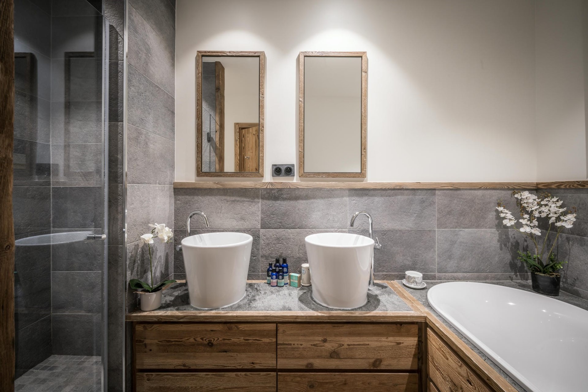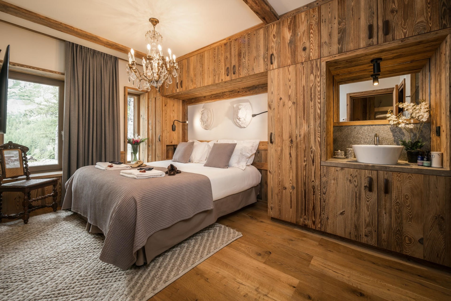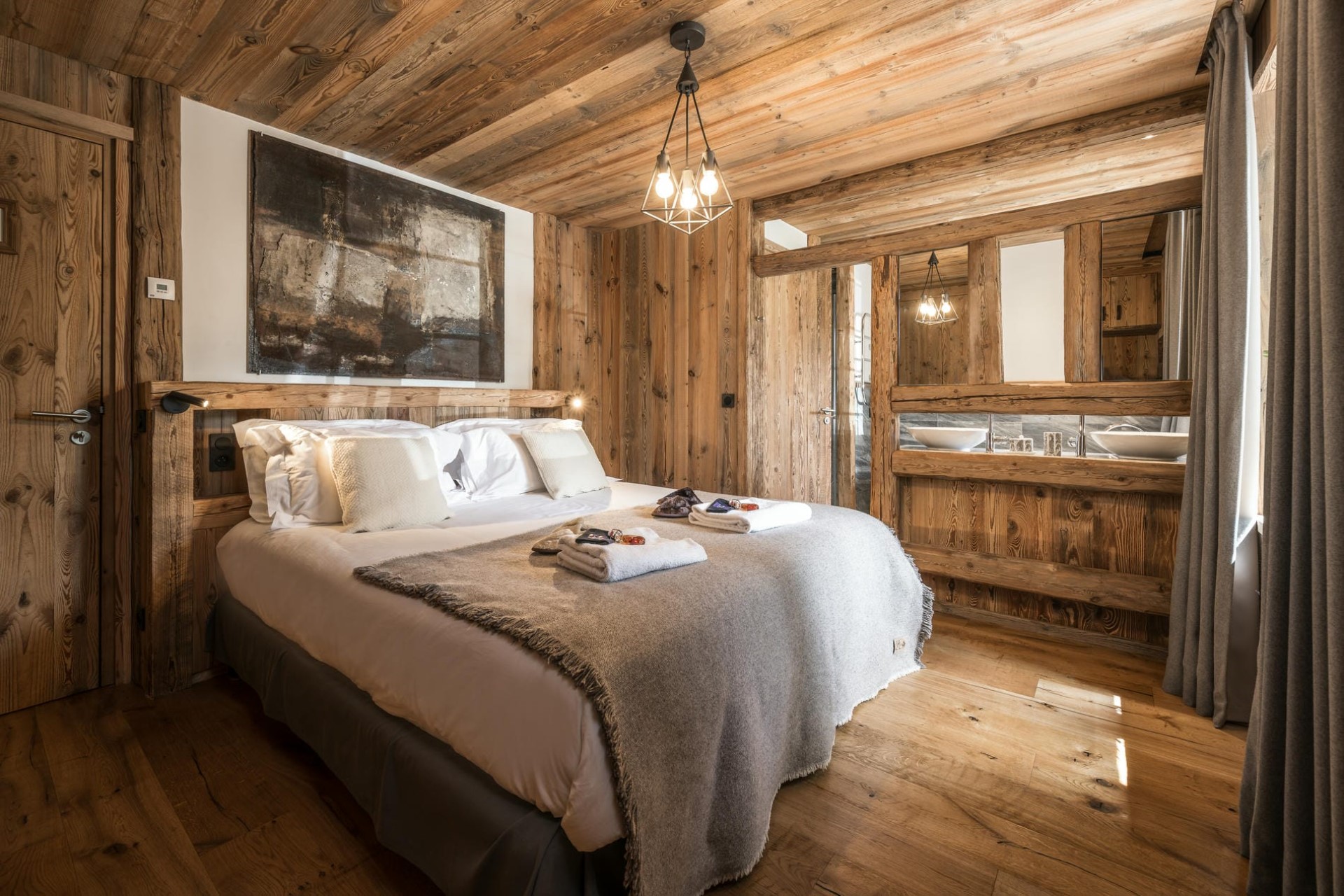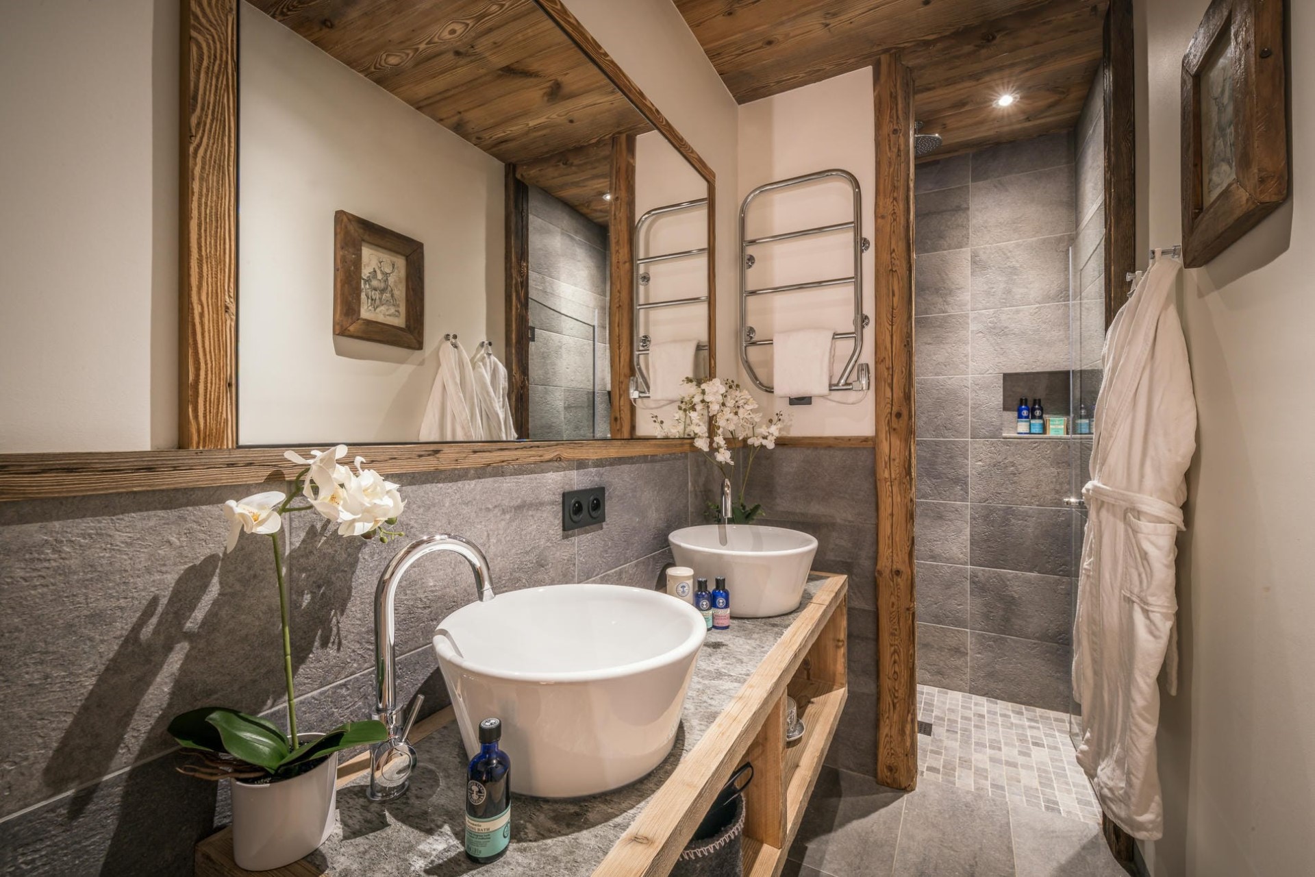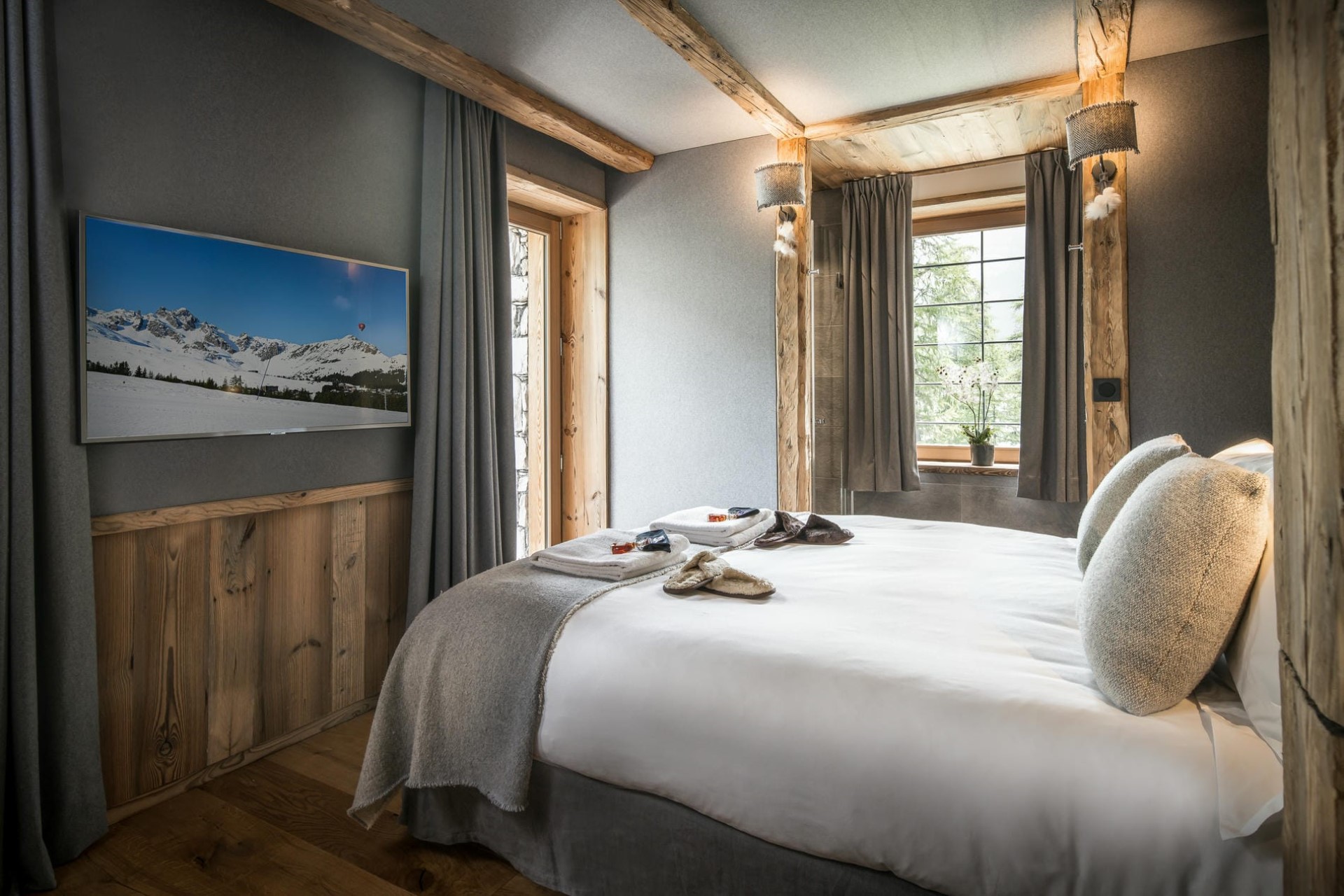 The chalet sleeps up to 14 adults plus one child across six individually designed bedrooms. Every bedroom features a beautiful en-suite bathroom, and several rooms – including the spacious master suite – offer access to mountain-view terraces. The layout is perfect for multi-generational groups, with a family suite on the lower-ground floor that combines two double bedrooms, and an adjoining bunk room for up to two children.