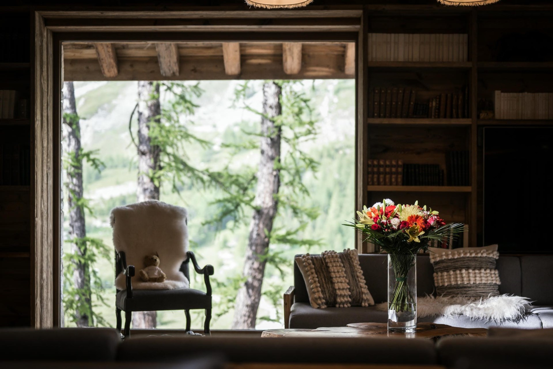 An impressive stone fireplace is surrounded by plush, oversized sofas, inviting guests to relax with a glass of champagne after a day on the slopes. Guests can savour hearty meals prepared by the private chef in the dining area, which is adorned with elegant statement lighting.