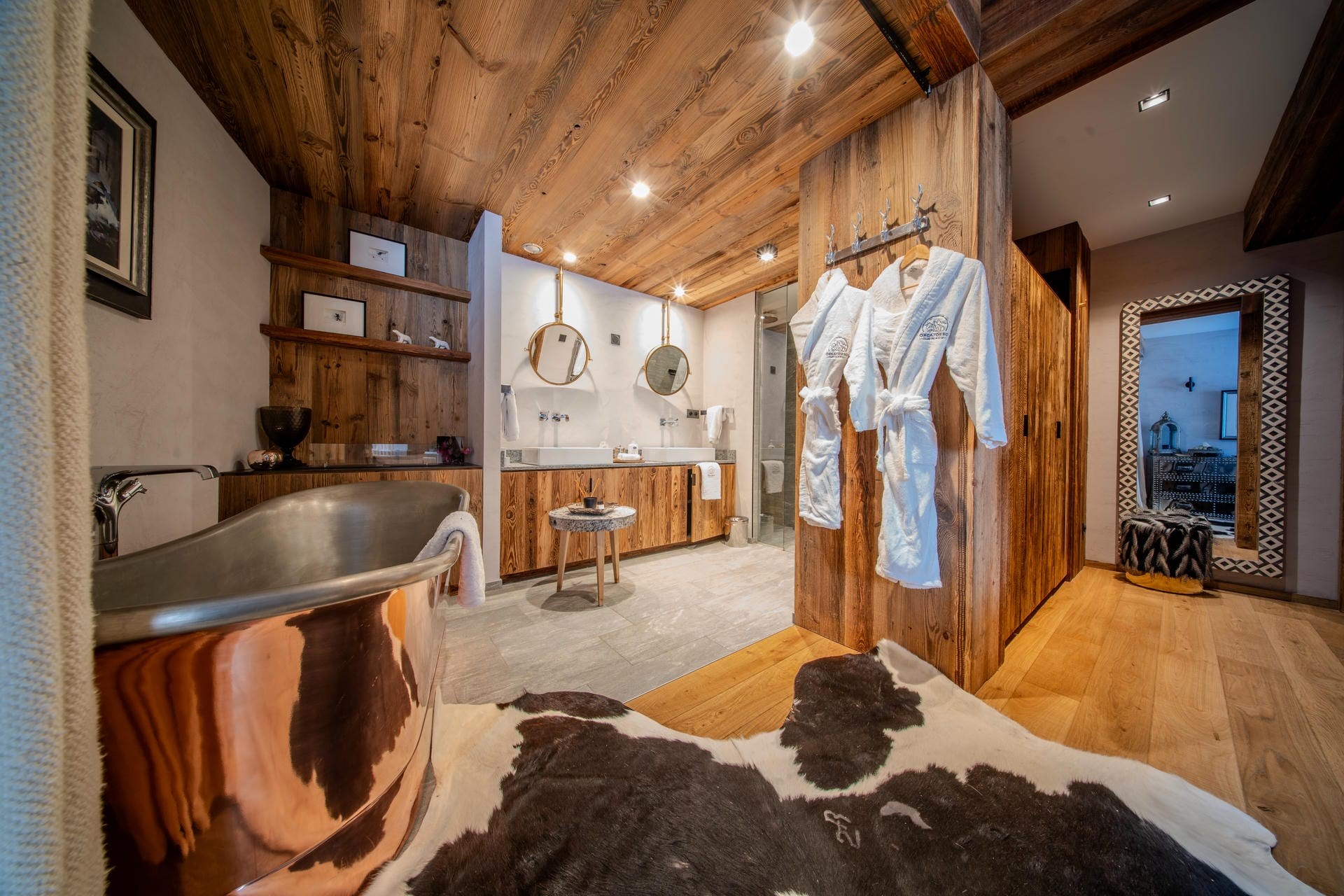 The chalet comfortably accommodates up to 12 adults and two children across its five well-appointed bedrooms. The sleeping quarters exude an exclusive alpine flair, featuring refined wooden interiors and sumptuous furnishings. The master suite is a particular highlight, boasting an ethanol fireplace, a stylish copper bathtub, and a private balcony with stunning views. Younger guests are well catered for with a dedicated family suite featuring two double beds and overhead single bunks.