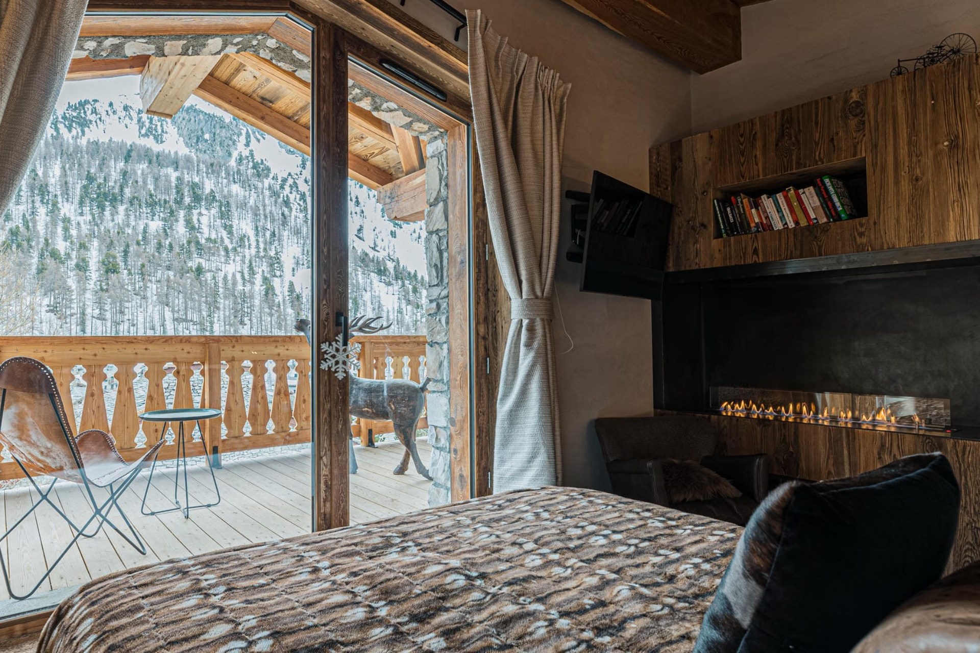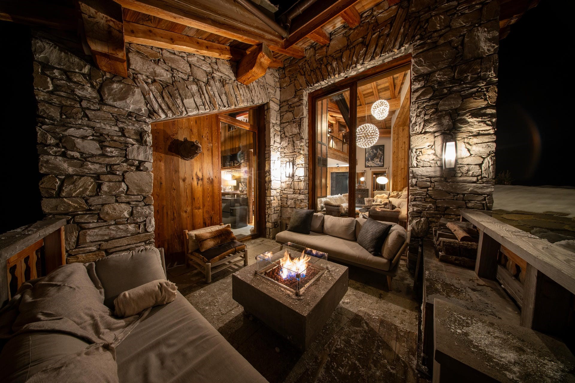 An outdoor terrace with a brazier offers the ideal spot to enjoy an après-ski drink while taking in the breathtaking mountain scenery.