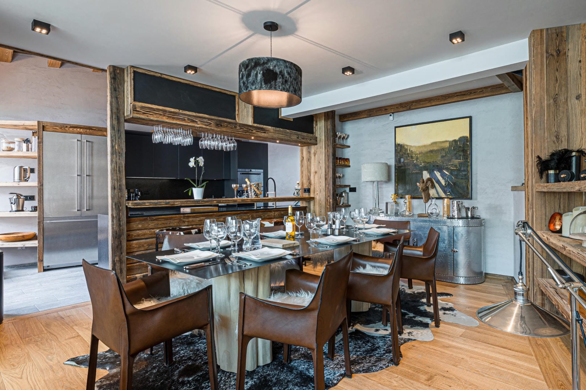 Behind the lounge, an elegant dining table offers space to enjoy hearty, chef-prepared meals. A charming wooden bar separates the dining area from the semi-open kitchen, which is fully equipped with modern appliances.