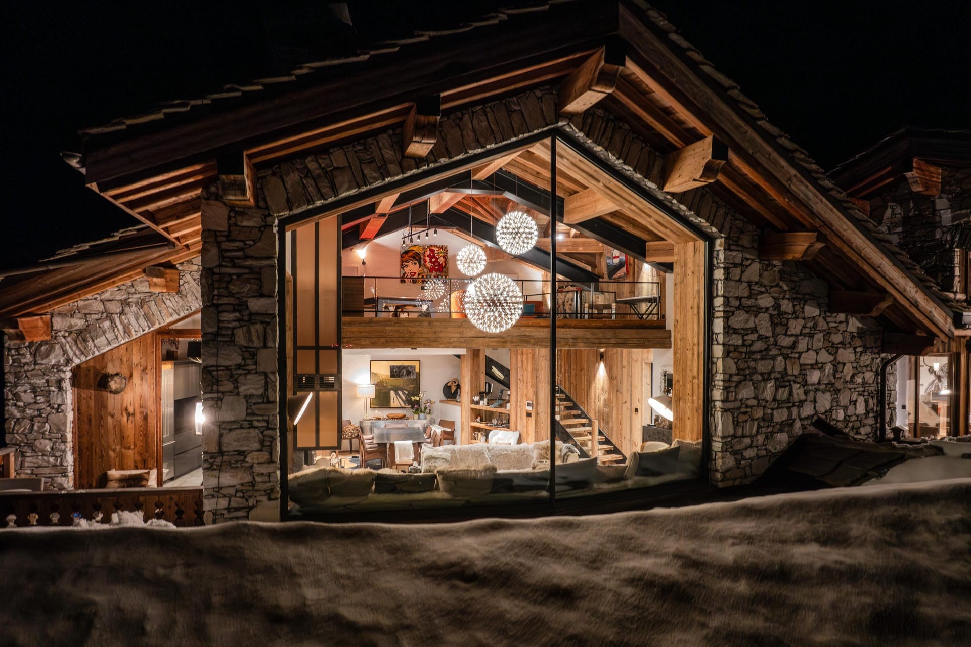 Adjacent to the terrace is the chalet’s main living area, which boasts soaring double-height ceilings and large windows that fill the space with natural light. The area features plush seating and a crackling fireplace with three glass sides, creating a cosy atmosphere perfect for relaxing with a glass of wine or a hot cup of cocoa while enjoying panoramic views of the Alps.