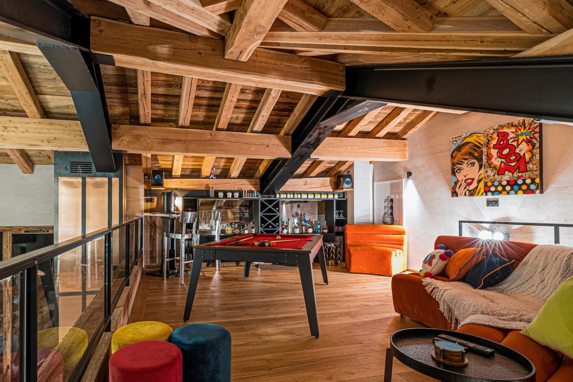 Beyond the main living spaces, the chalet features a mezzanine level dedicated to entertainment. Overlooking the lounge, this cosy hub features a small bar, a TV area, a pool table, and a collection of board games. It serves as the perfect spot for après-ski activities and evening relaxation for guests of all ages.