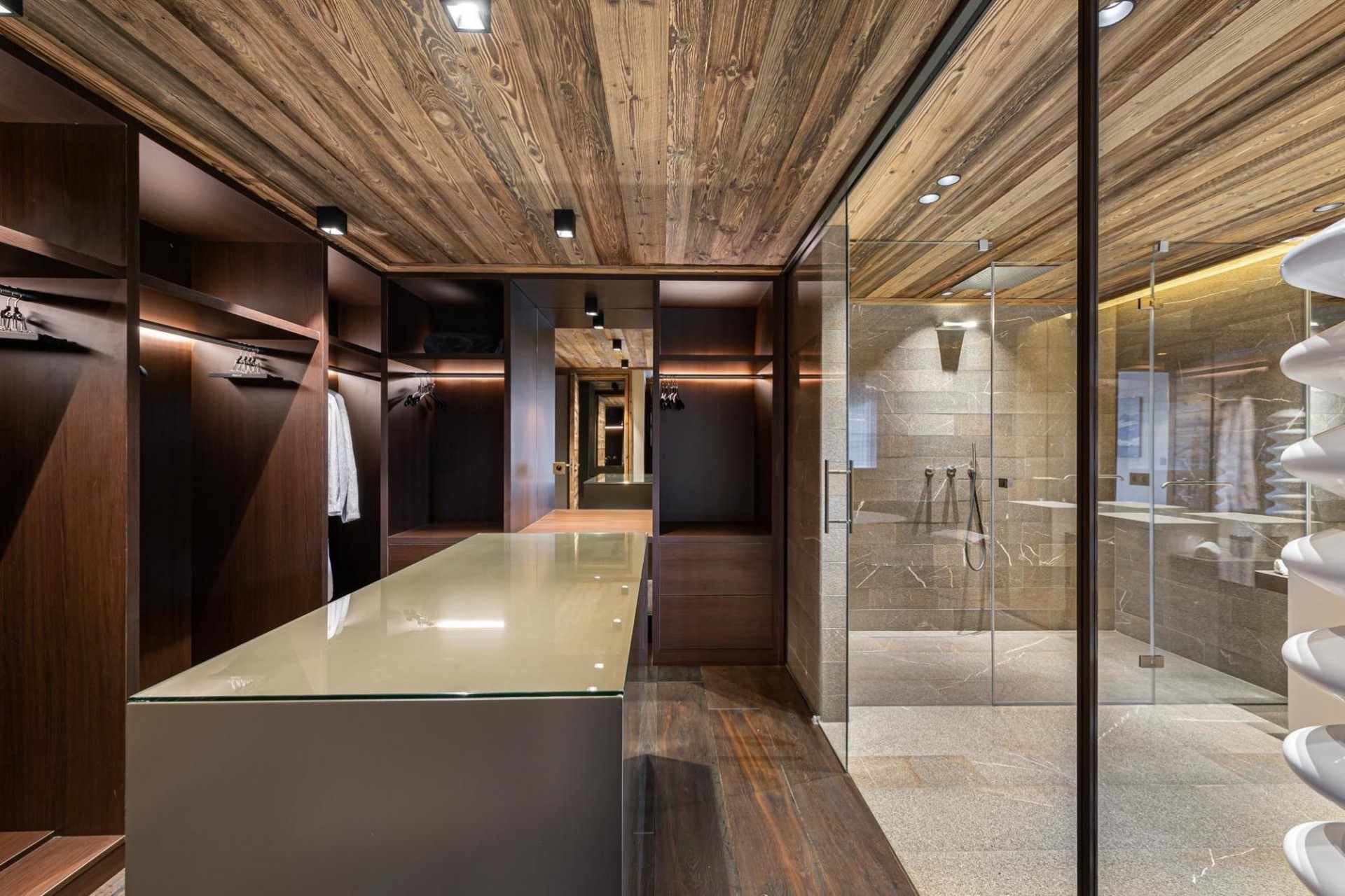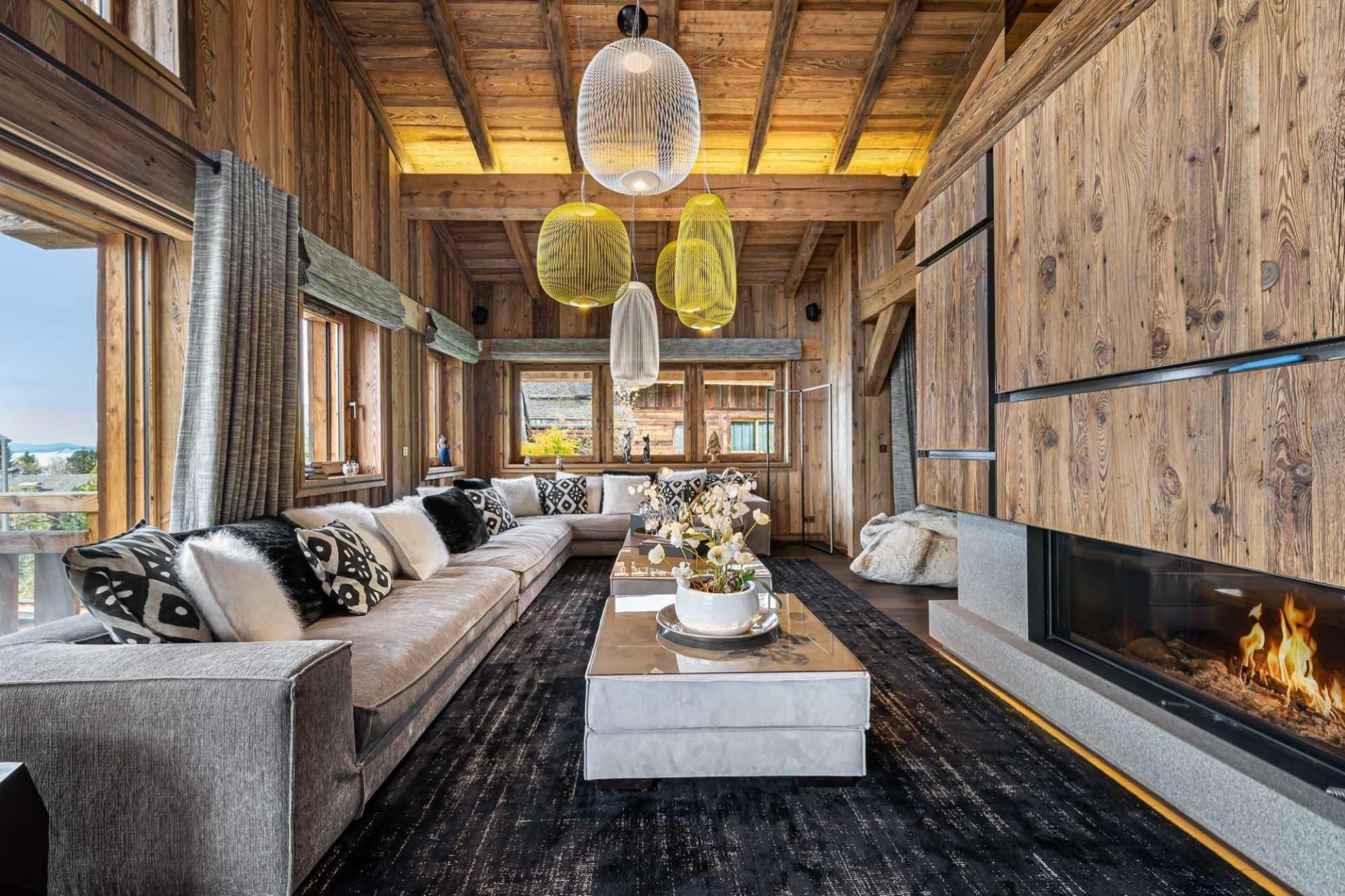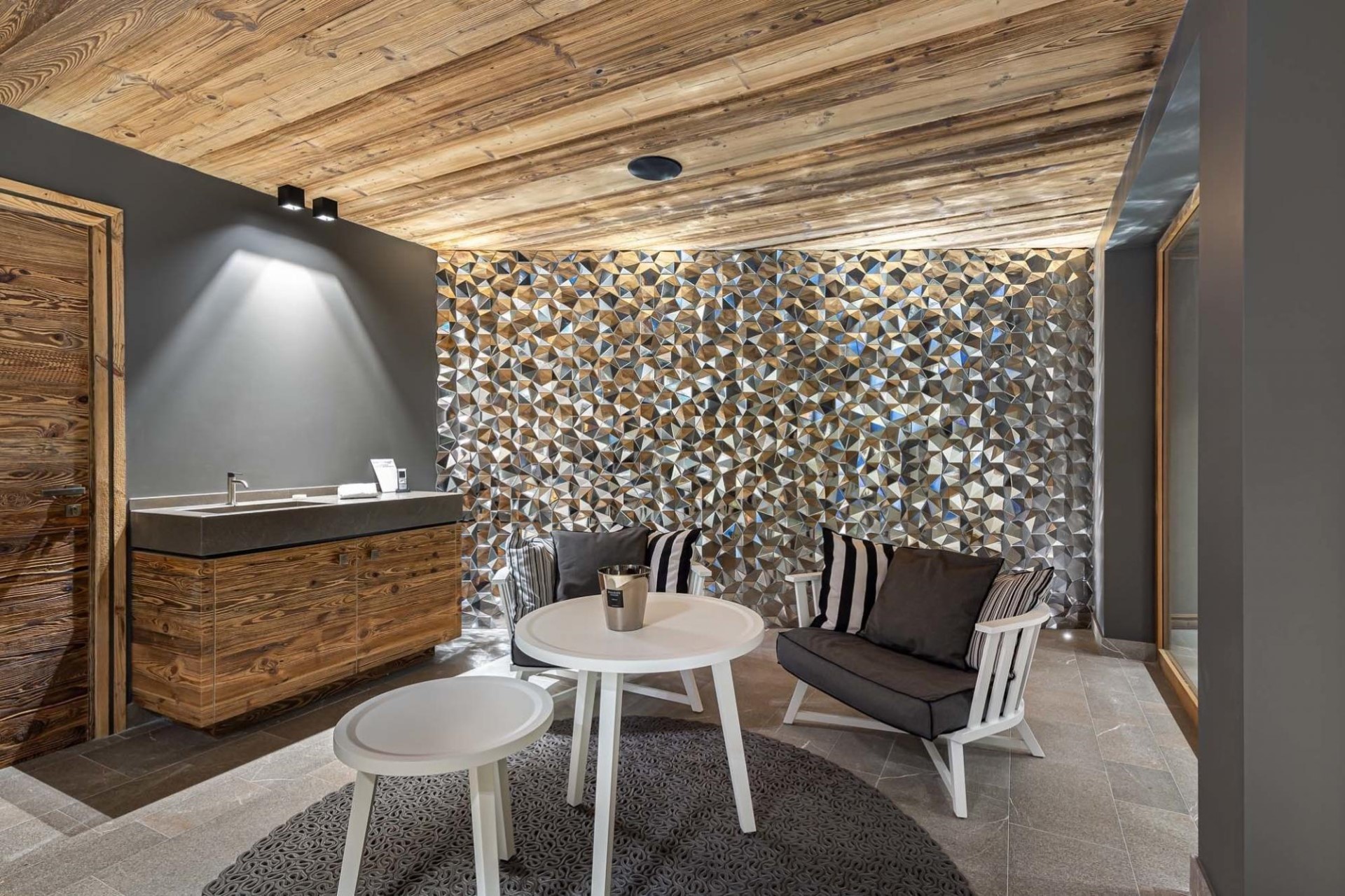 A lift connects the floors, ensuring accessibility across the chalet. Every detail has been considered, from boot warmers in the ski room to quiet nooks for reading.