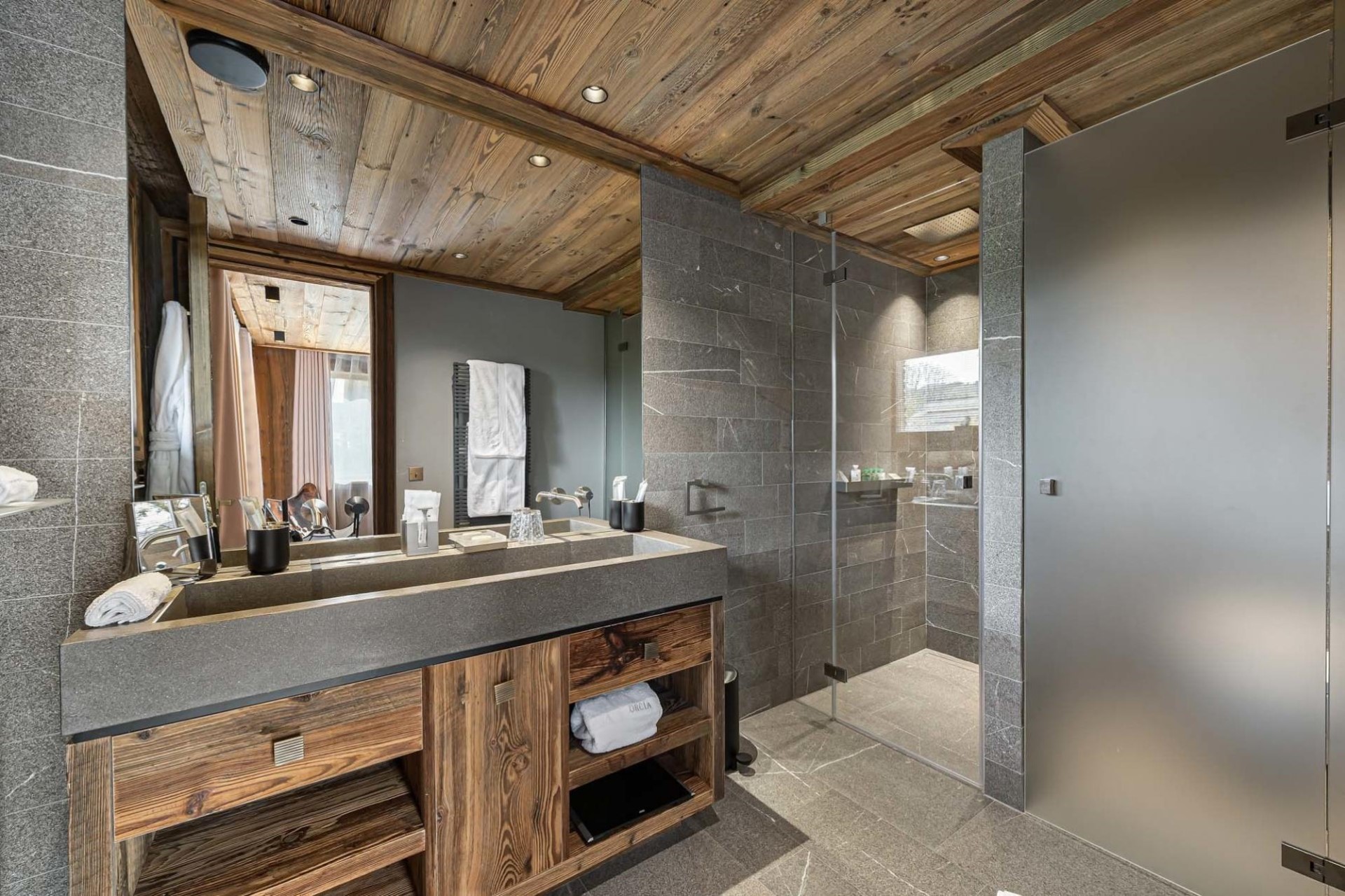 There are six generously sized bedrooms, comfortably sleeping up to 15 guests. The master suite is exceptionally spacious, with its own sitting area, dual dressing rooms, a large en-suite, and direct terrace access. Four further en-suite double bedrooms are thoughtfully positioned across the chalet. Finally, a bunk room with two sets of bunks and a trundle bed offers an ideal solution for younger guests, with its own bathroom and plenty of space.