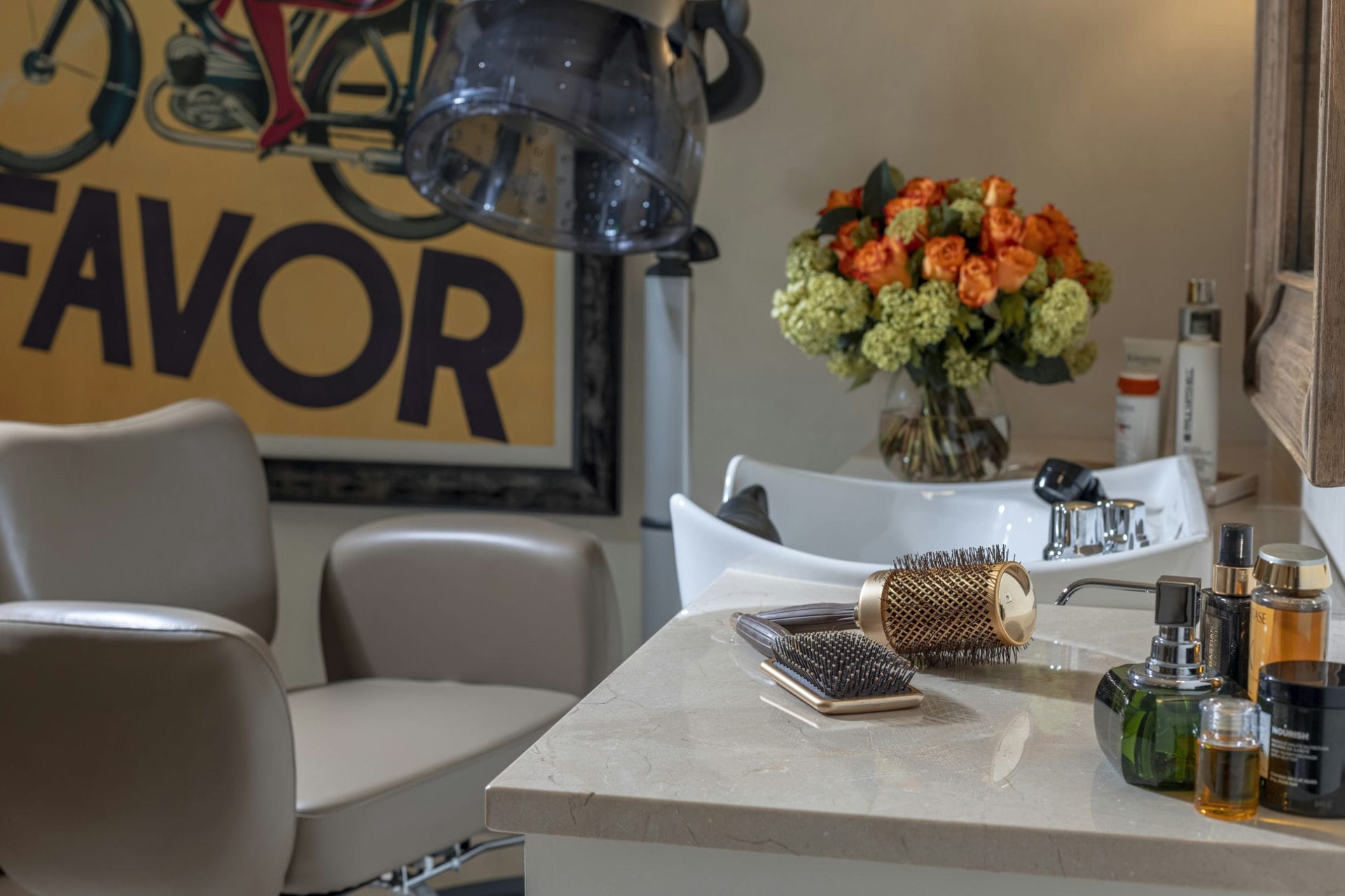For those keeping up with their fitness during their stay, the pool house features a fully-equipped gym, a spa treatment area for post-workout relaxation, and a nail and hair salon. A separate clubhouse is a short walk away, offering a yoga and spin studio adjoining an outdoor tennis court.
