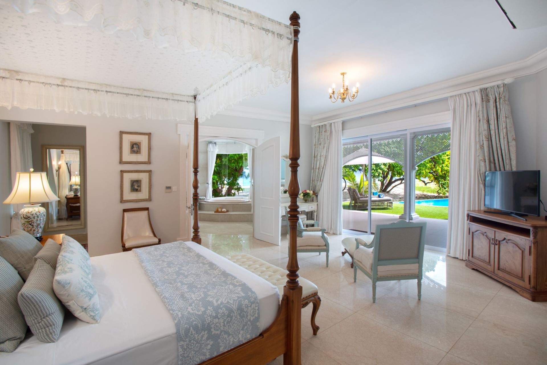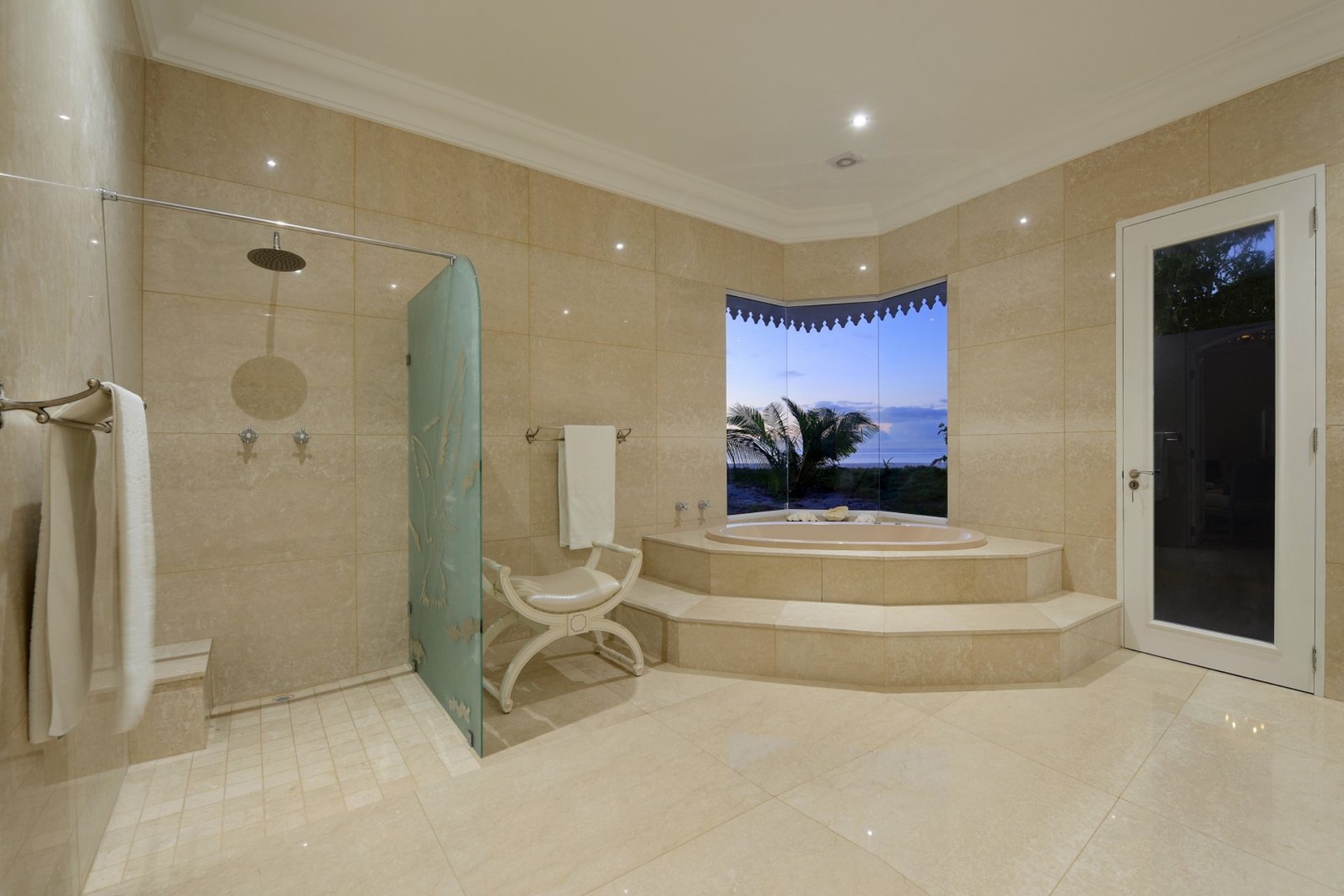 Bedroom 1 – king-size bed, dressing room, en-suite bathroom with Jacuzzi bathtub & separate shower + outdoor shower, and terrace access