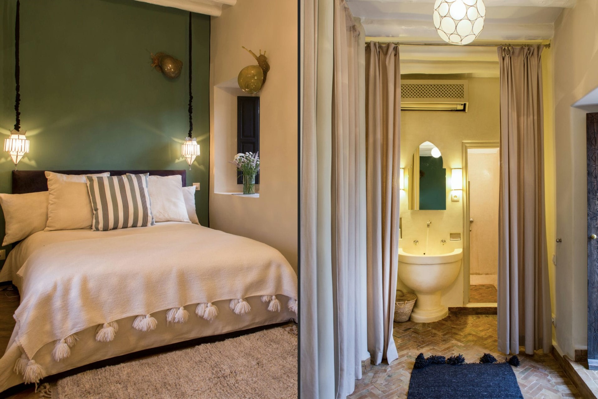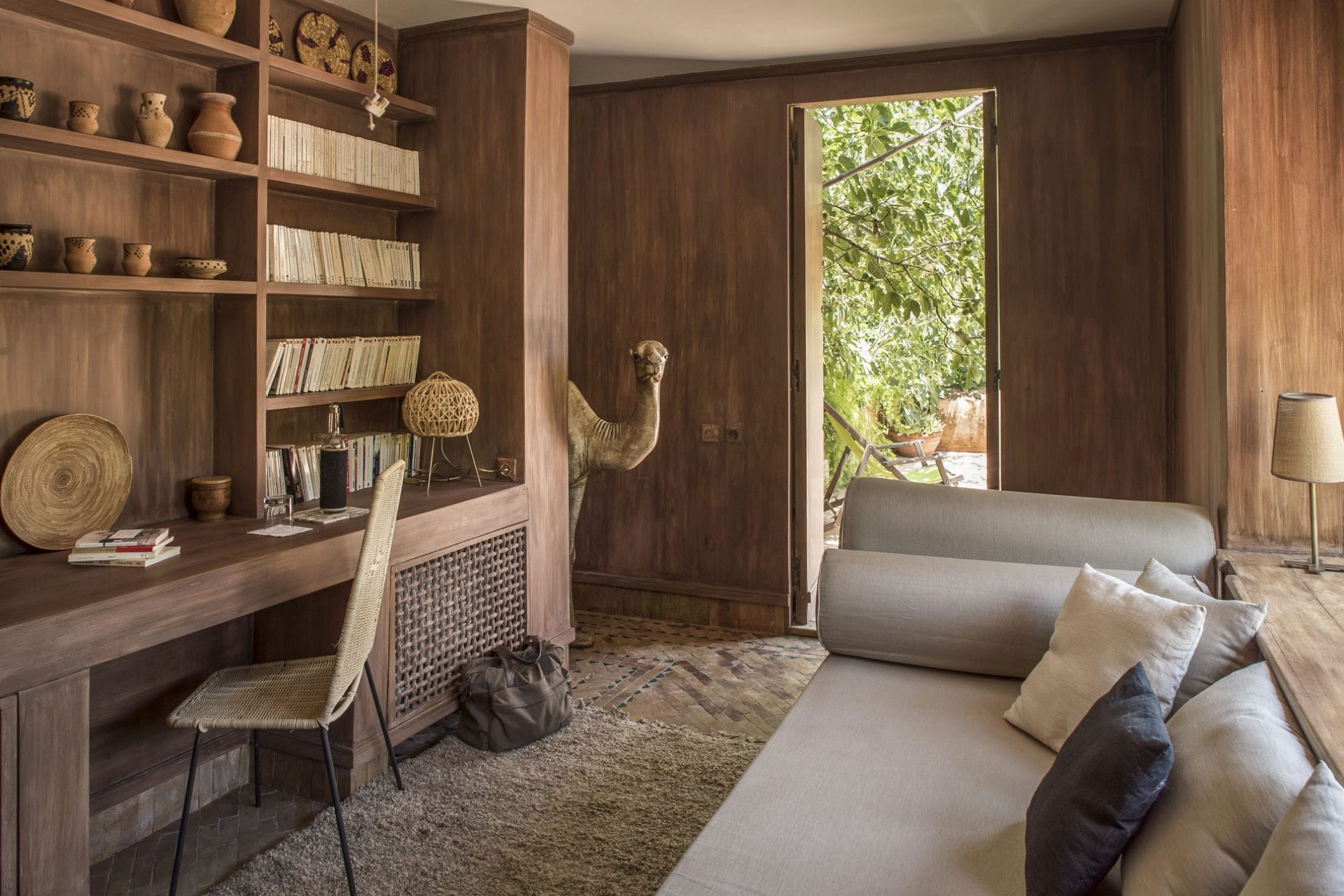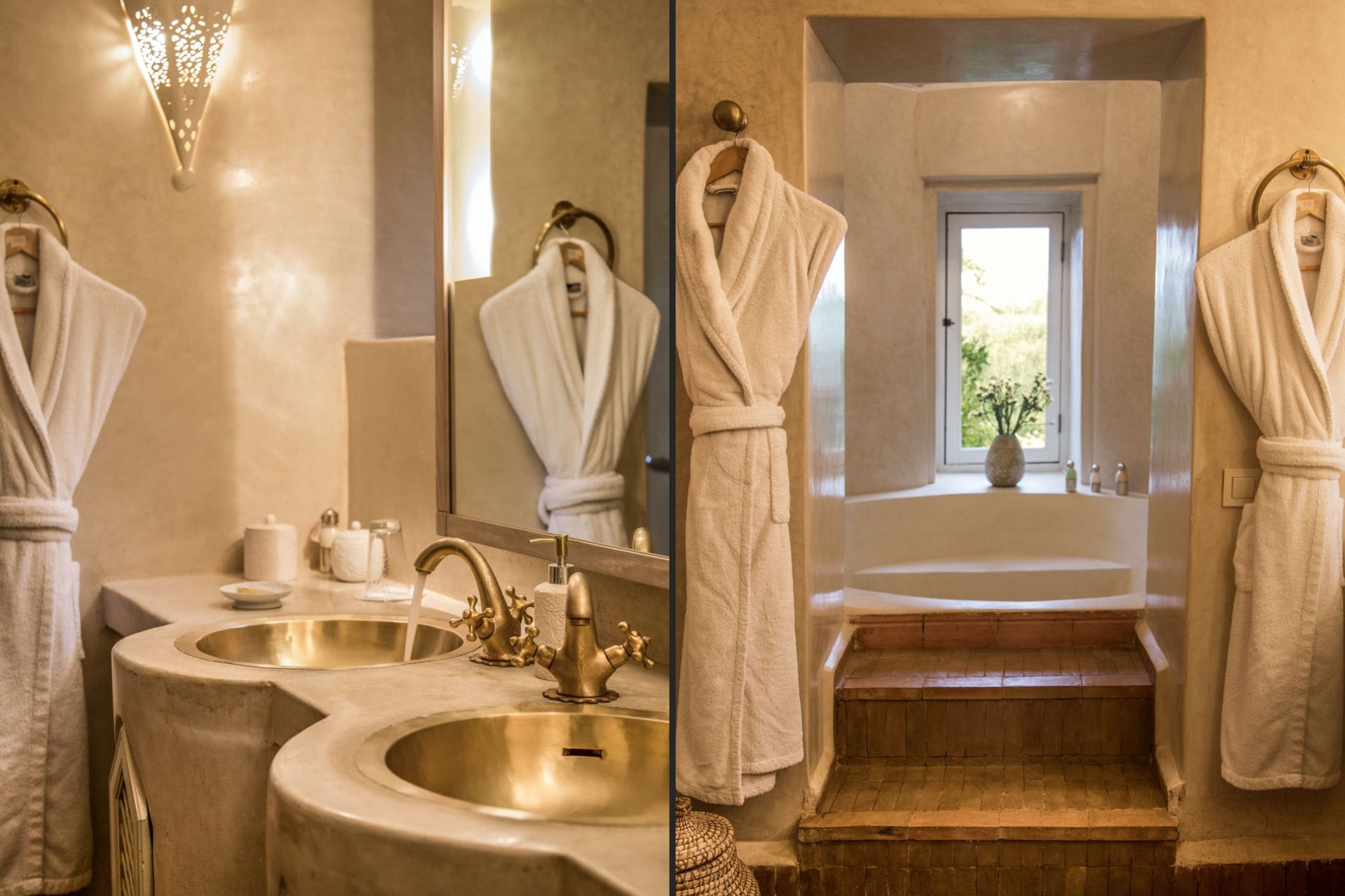 Riad Suite – king-size bed + annex with second king-size bed (converted to twins on request), sitting area with woodstove, en-suite bathroom with bathtub + outdoor shower, private terrace & garden, and private patio with lounge area