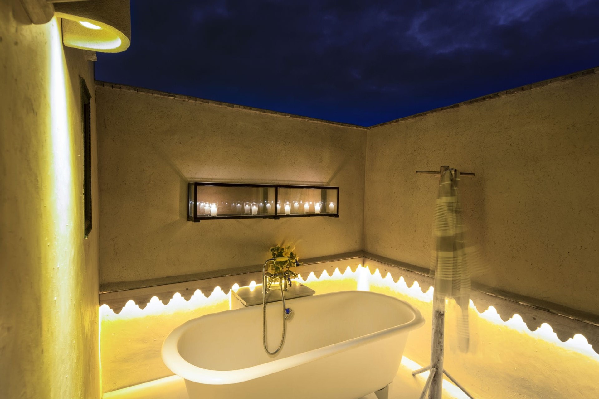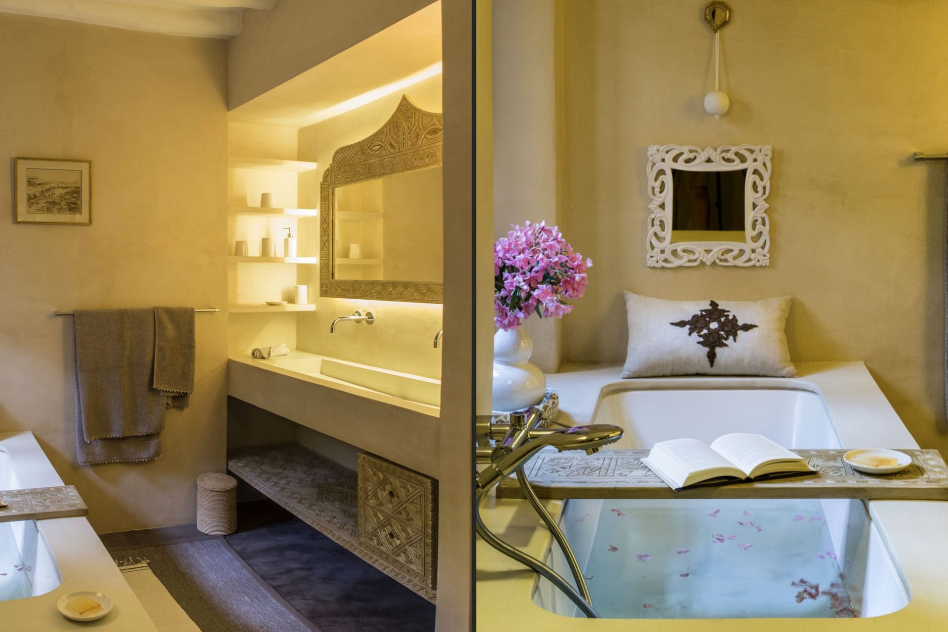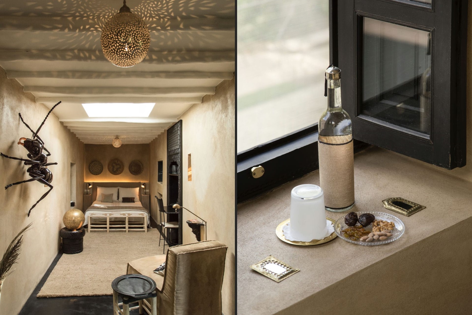Riad Suite – king-size bed + annex with second king-size bed (converted to twins on request), sitting area with woodstove, en-suite bathroom with bathtub + outdoor shower, private terrace & garden, and private patio with lounge area