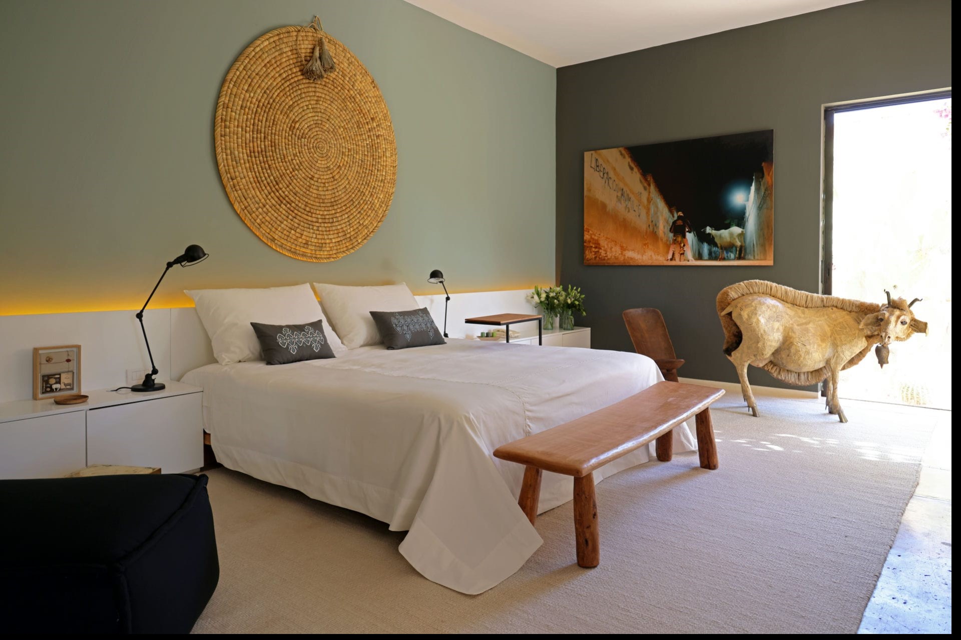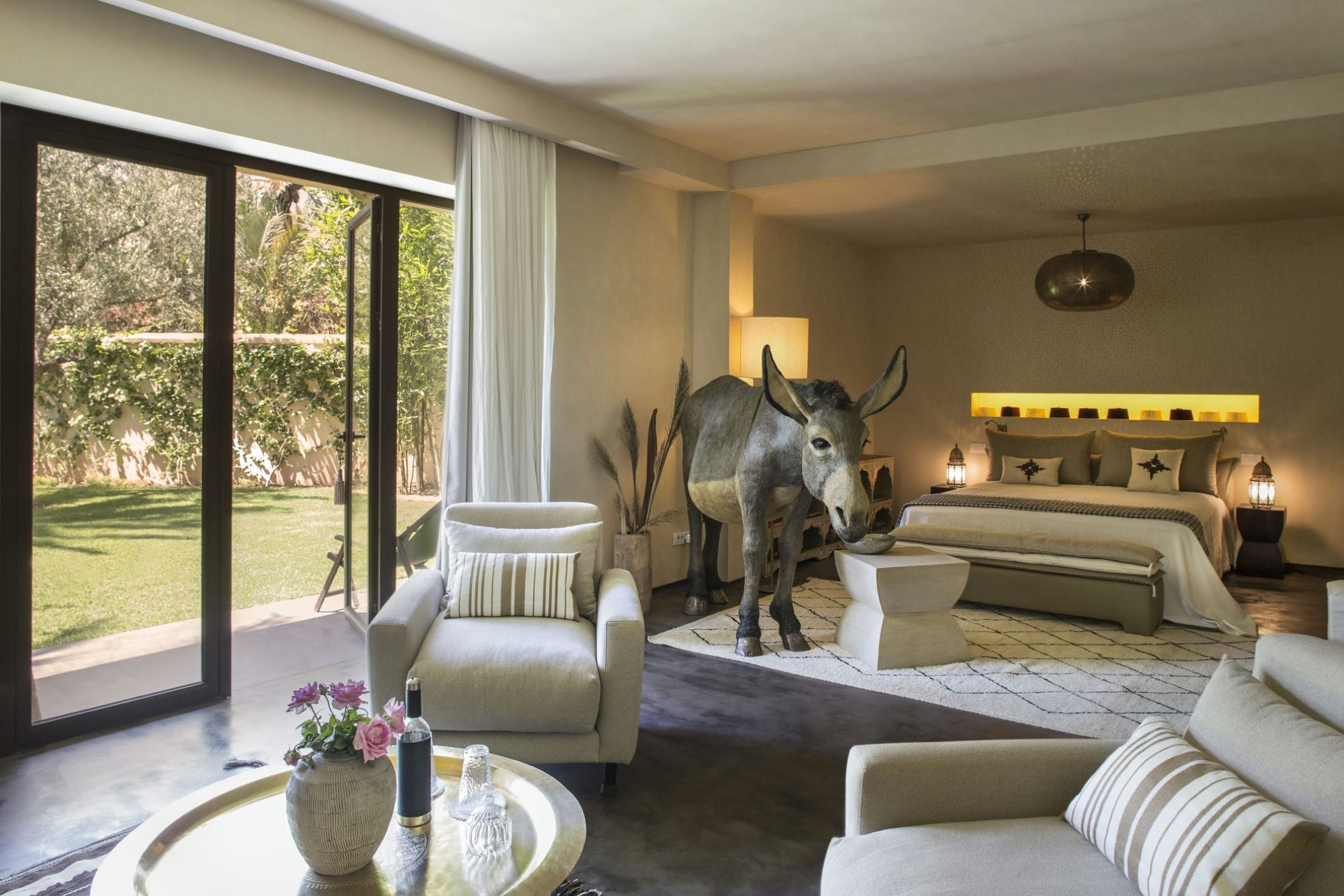 Realistic but friendly animal sculptures – designed by renowned visual artist Jean-François Fourtou – are dotted throughout the property. Outside, guests are welcomed by a giant sheep standing beside the large swimming pool, surrounded by sun loungers, an outdoor sitting area, and shady day beds. The perfect place for relaxing with a good book or enjoying a poolside cocktail!