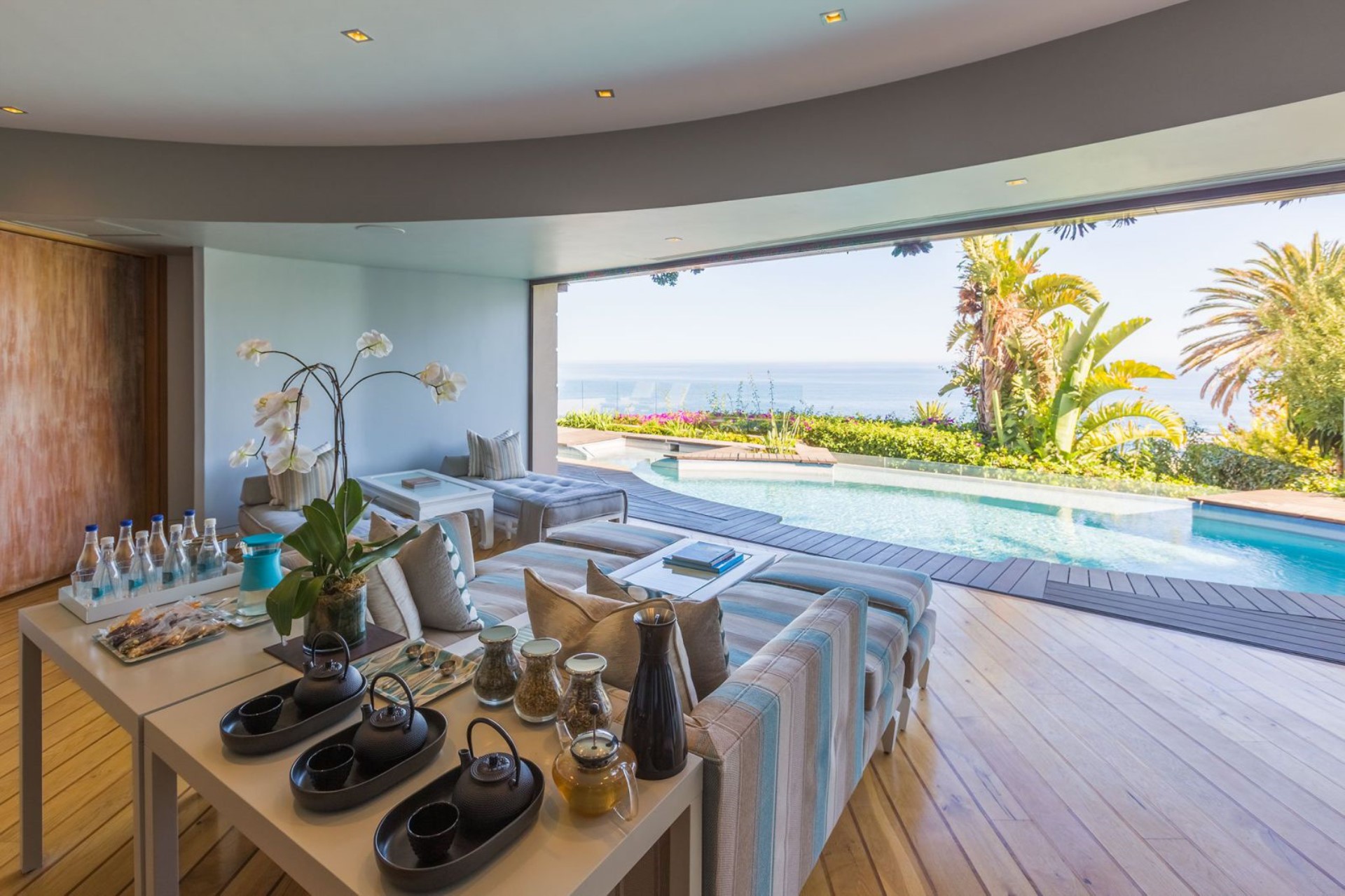 The villa can be booked with either three or five bedrooms. Three bedrooms are on the top level, accessed by a lift or stairs, and all feature spacious en-suite bathrooms with infinity mirrors. The two double rooms offer stunning ocean views, whilst the twin room has spectacular views of the Twelve Apostles in the Table Mountain range.