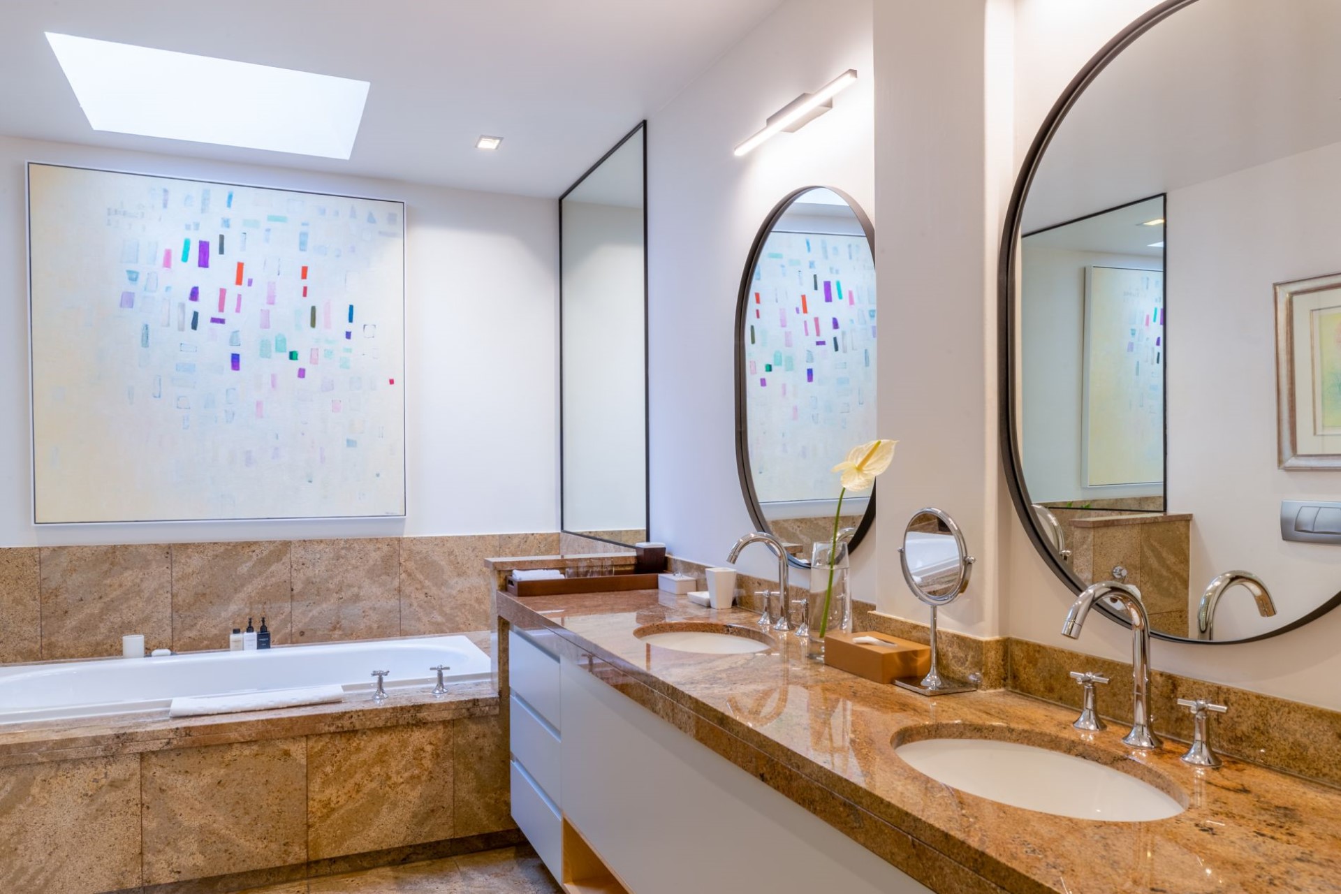 Master Bedroom – king-size bed (converted to twins on request), dressing room, en-suite bathroom with dual vanity, bathtub & separate shower, private balcony, and ocean views
