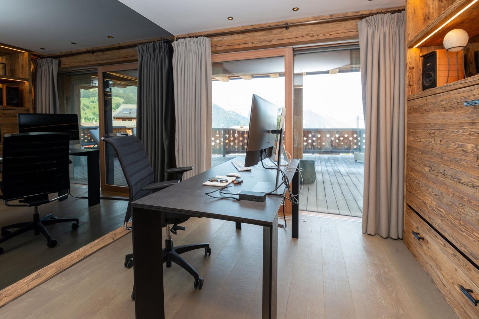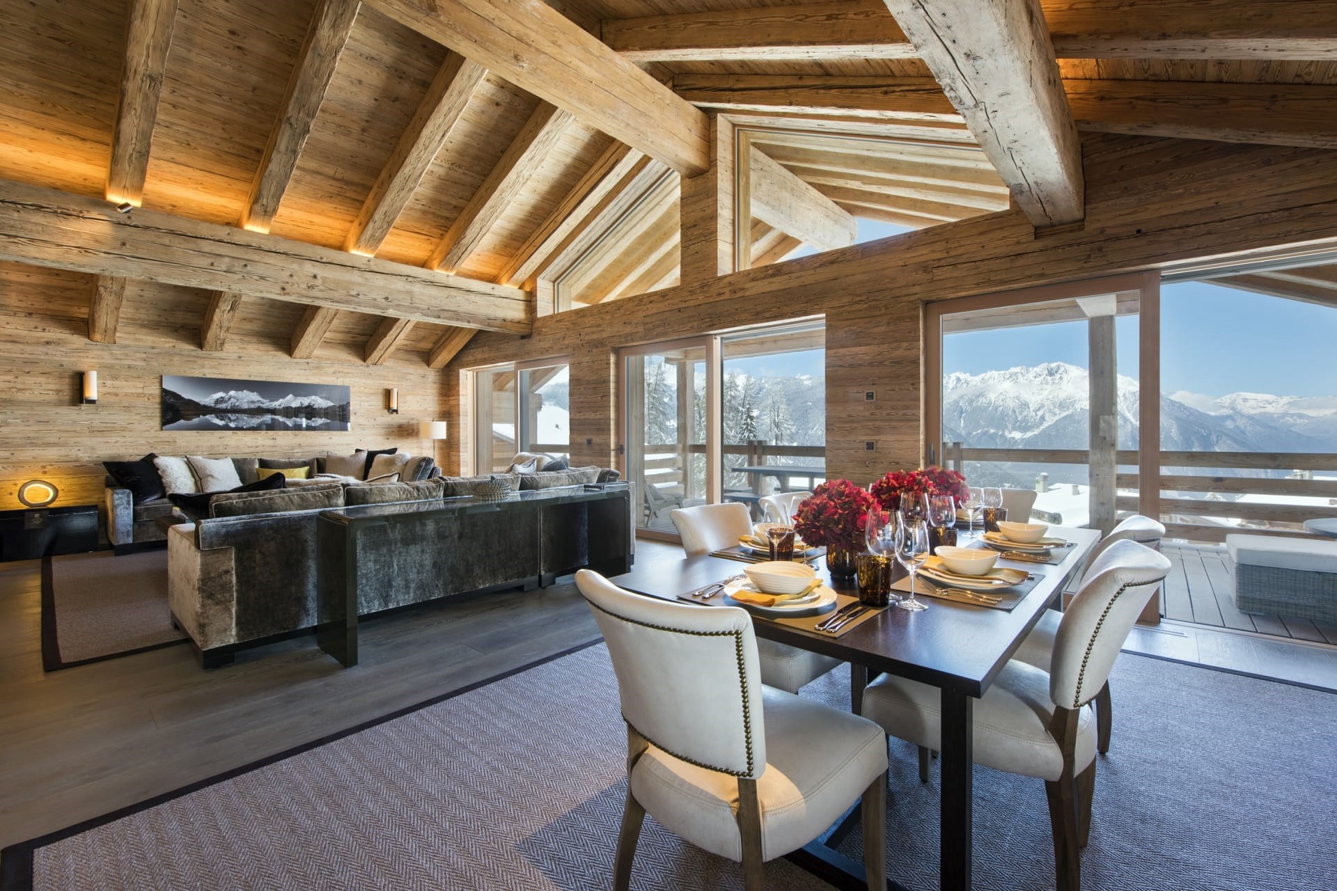 The heart of the home is the double-height living area on the top floor. Glass doors and floor-to-ceiling windows fill the space with natural light and offer breathtaking, cinematic views of the Alps. Guests can unwind on plush velvet sofas gathered around a crackling fireplace, while an elegant oak dining table invites gatherings as snow falls gently outside. This spacious living area also opens onto a large, furnished balcony, perfect for pre-dinner drinks.