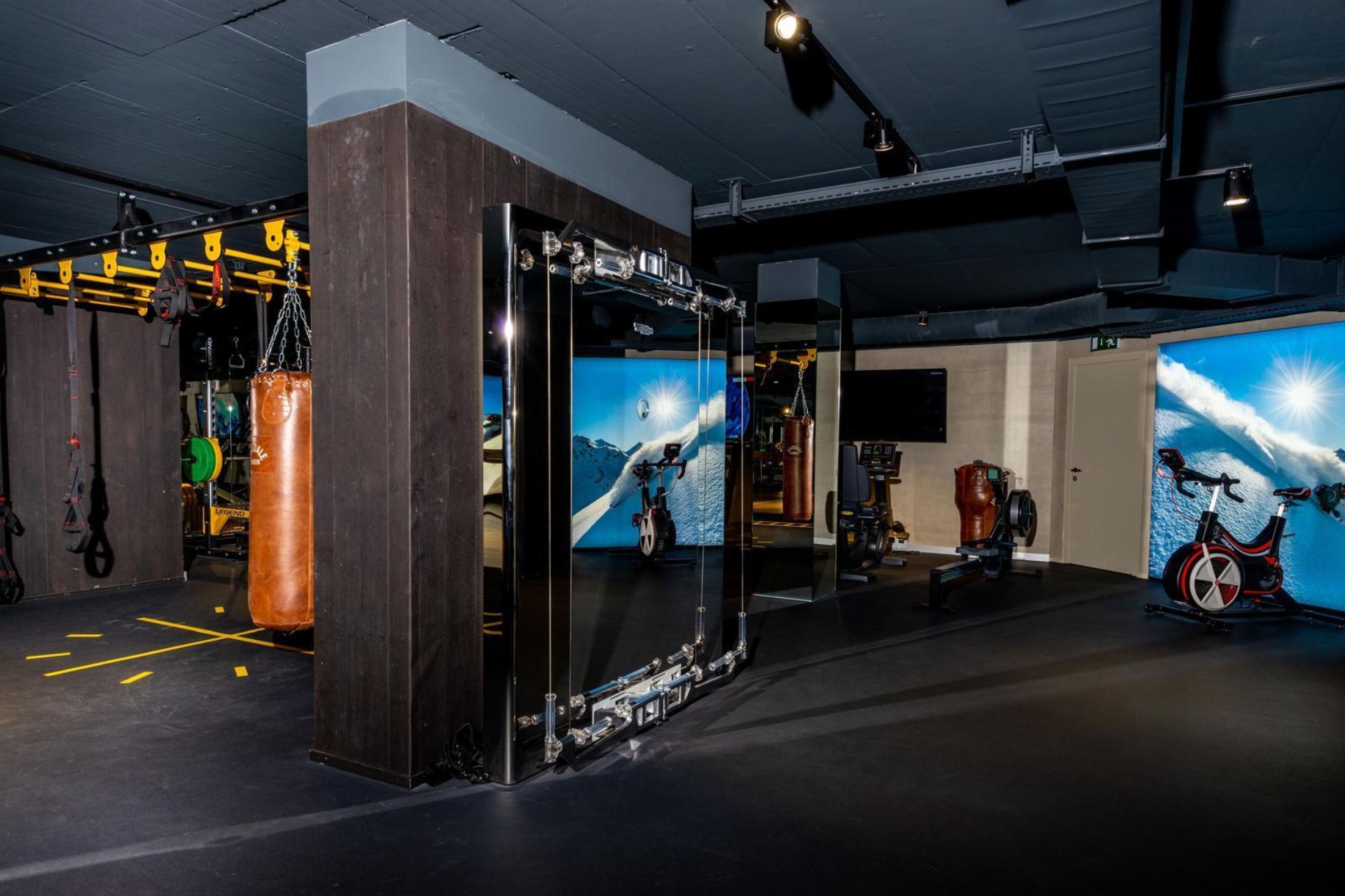 The apartment’s lower floor is focused on wellness and relaxation. It includes a sauna, hammam, and a cold plunge pool, all enveloped in warm lighting and natural stone to create a calming atmosphere. Additionally, guests have access to a spacious shared gym, which provides a comprehensive workout experience with modern cardio machines, functional training areas, free weights, and a dedicated studio space.