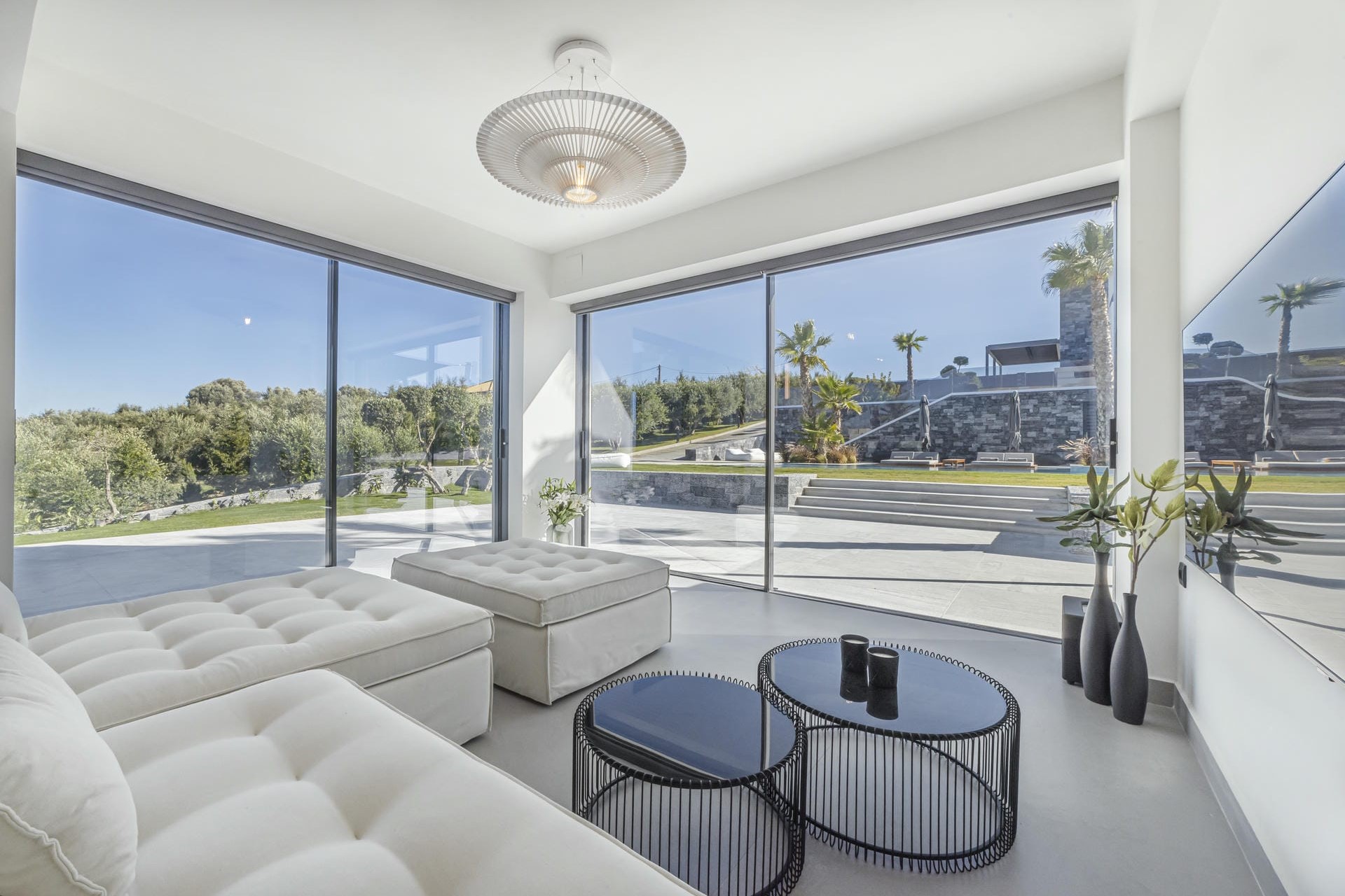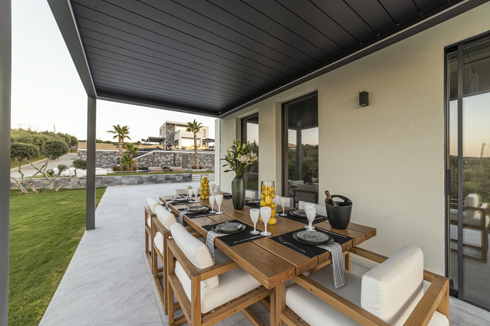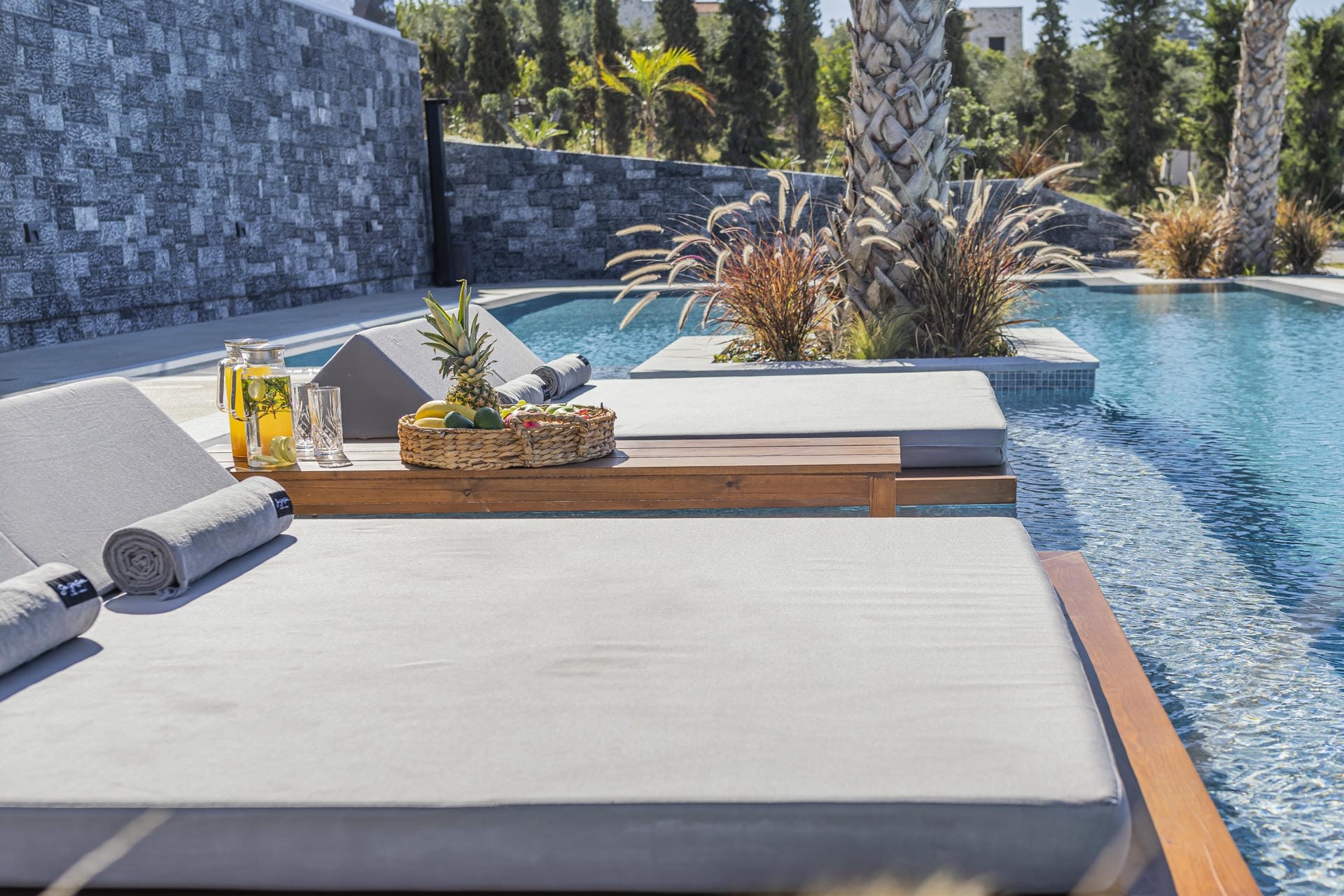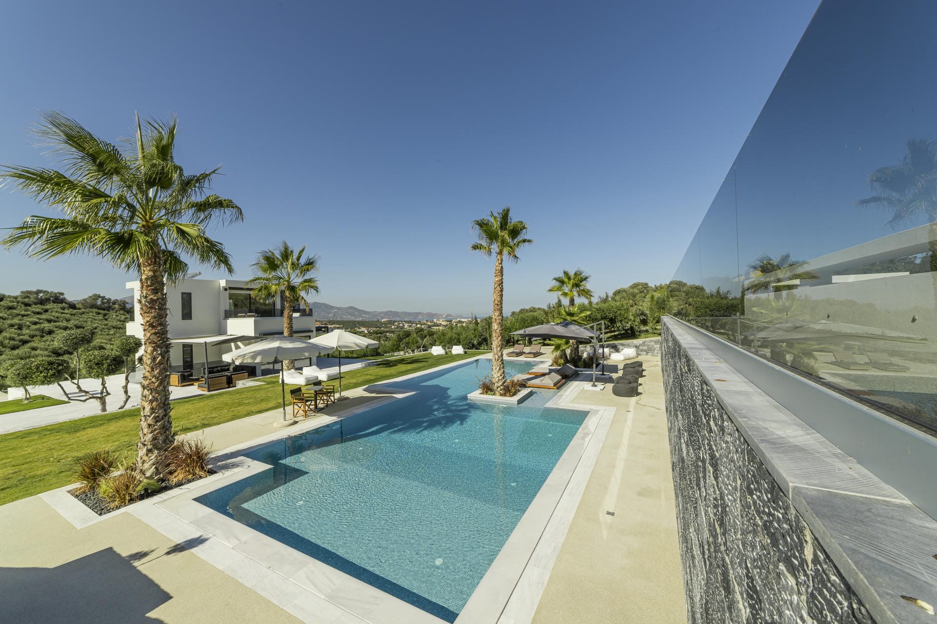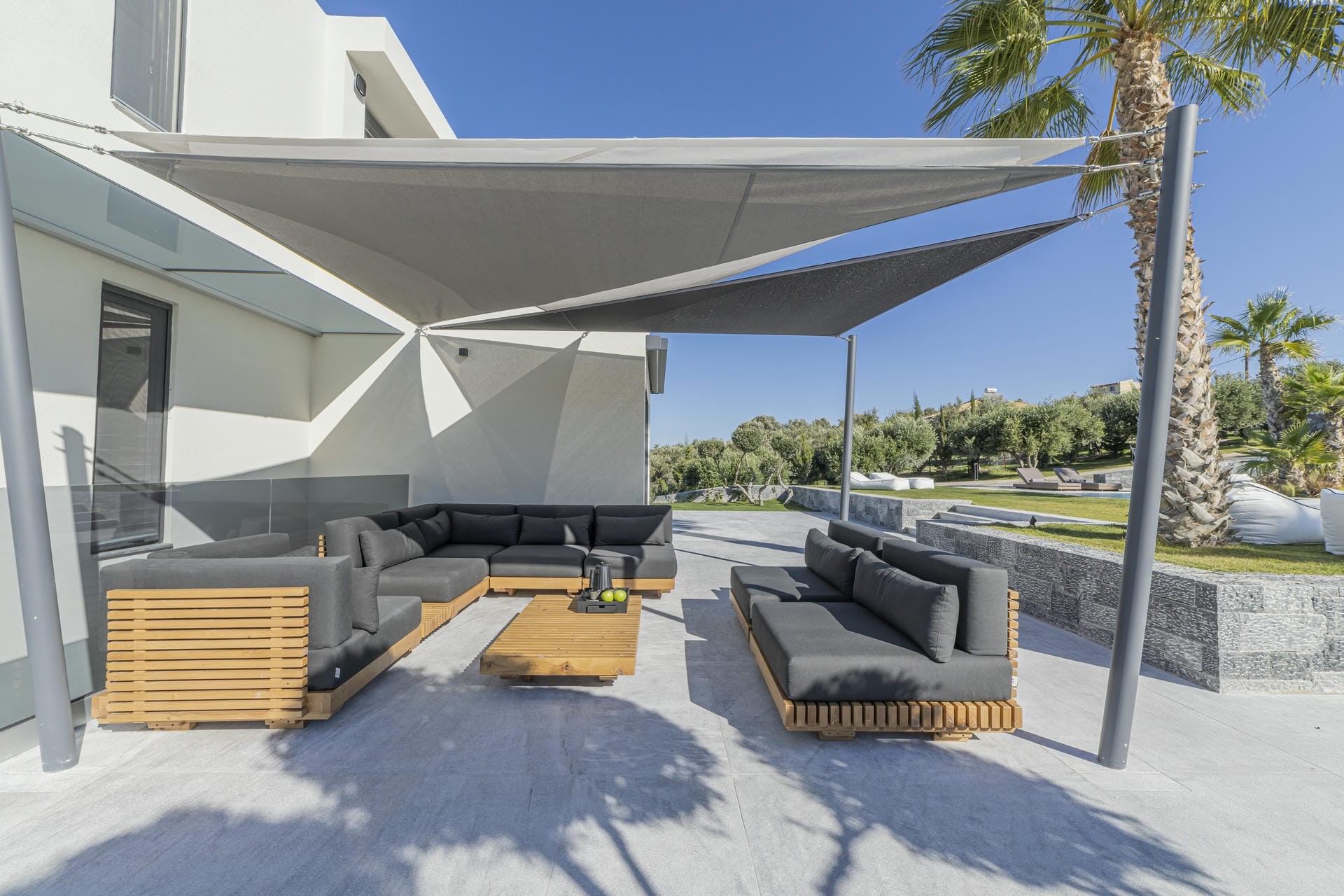 At the centre of the grounds is a generous 150-square-metre swimming pool framed by sun loungers, parasols, and over-water day beds. A Jacuzzi sits at one corner of the property, while an outdoor kitchen and two shaded dining areas invite relaxed al fresco meals overlooking the gardens. Moreover, there are plenty of quiet corners to retreat to, including a vegetable garden, pergola-shaded lounge areas, and a terrace bar for drinks after dark.