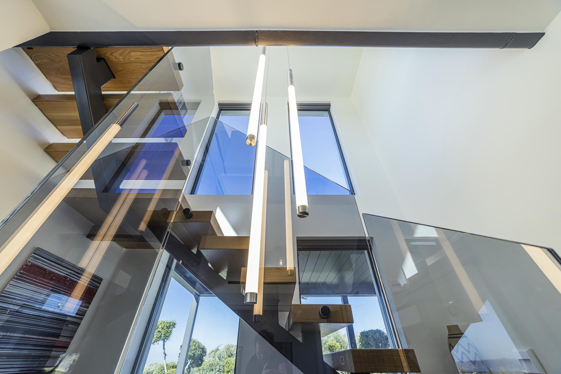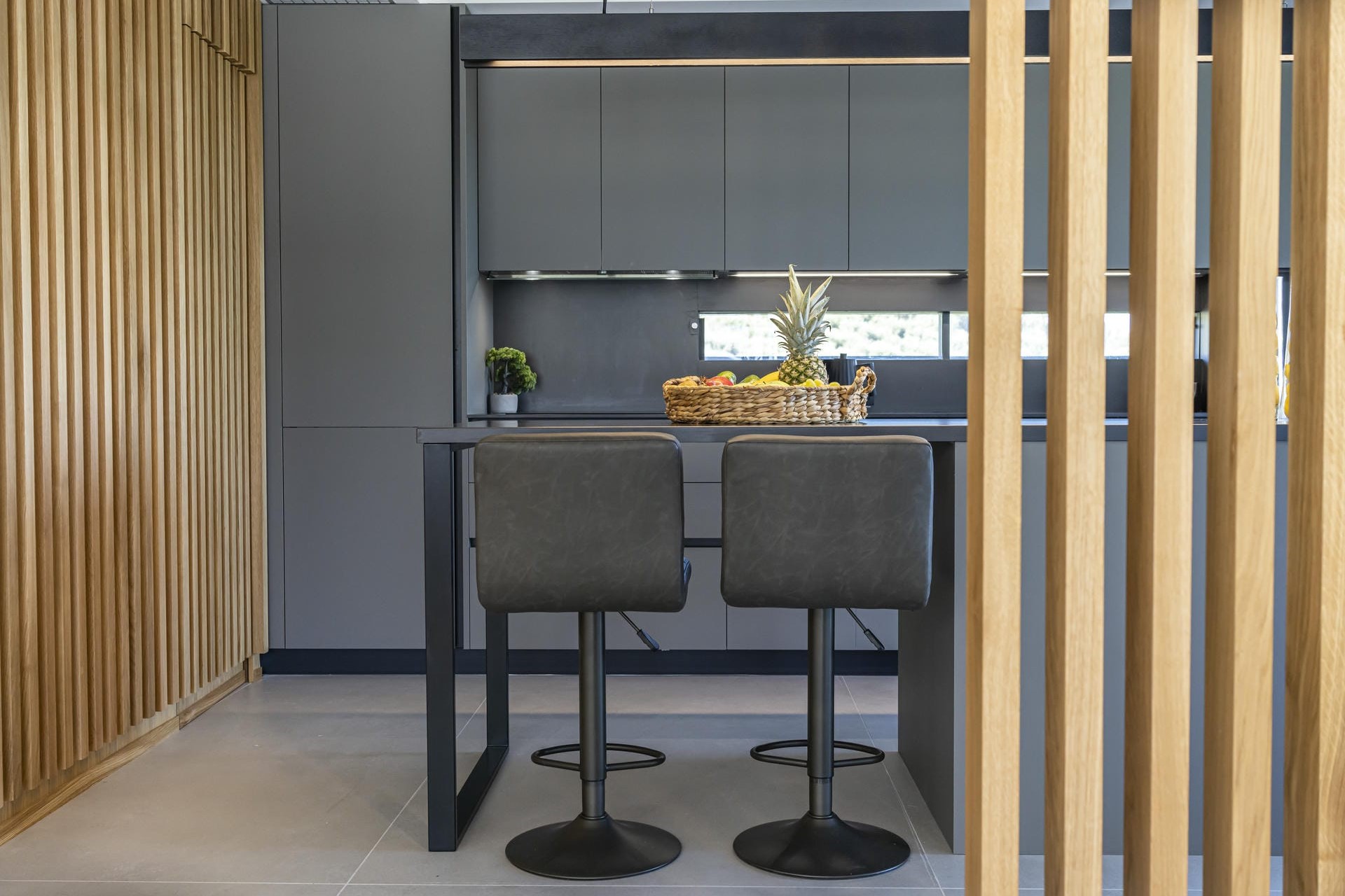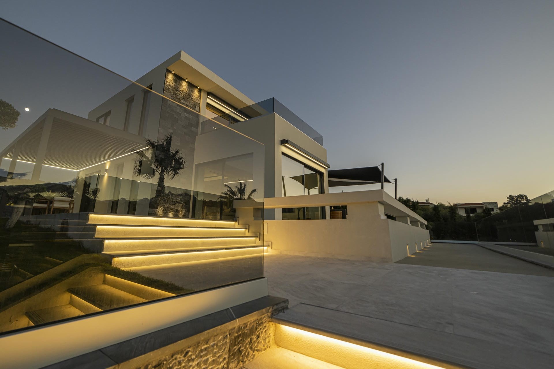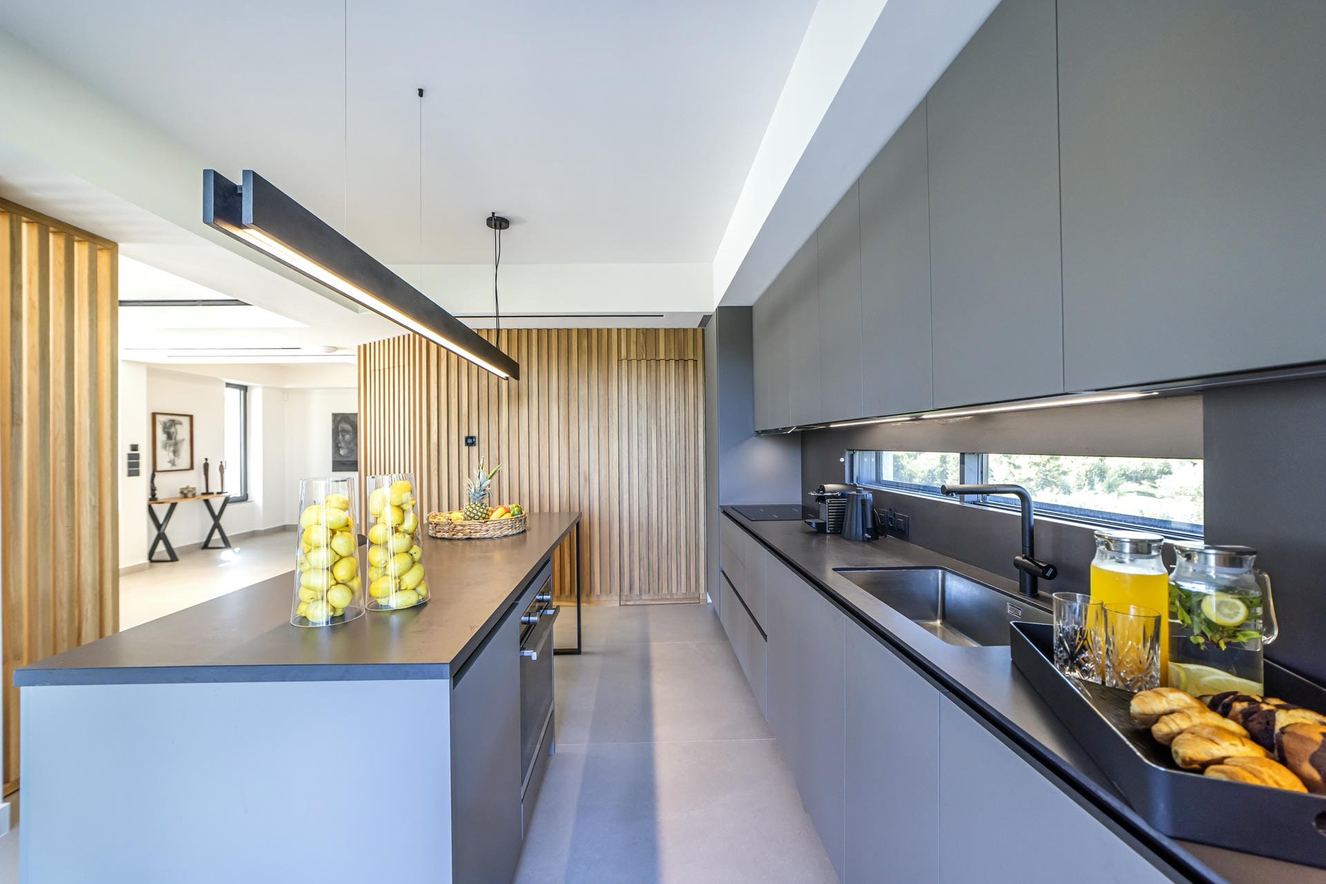 The two villas are each spread across multiple floors, combining sleek, modern interiors with original artwork by renowned Greek painter Kostas Tsolis. The living areas are open and bright, featuring clean lines and pared-back styling softened by natural materials and carefully chosen design pieces. Both villas feature their own fully equipped kitchens, lounge areas, and indoor dining spaces, providing flexibility for extended families or larger groups. Floor-to-ceiling glass in several spaces opens directly onto the terraces, allowing the outside in and keeping the spaces bright throughout the day.