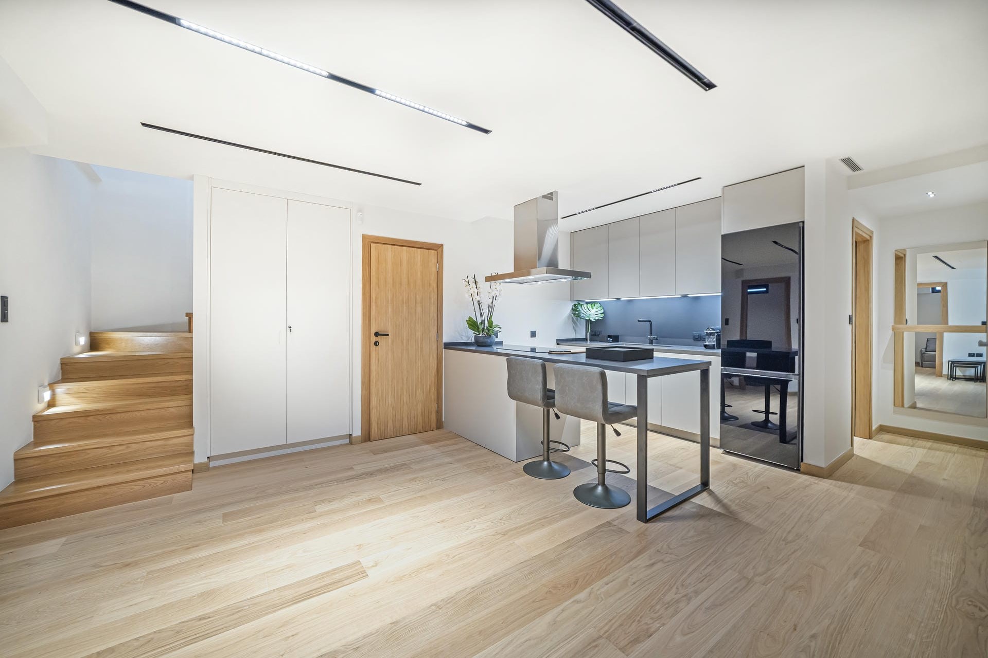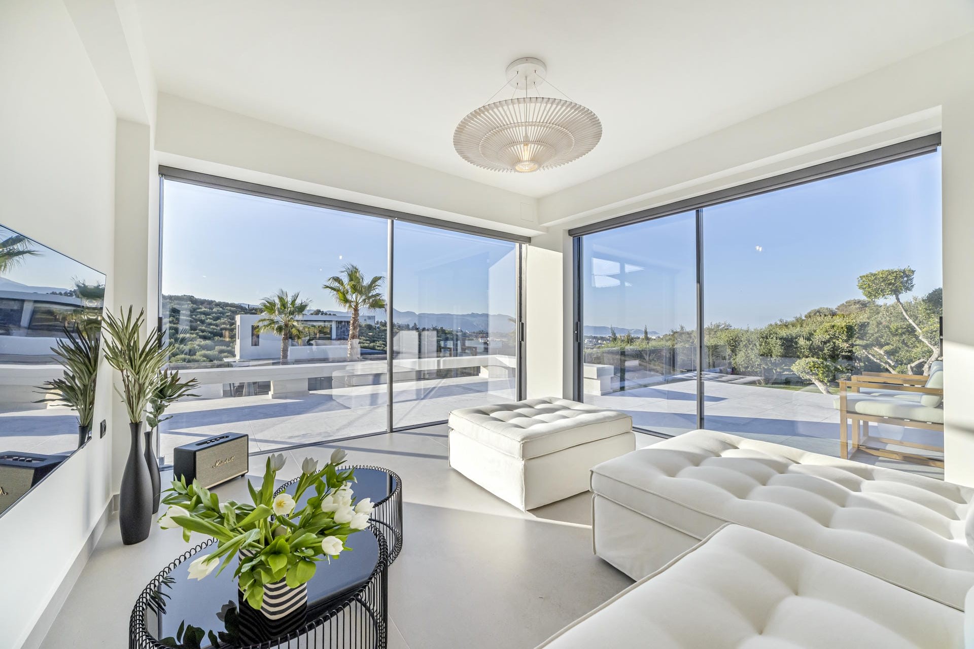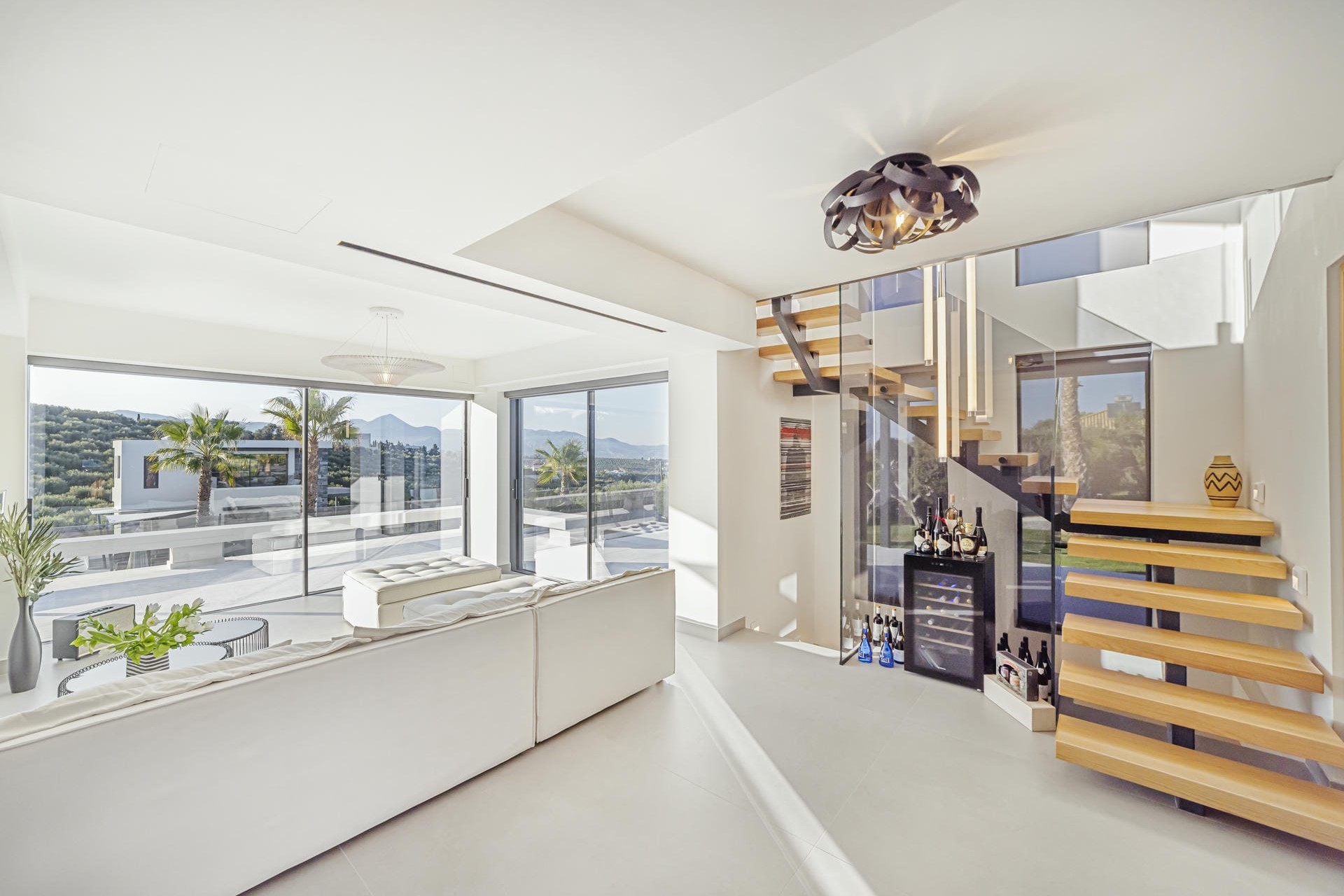 Across the two villas, there are four double bedrooms plus two optional twin rooms, perfect for children or teens. The two master bedrooms, one located in each villa, are situated on the first floor and feature private terraces, walk-in wardrobes, and en-suite bathrooms with walk-in showers. The lower-ground floor of each villa makes for an ideal family suite. It features a double room with an adjoining area that includes a single sofa bed. There’s also a separate room that’s incredibly flexible: it can be arranged as a cosy living room or transformed into another bedroom with either twin beds or one king-size bed. As these beds can be converted into sofas, they’re best suited for children or teenagers. Each of these floors also provides a kitchenette with a breakfast bar and a shared bathroom.