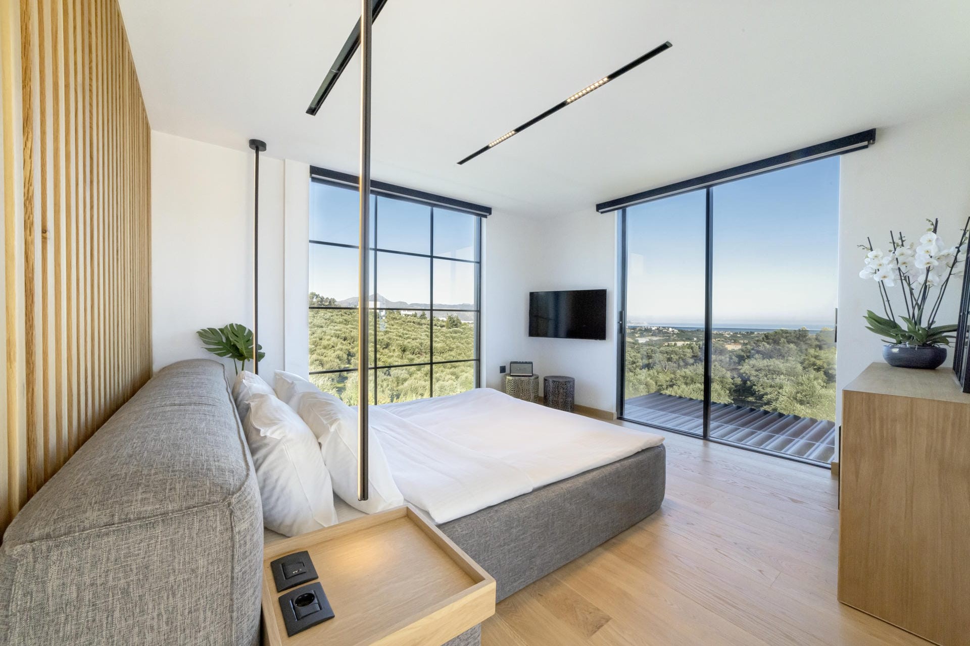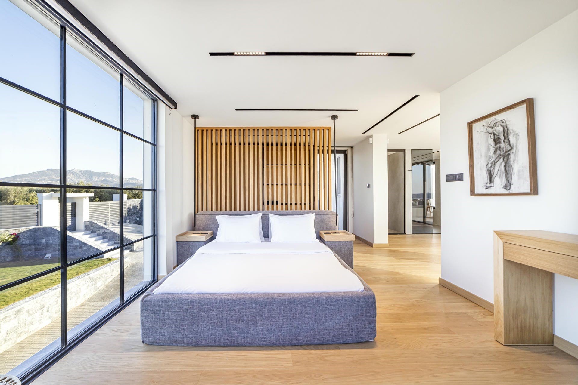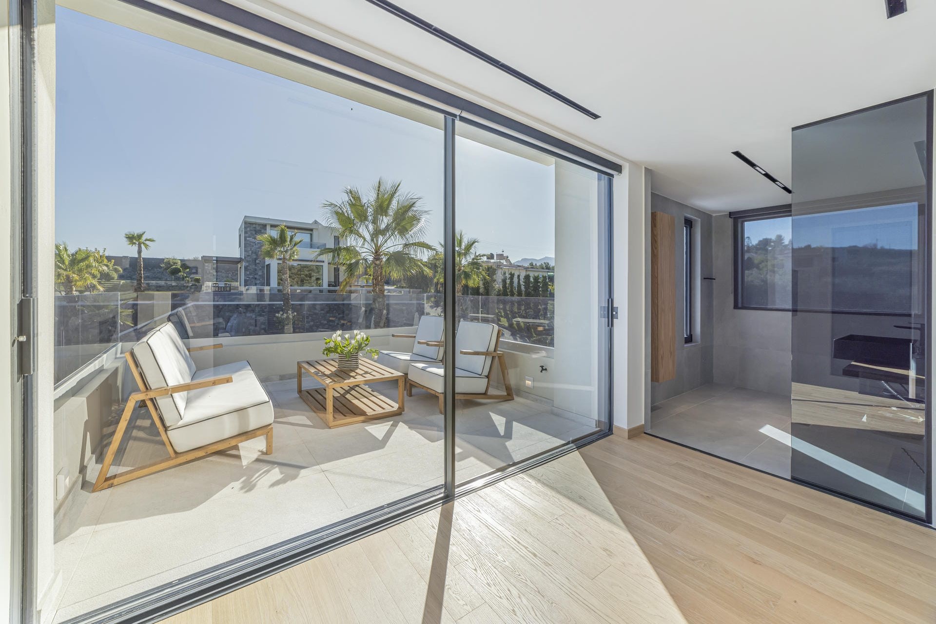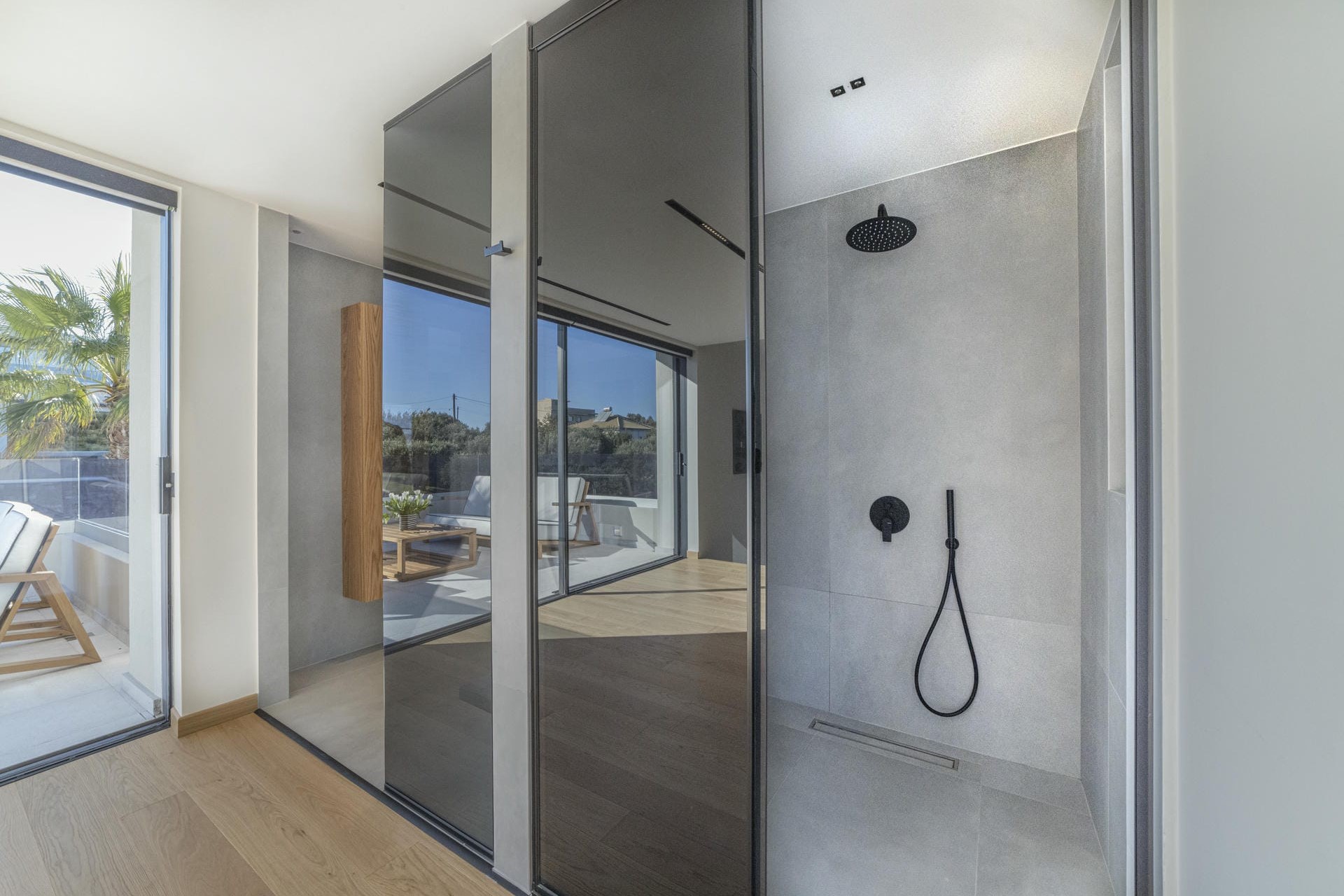 Master Bedroom – king-size bed, walk-in wardrobe, en-suite bathroom with shower, and private terrace