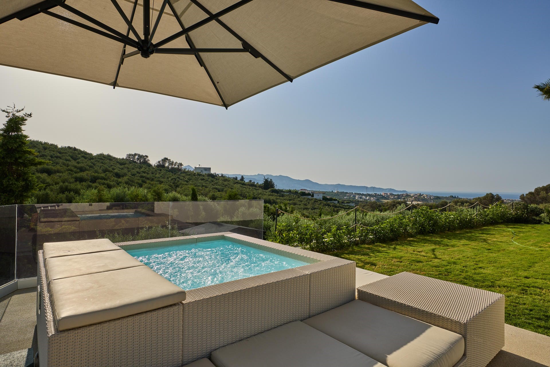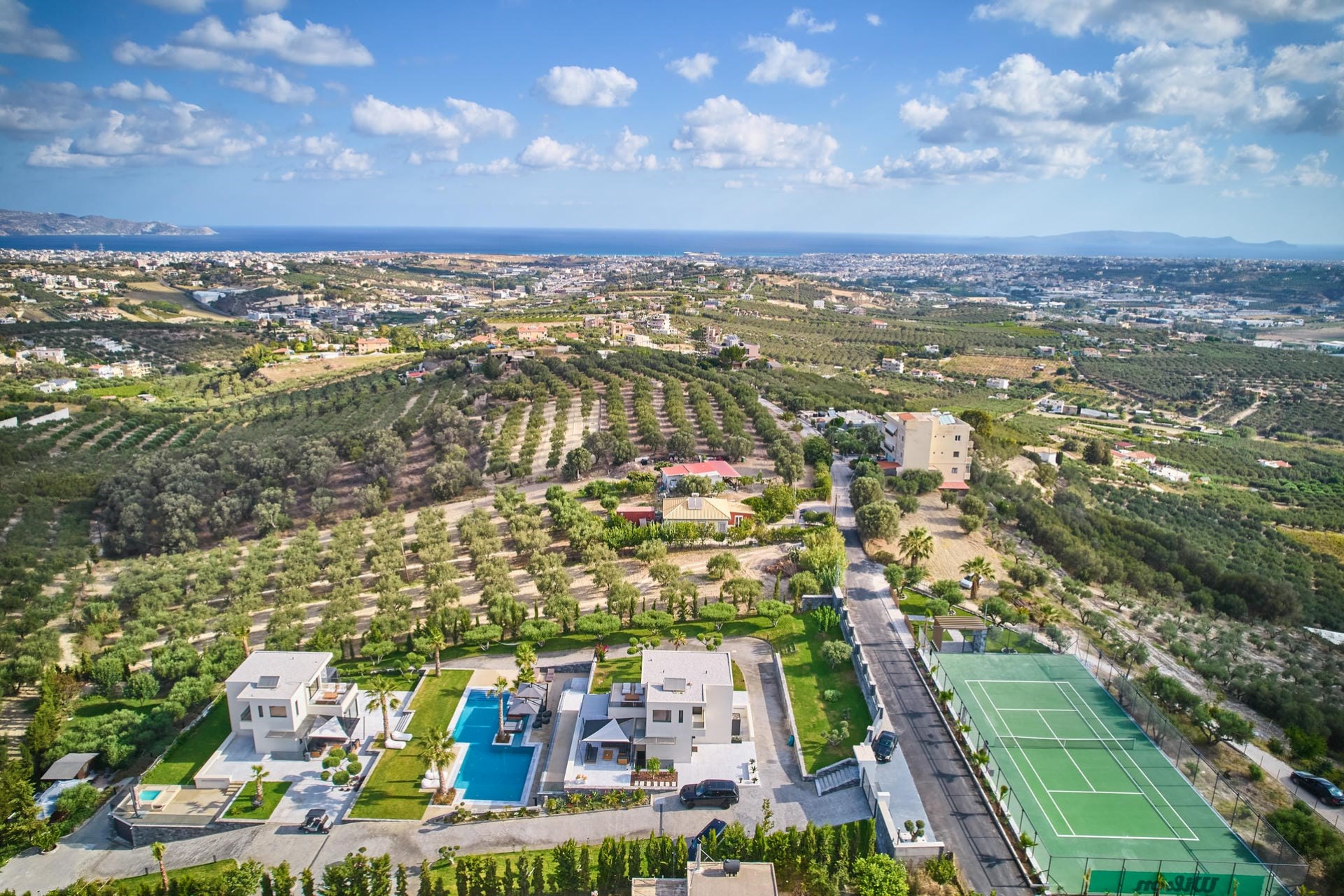 Twin villas with a private tennis court, swimming pool, and outdoor Jacuzzi surrounded by the stunning Cretan landscape