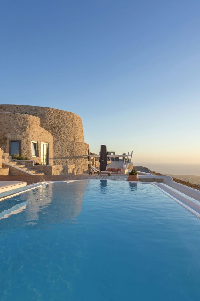 The crown jewel of the estate is the Kamini Santorini villa, a visual masterpiece that can accommodate up to 10 guests in its five bedrooms. Its stone facade seamlessly merges with its hillside surroundings, creating a truly captivating sight. This villa is a unique blend of history and modern luxury, incorporating the two original limestone kilns—built by the owner’s family over 200 years ago—into its design.