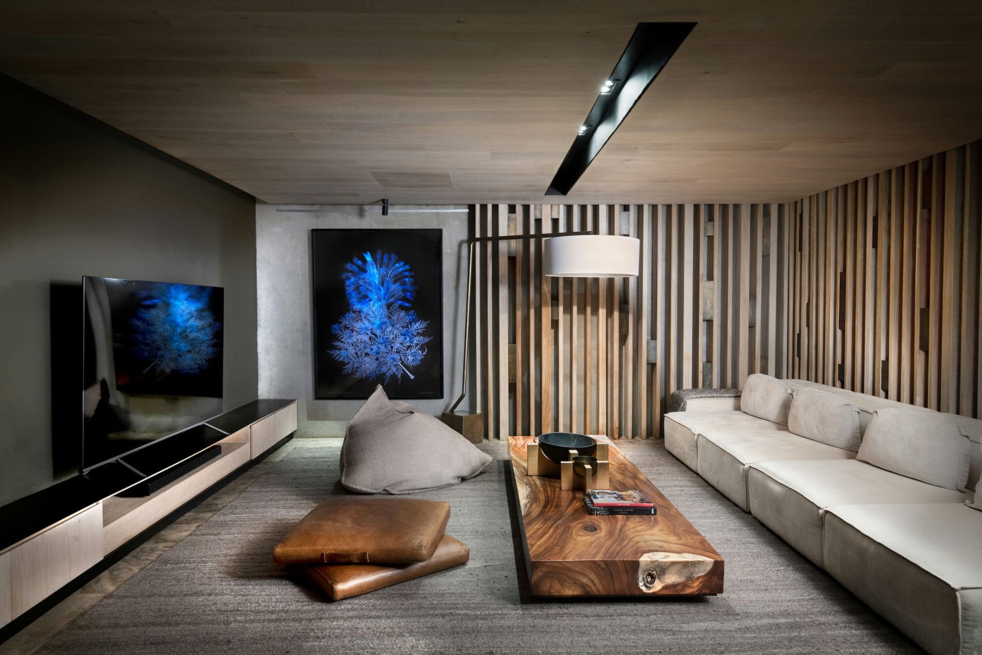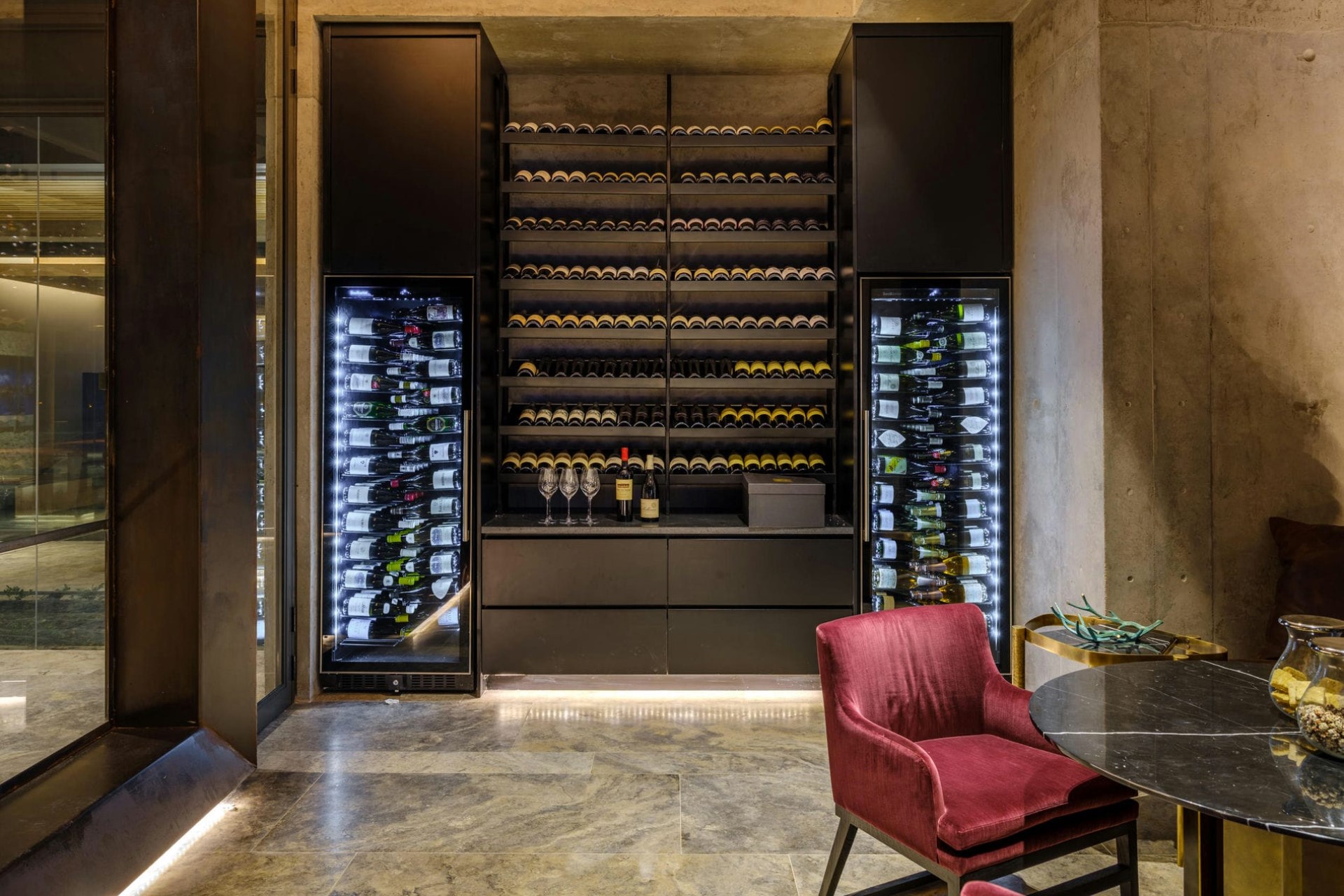 The open-plan living room comprises a large lounge area cosied around a feature fireplace and a carved, wooden dining table beneath spectacular statement lighting. A fully-equipped bar is backed by a well-stocked wine gallery, where guests can sip local tipples.