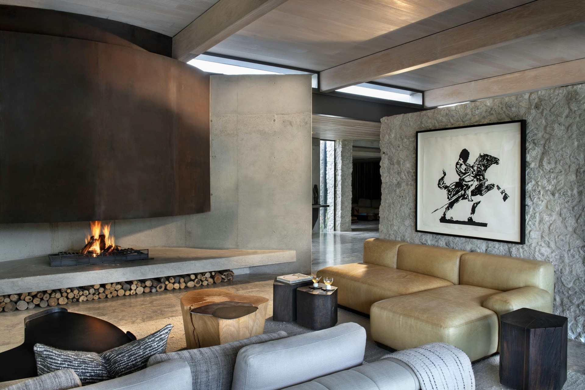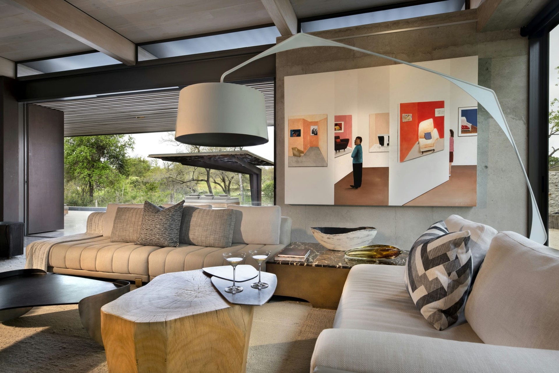 Floor-to-ceiling windows and sliding glass doors seamlessly blend the outdoor spaces with the chic interiors. Custom furniture and soft furnishings in neutral tones enhance the villa’s connection with nature, whilst statement lighting and crackling fireplaces provide a homely ambience. Beautiful modern art from notable South African painters lines the walls, and stunning bronze sculptures are artfully placed throughout.